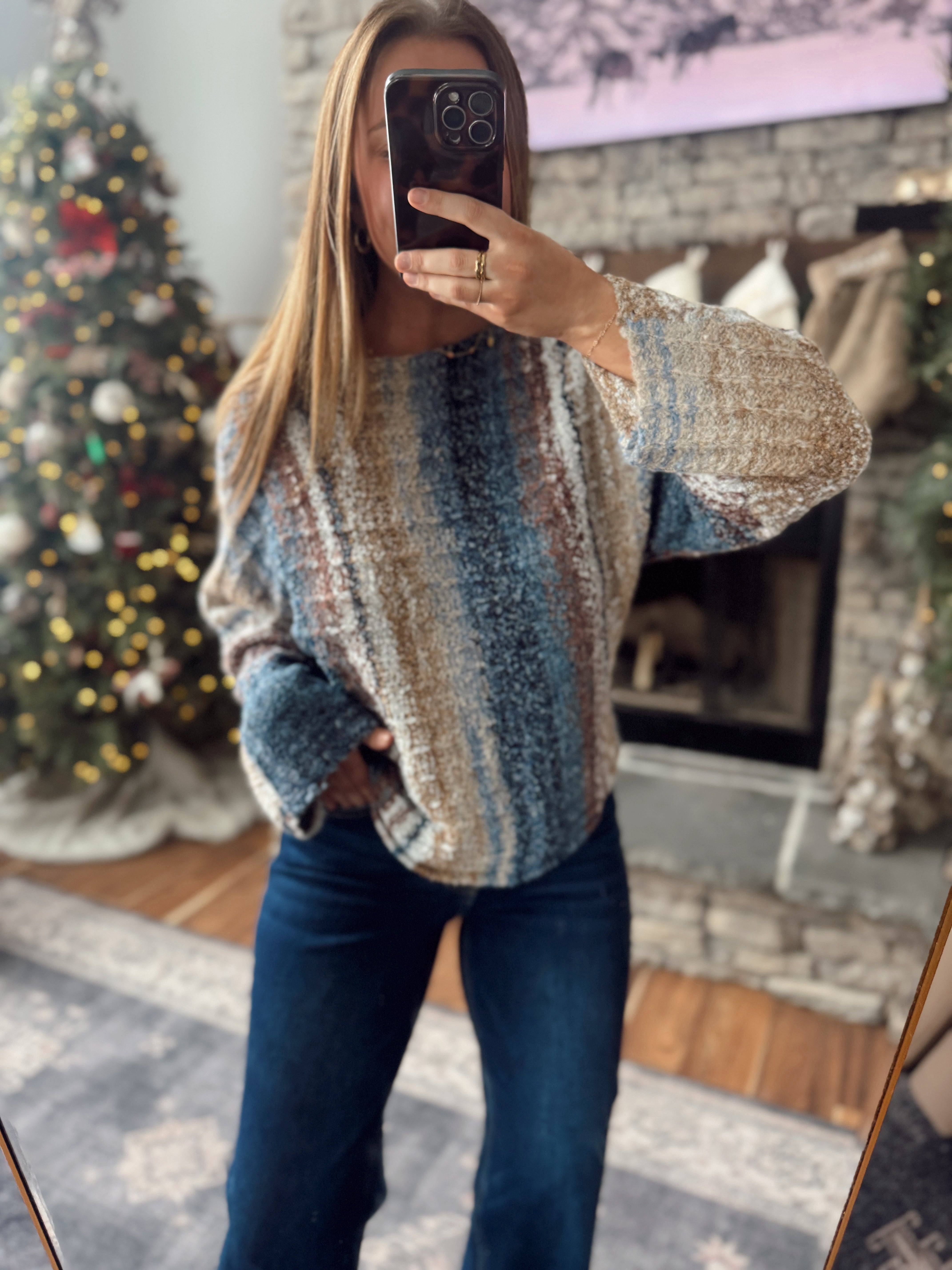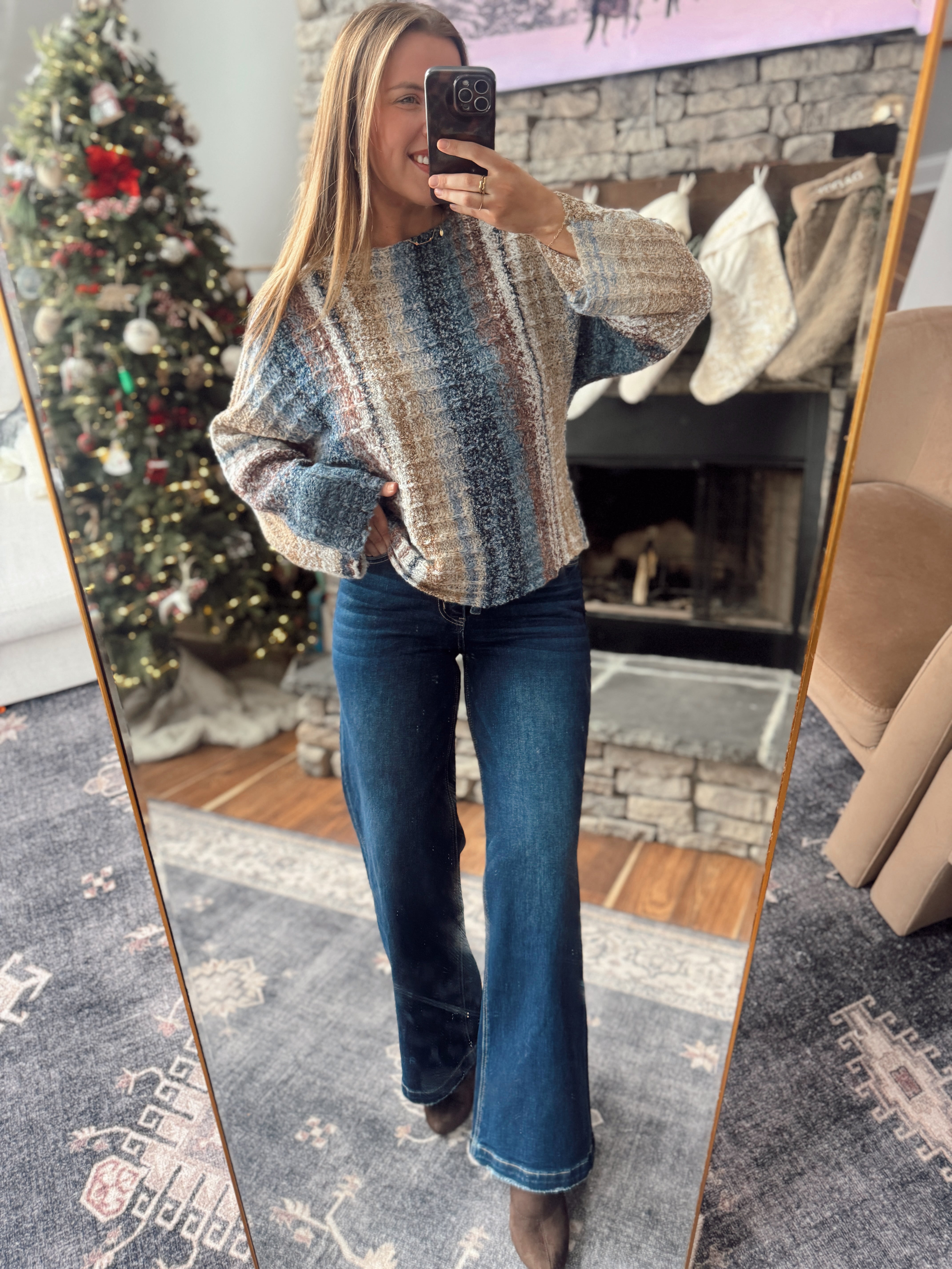 A cozy statement piece with effortless style. This soft textured knit top features multi-tone vertical striping, a relaxed fit, and slightly cropped length that pairs perfectly with high-rise denim. Comfortable, flattering, and easy to wear all season long.