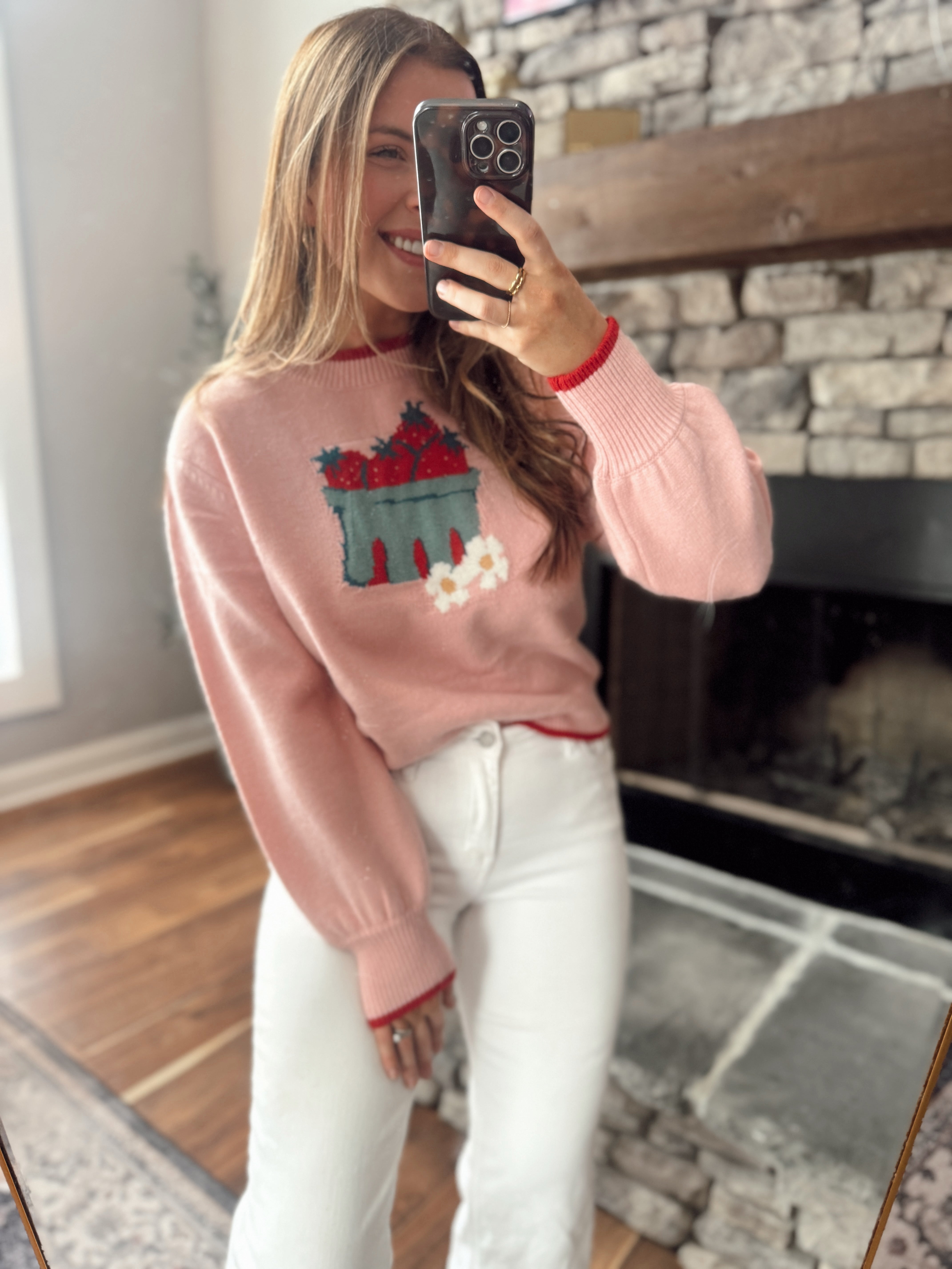 A soft blush knit with a vintage-inspired strawberry basket graphic, finished with subtle red contrast trim for that extra pop. Cozy, lightweight, and easy to style — it’s one of those pieces that makes an outfit feel special without trying too hard.