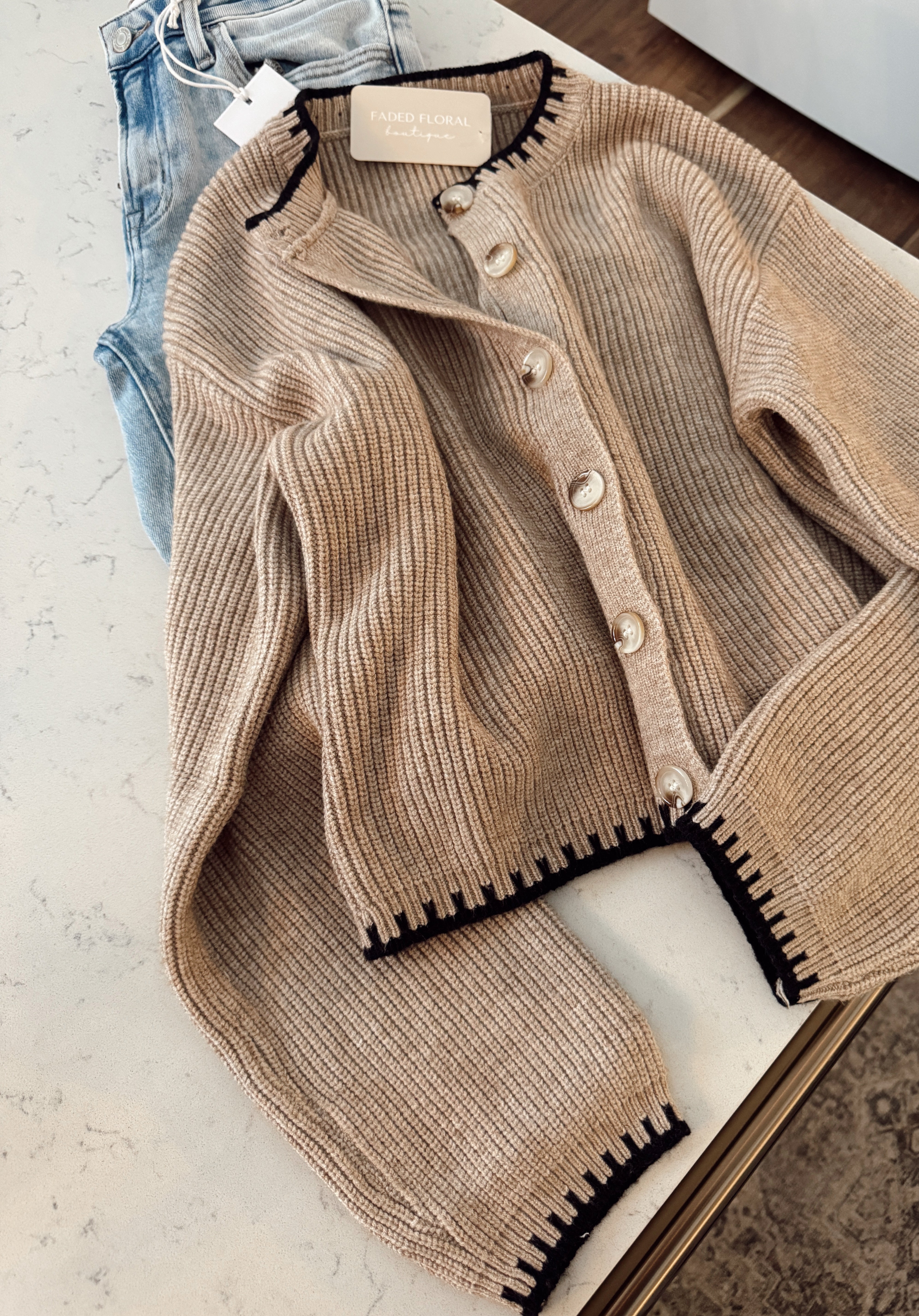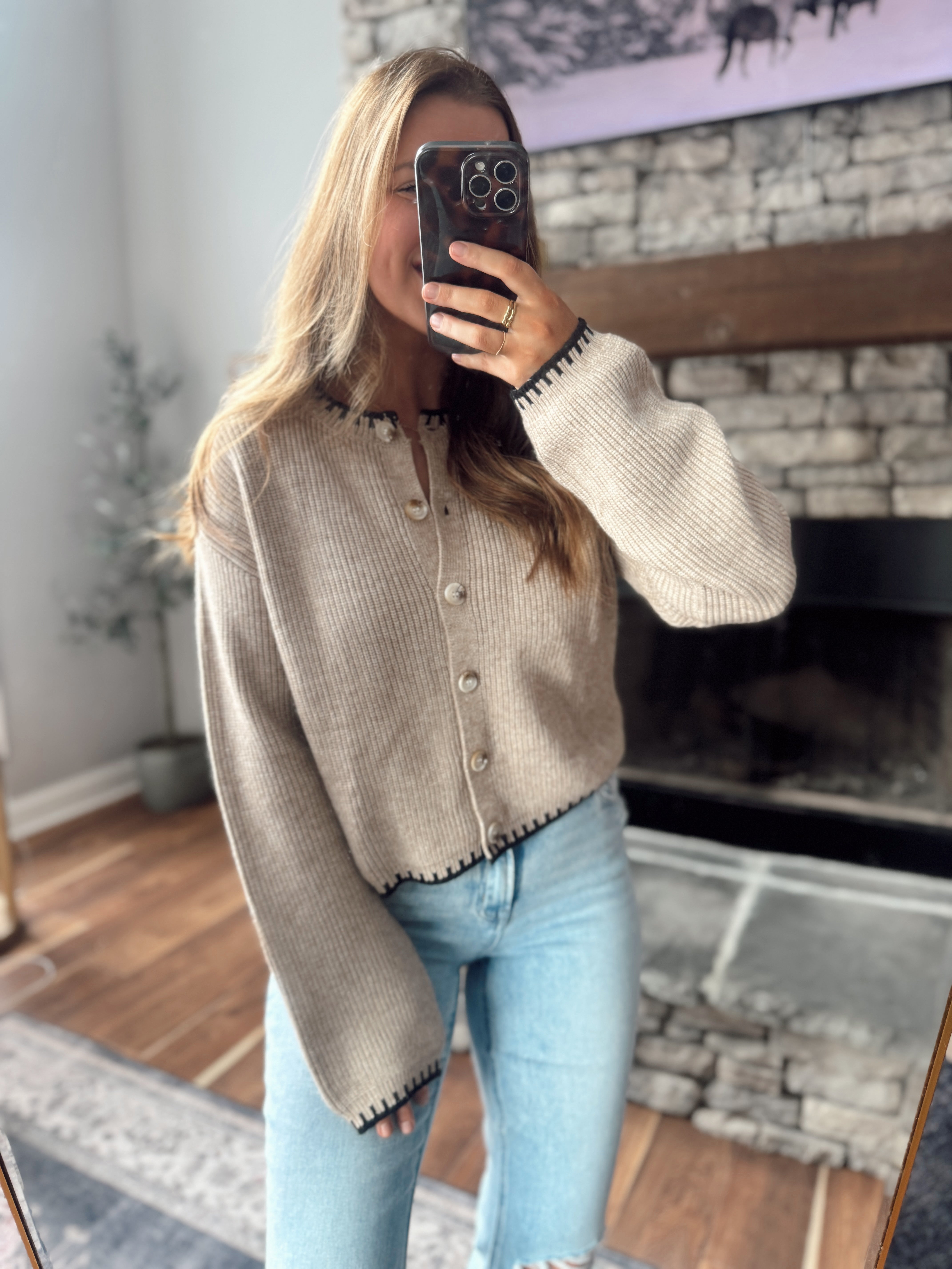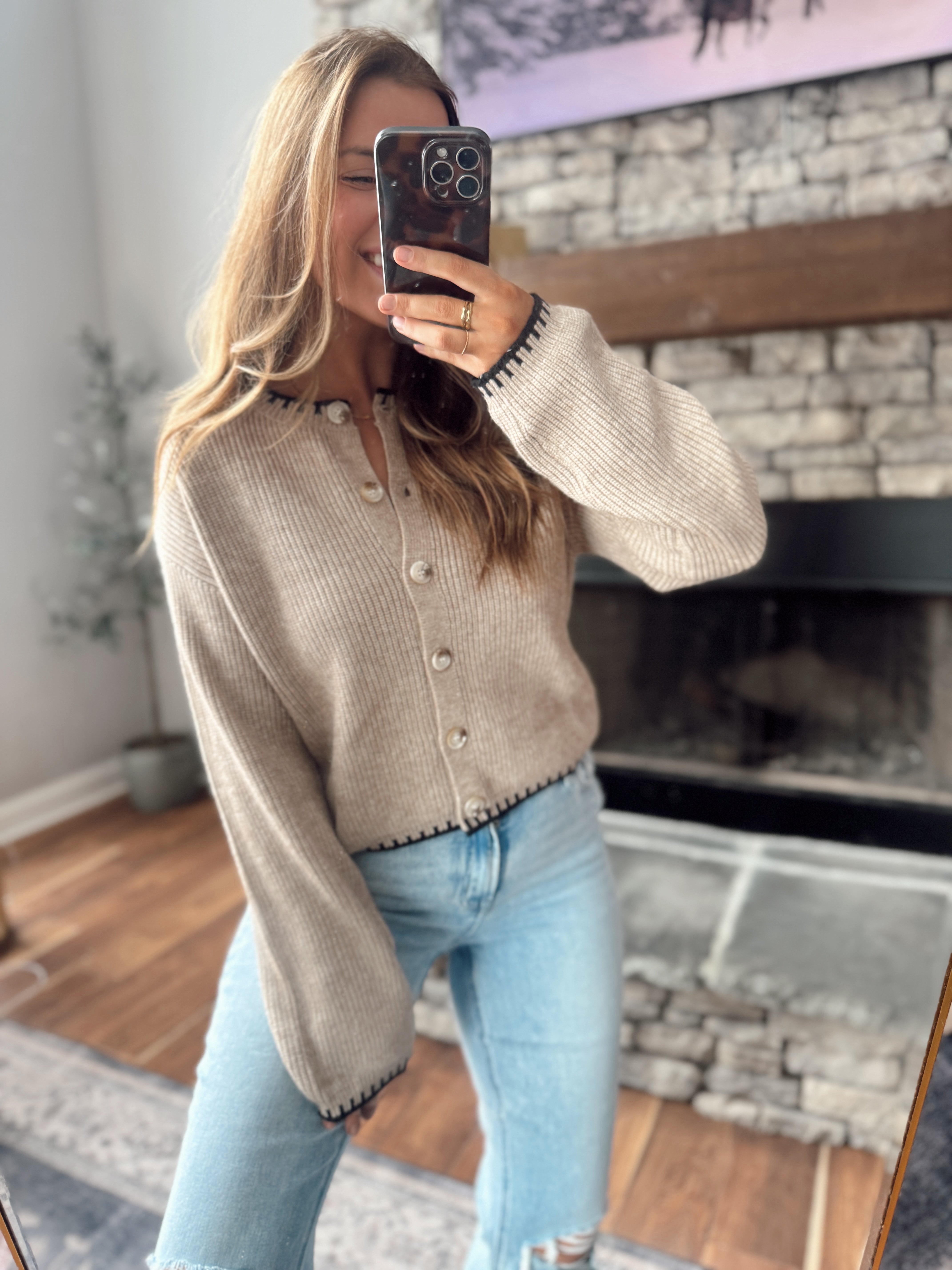 Made from a super soft ribbed knit, this piece features a flattering button-front design with subtle contrast stitch edging along the neckline, cuffs, and hem for a boutique-finished look. The fit is relaxed but polished, making it perfect worn buttoned as a top or layered open.