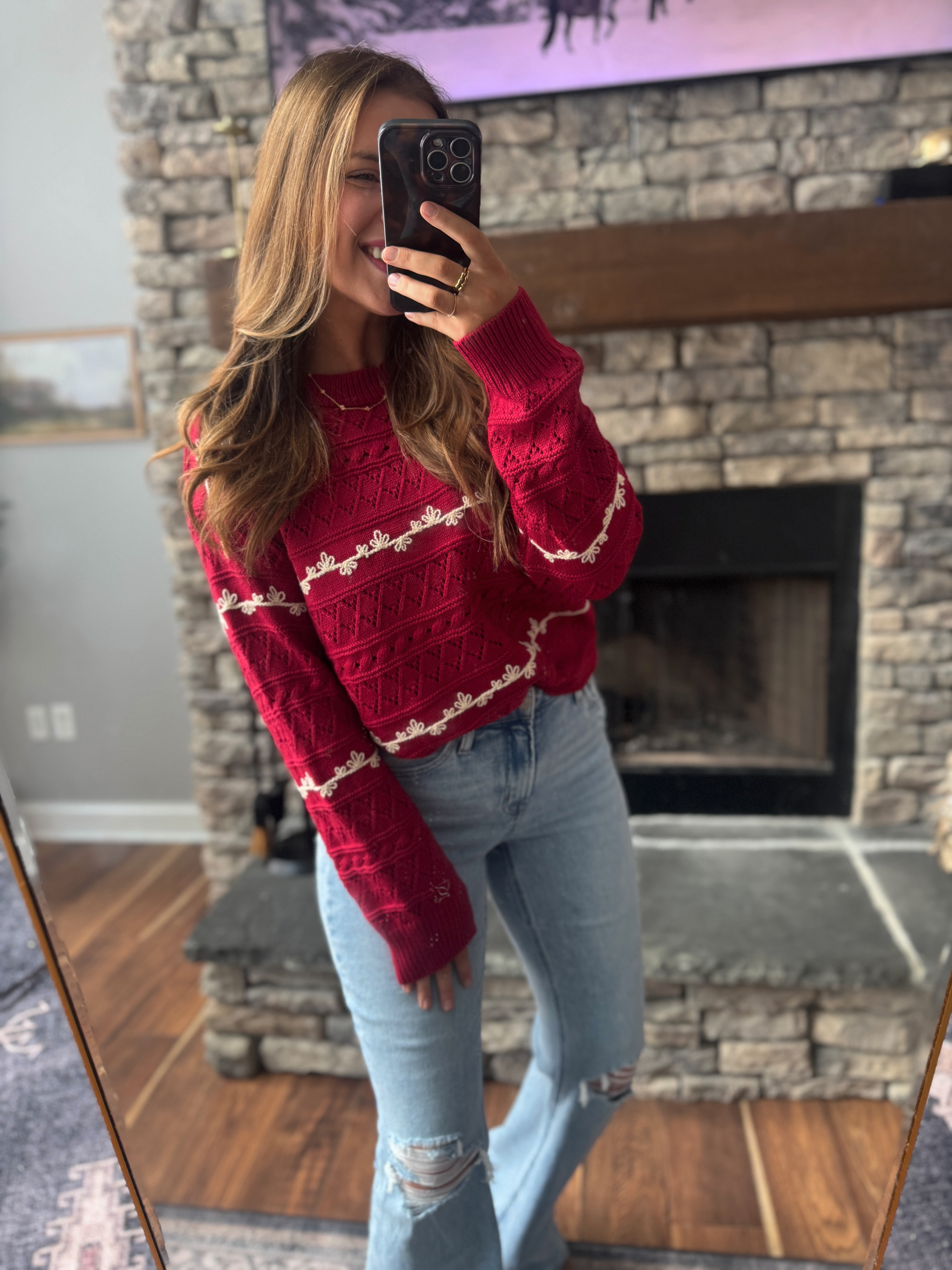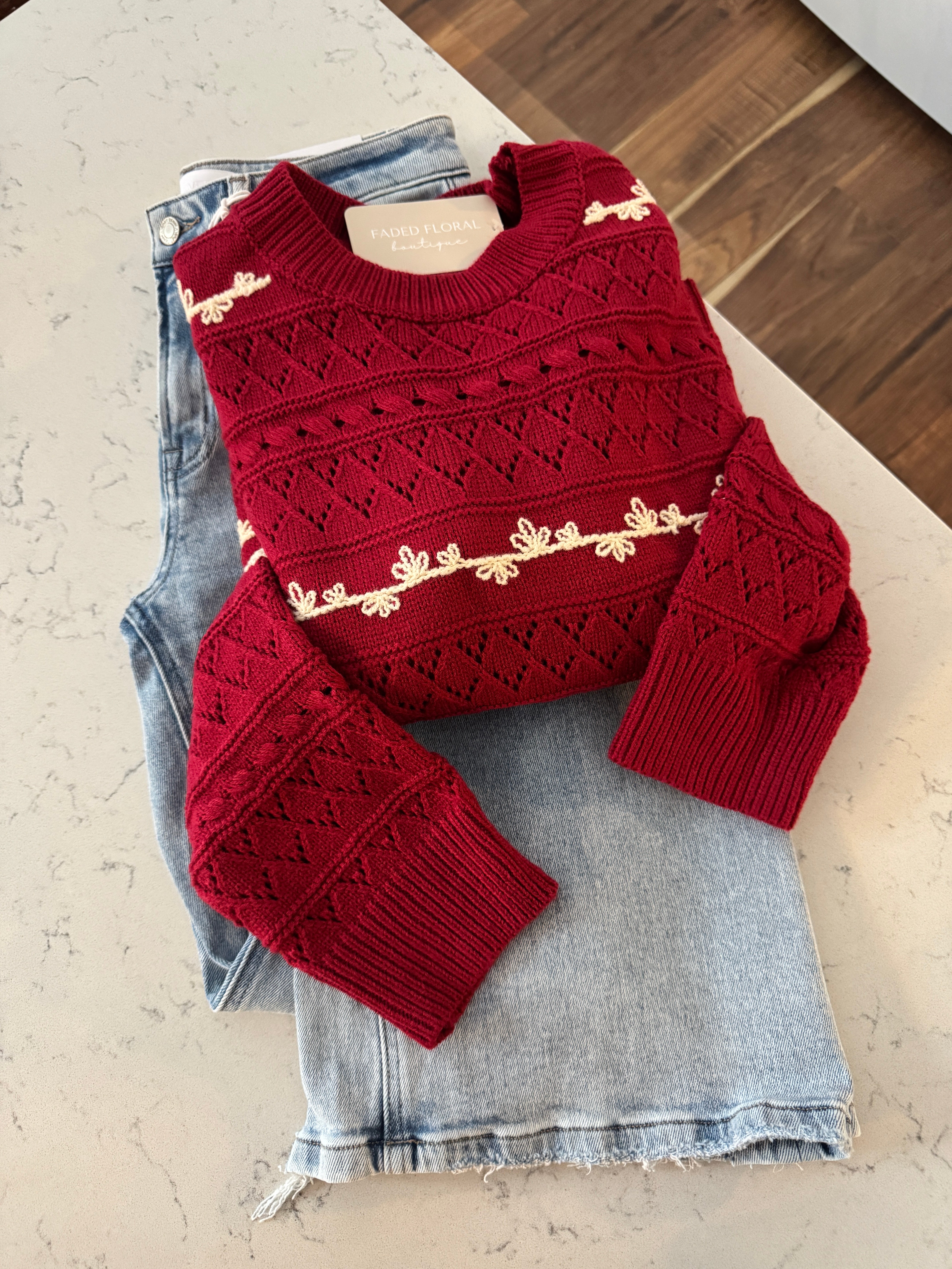 Cranberry Flower Embroidered Pointelle Sweater