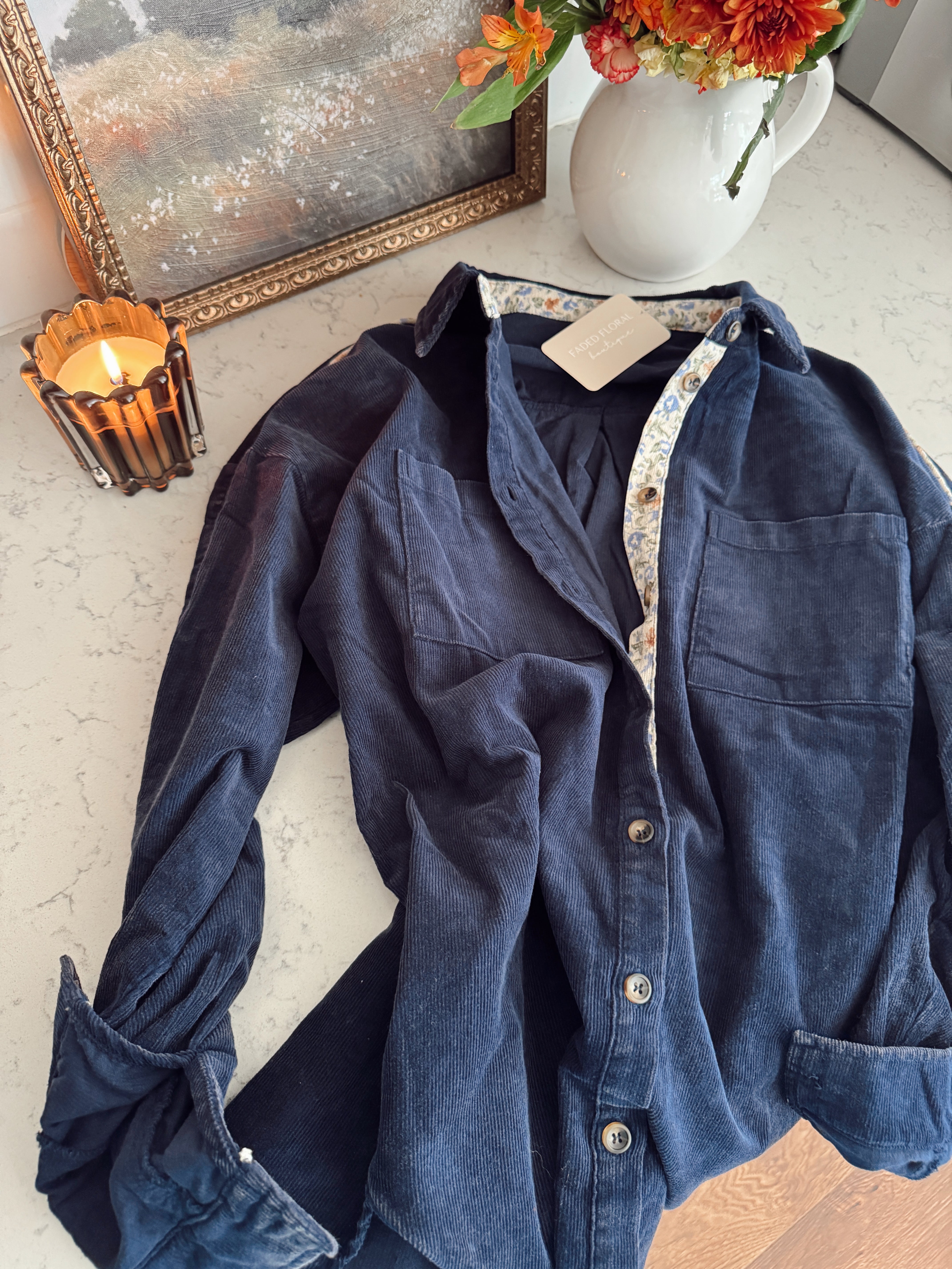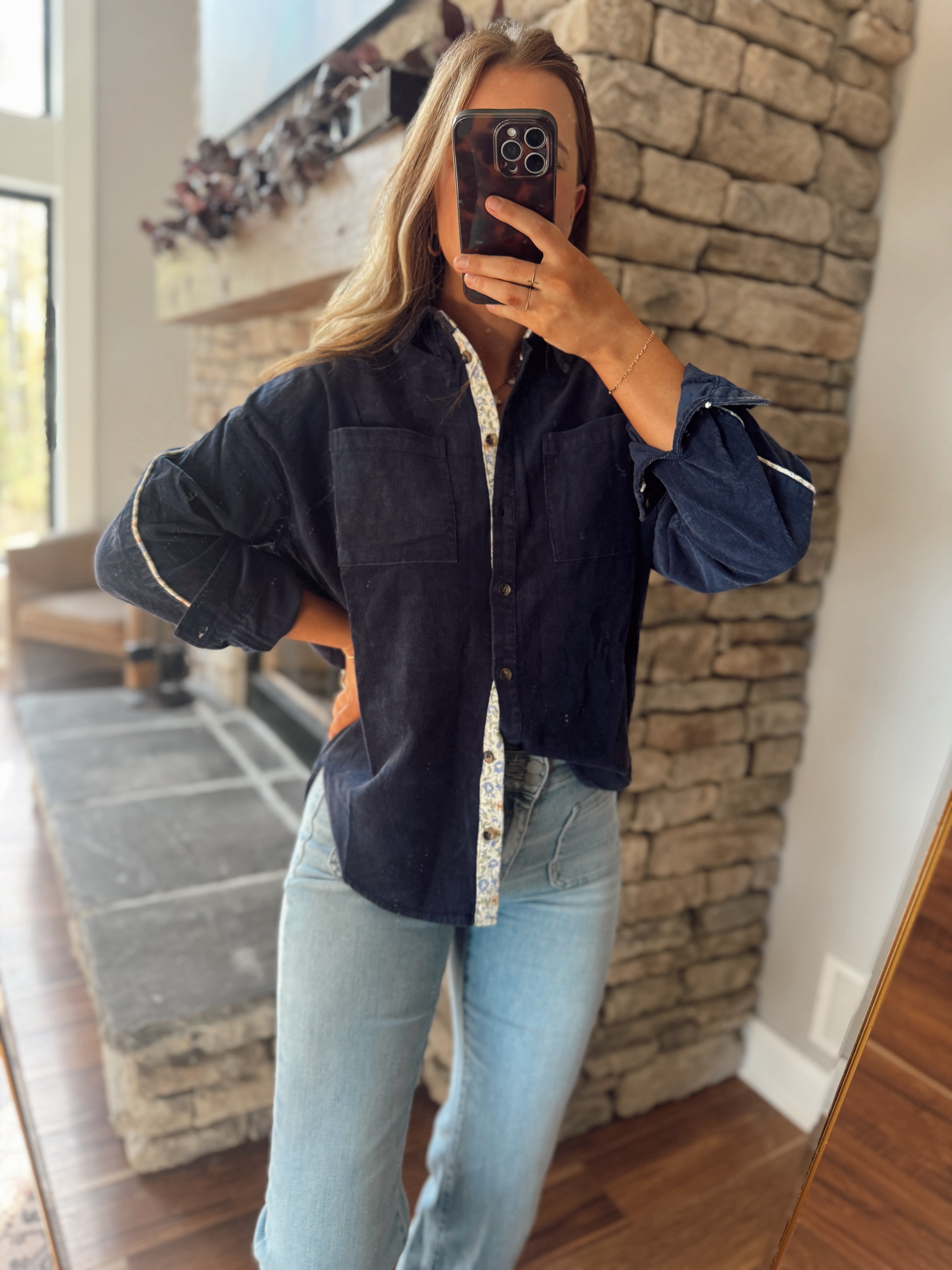 Navy Shadow Bloom Button Down Top