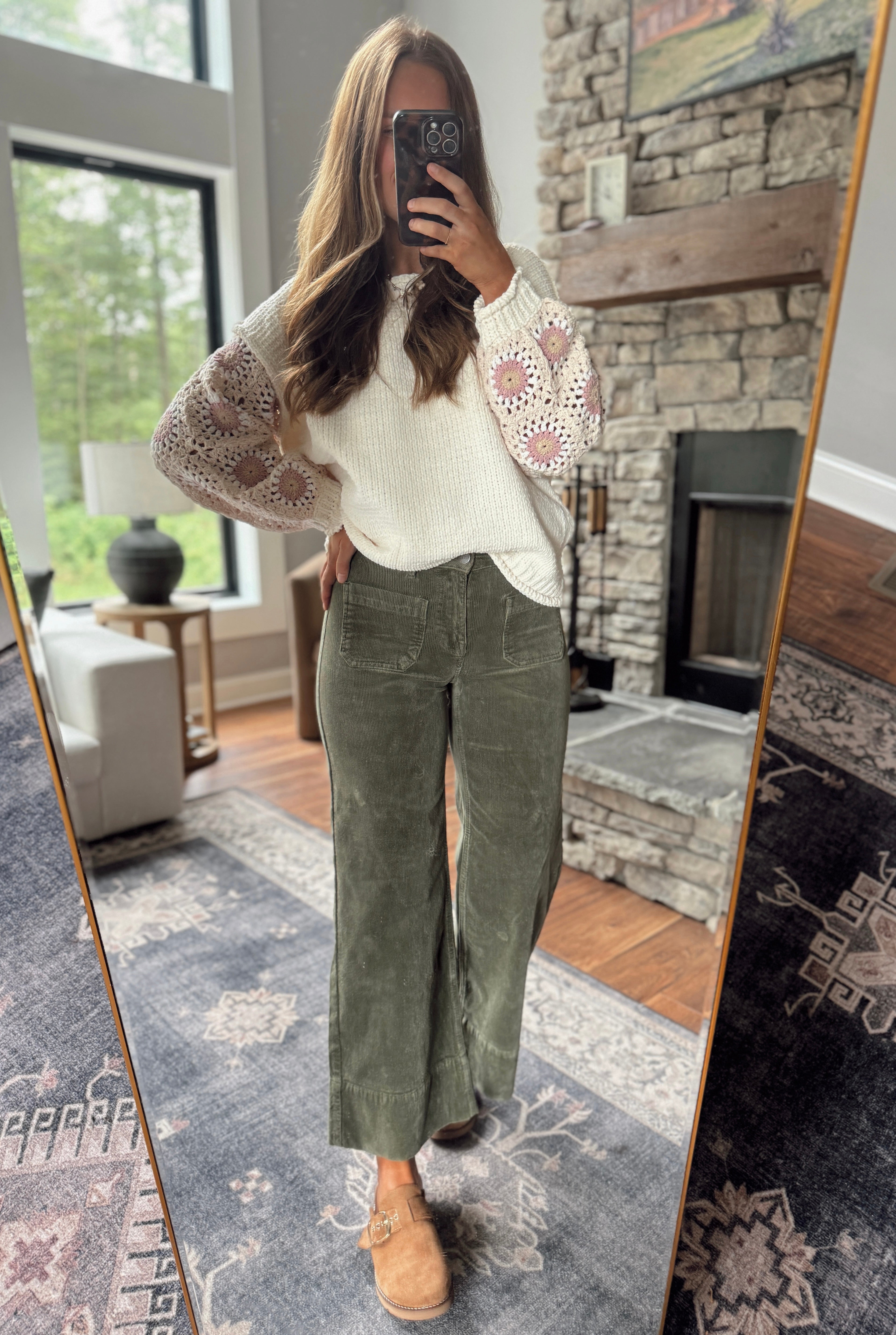 High rise, crop wide leg corduroy pant with patch pockets. Runs slightly generous — recommend sizing down one size. Soft stretch corduroy holds at the waist and relaxes through hips and thighs.