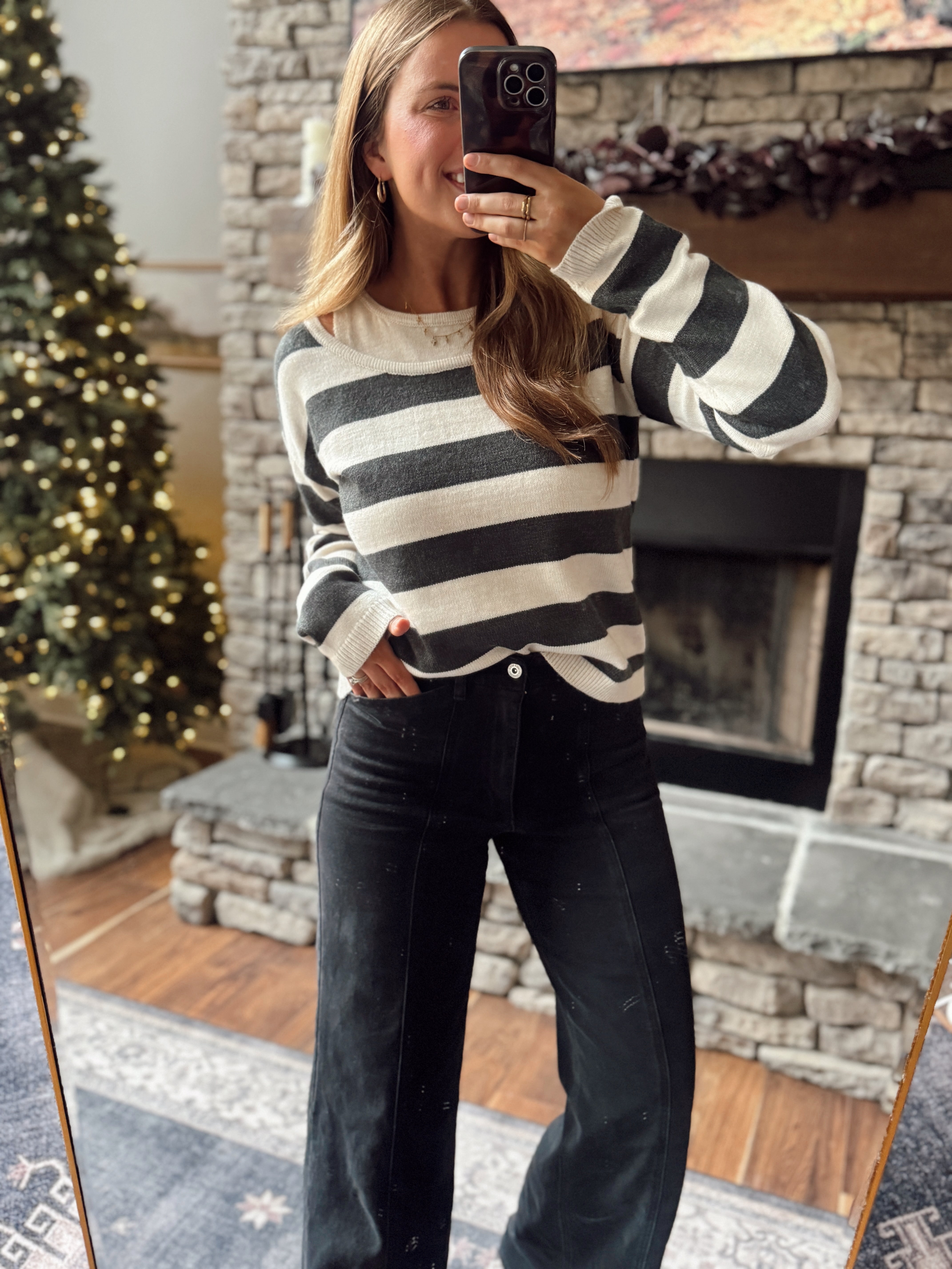 This striped sweater top features a clever faux double-layer design, giving you that trendy peek of an underlayer while keeping things sleek and easy. The soft knit fabric drapes beautifully and pairs perfectly with denim or trousers for a casual-chic vibe.