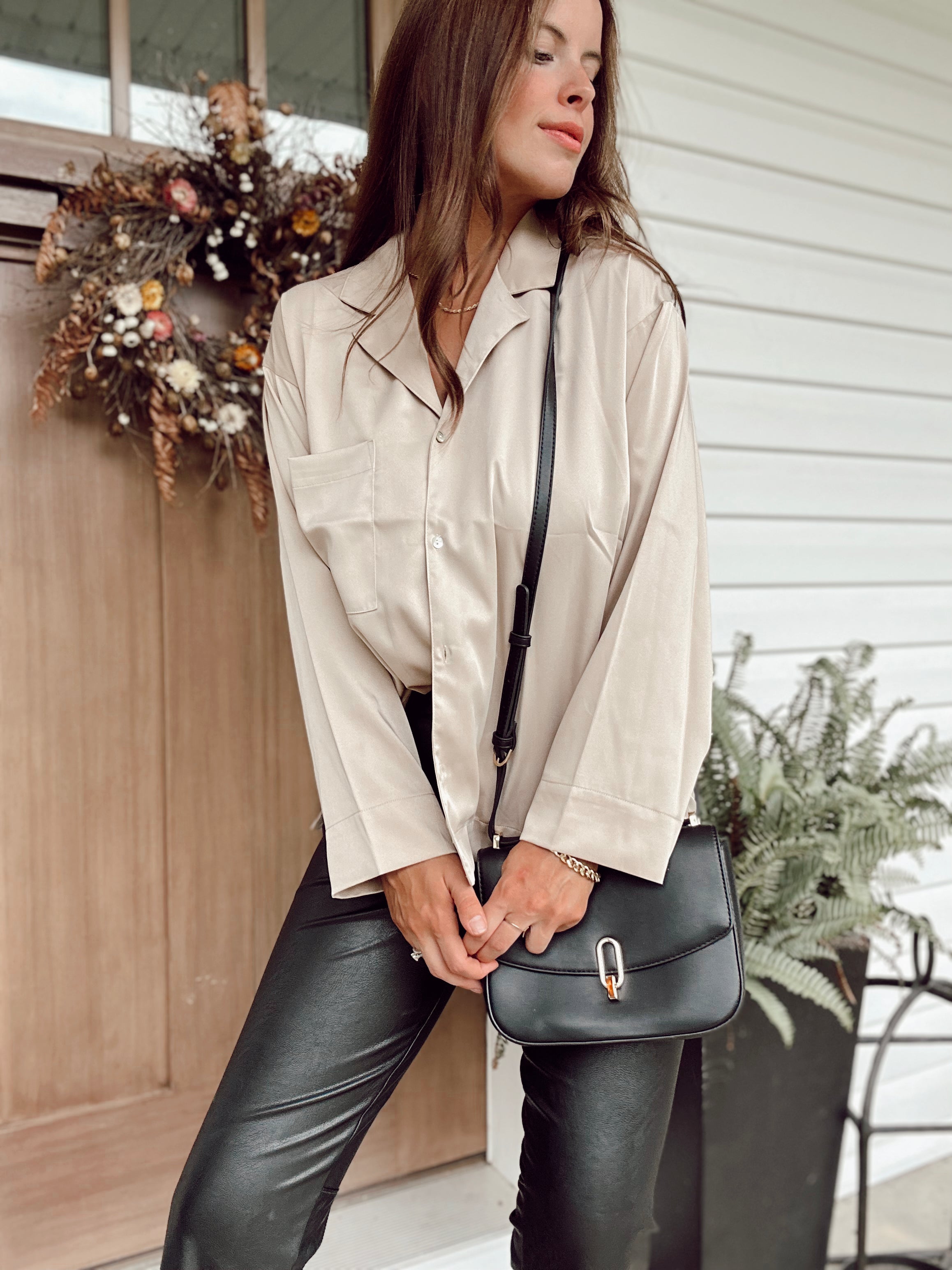 Everyone absolutely needs a satin top for the upcoming season! A classic piece and the satin will level up your outfit. Oversized fit - can size down.