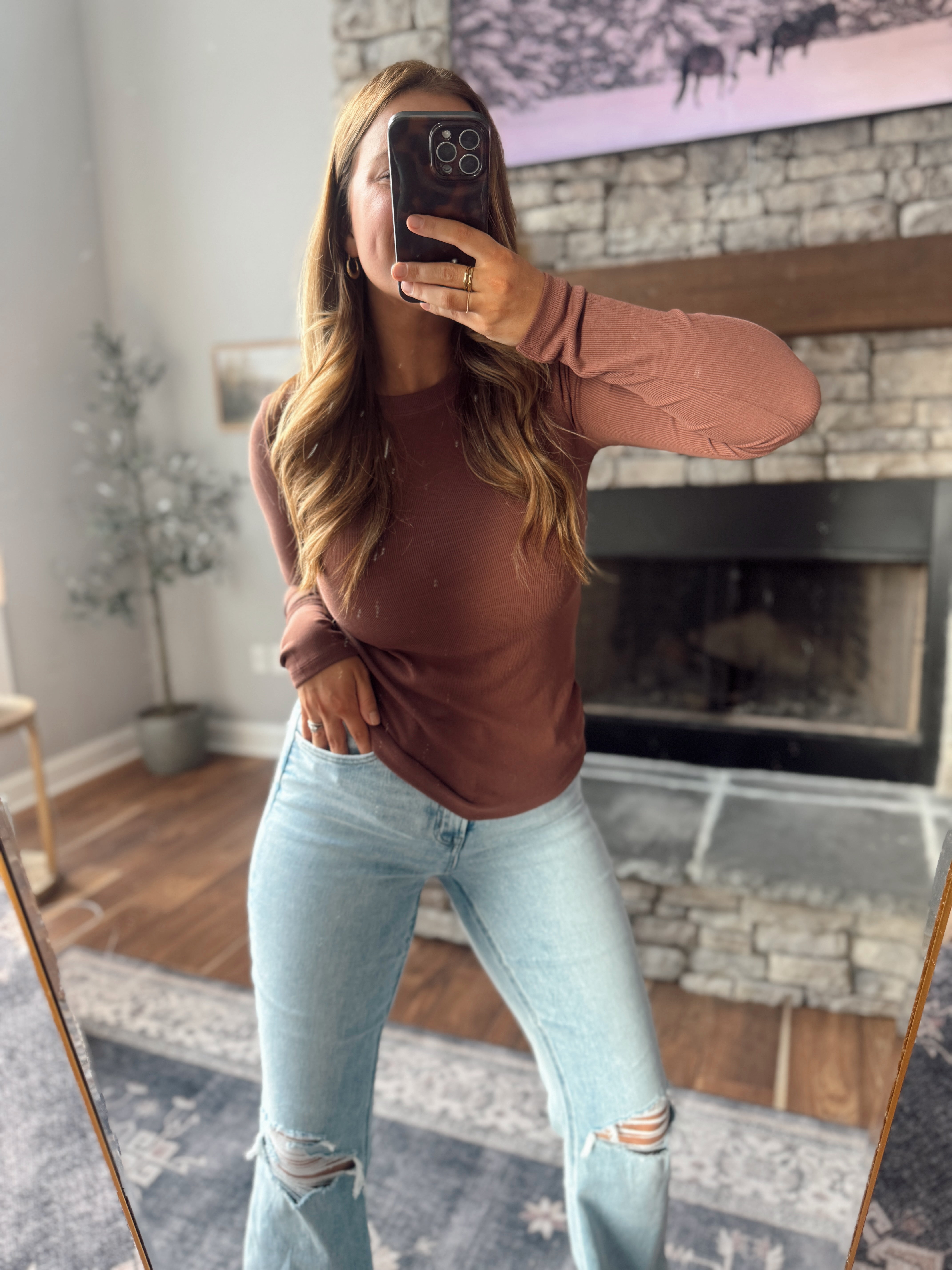 Made from a soft ribbed knit with just the right amount of stretch, this long sleeve hugs without clinging and lays smoothly under jackets, shackets, or sweaters. The fit is clean and feminine, making it just as good worn solo as it is layered. This is the kind of basic you grab in multiples—because once you wear it, you’ll get it.