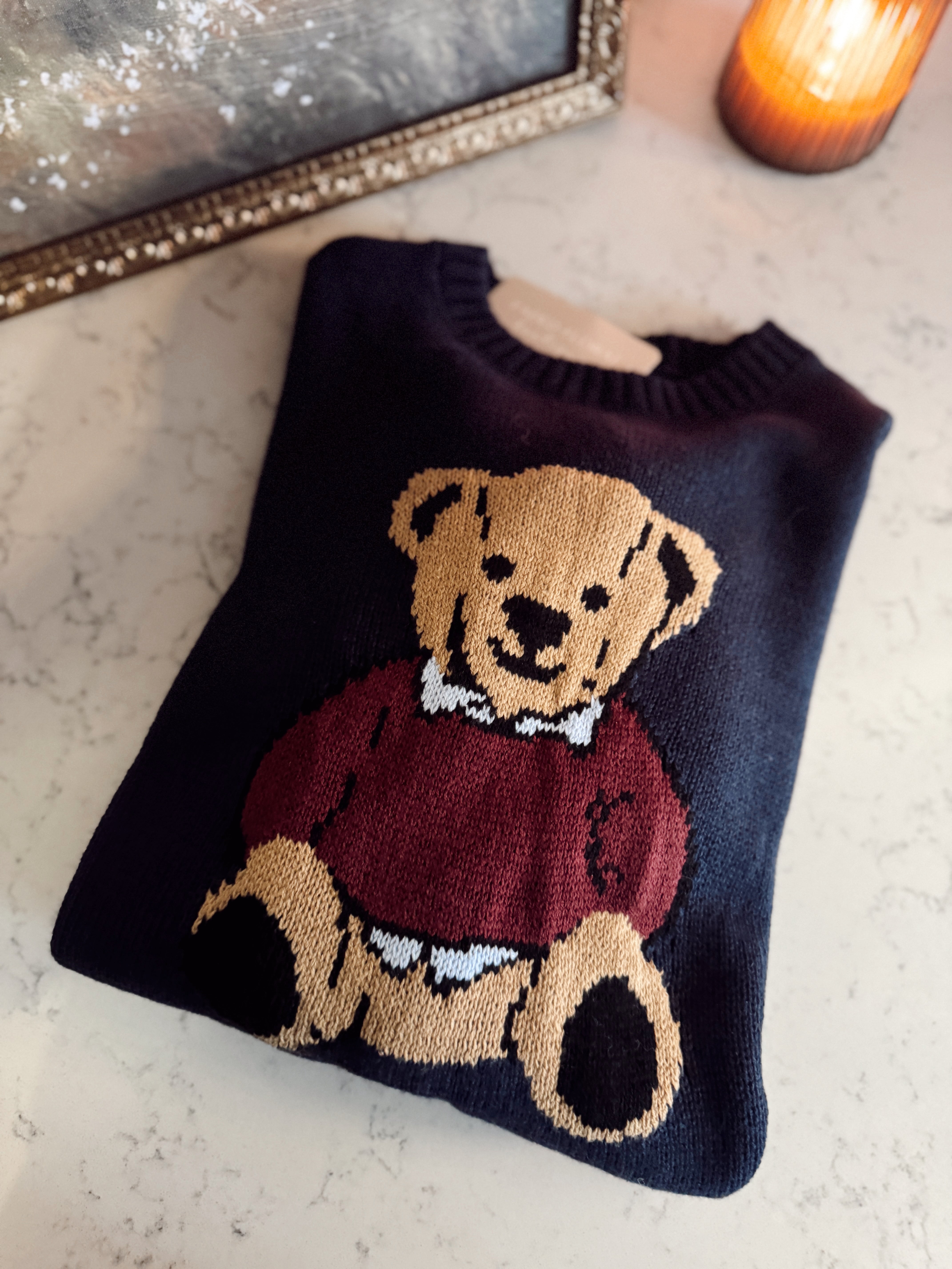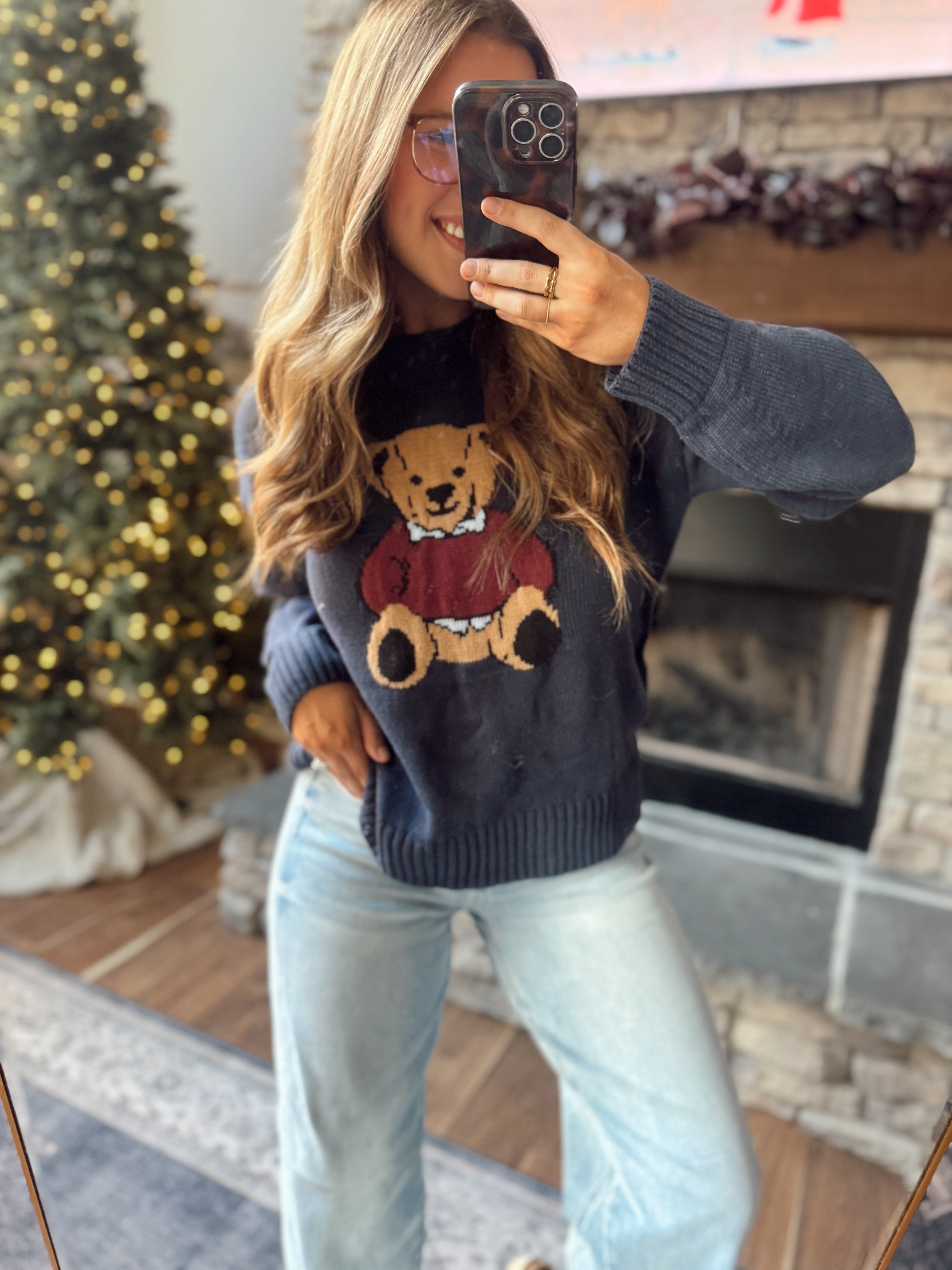 This navy knit sweater brings all the nostalgic vibes with its classic teddy bear design. Soft and medium-weight, it’s the perfect mix of playful and polished — pair it with denim, corduroys, or a mini skirt for an effortlessly cute winter look. A timeless piece that feels like a hug every time you wear it.