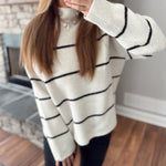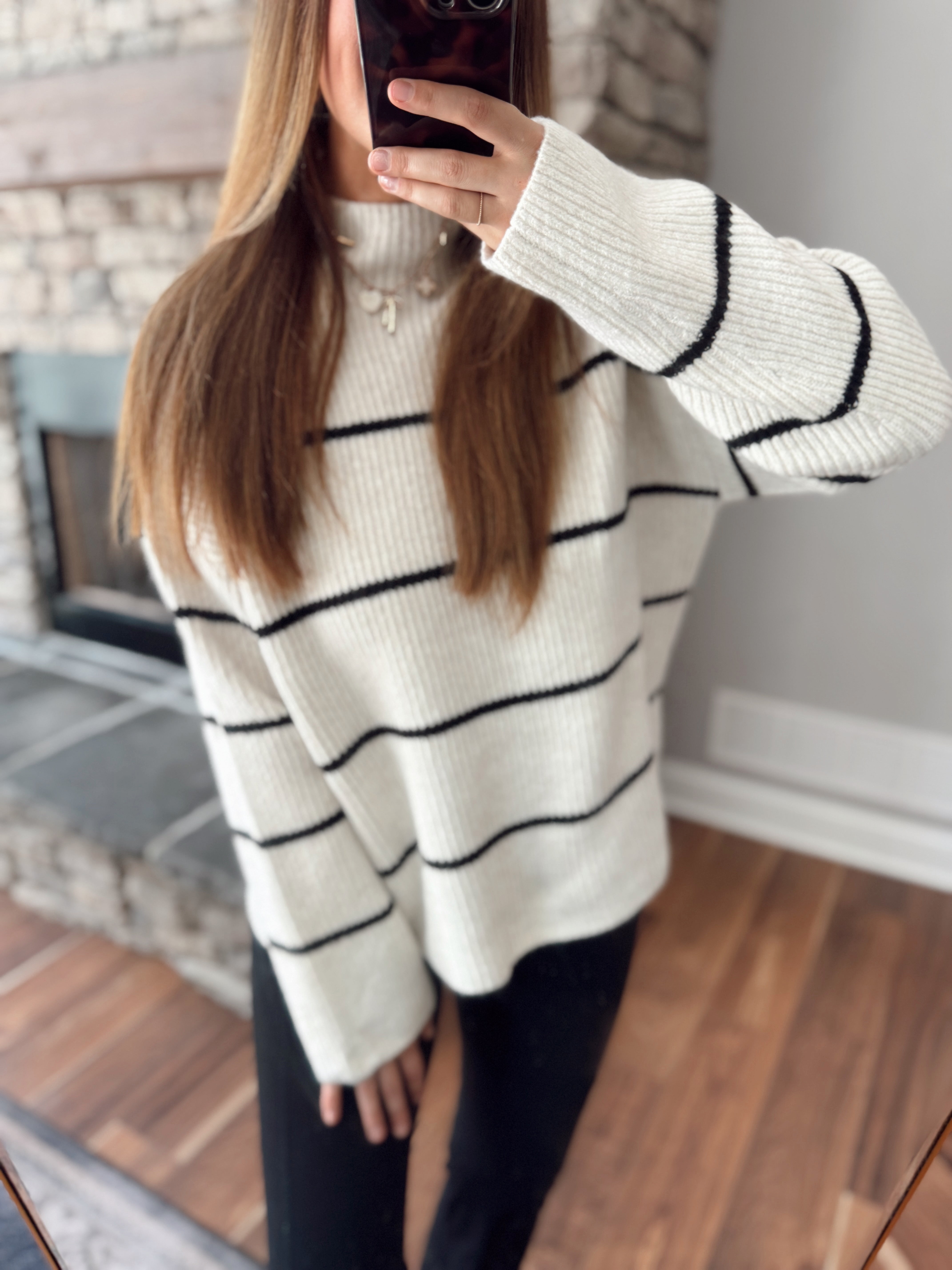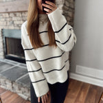 Minimalist, timeless, and effortlessly chic. This soft knit sweater features a cozy mock neckline and sleek black stripes on a cream base. The relaxed fit and slightly dropped shoulders give it that laid-back yet put-together vibe you’ll reach for all season long. Perfect for pairing with denim, trousers, or layered under a jacket for cooler days.