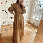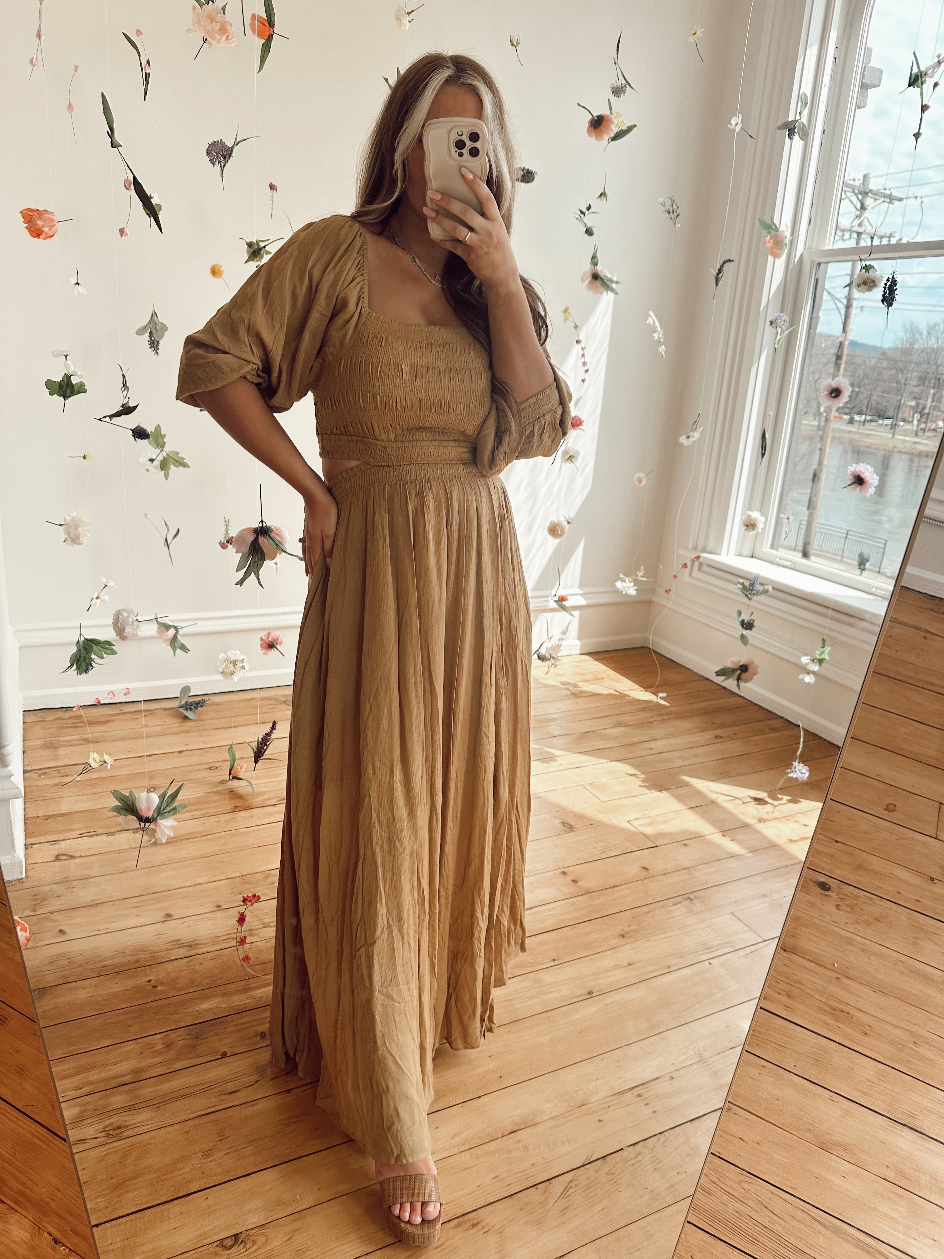 Absolutely stunning maxi! A relaxed - true fit. Smocked top. Small cut out on sides of waist.