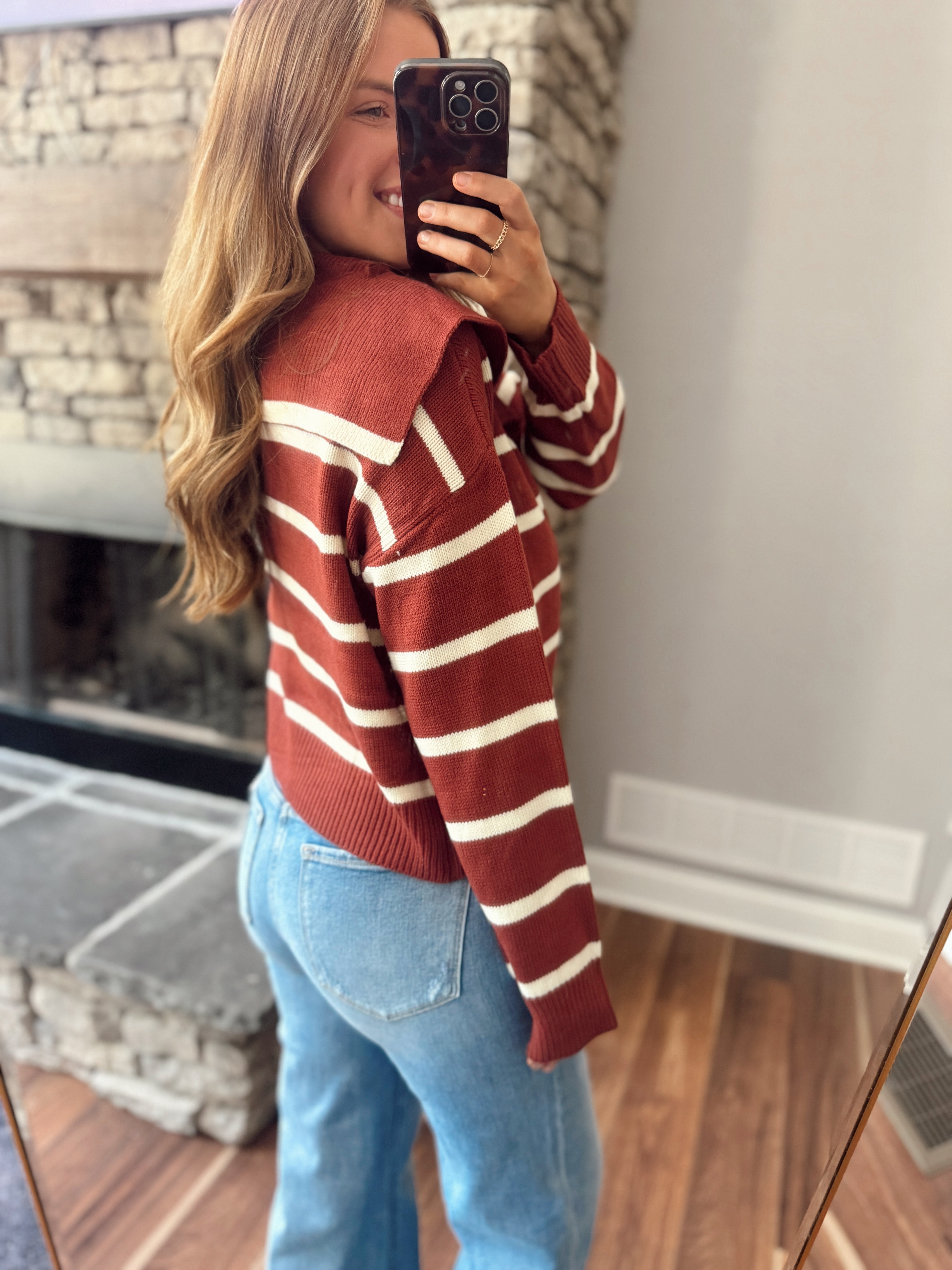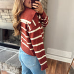 The perfect pop of fall color, this rust + cream striped cardigan is giving effortless cozy chic. Designed with a button-front closure, collared neckline, and relaxed fit—it’s as easy to dress up with denim as it is to lounge in on a crisp day.