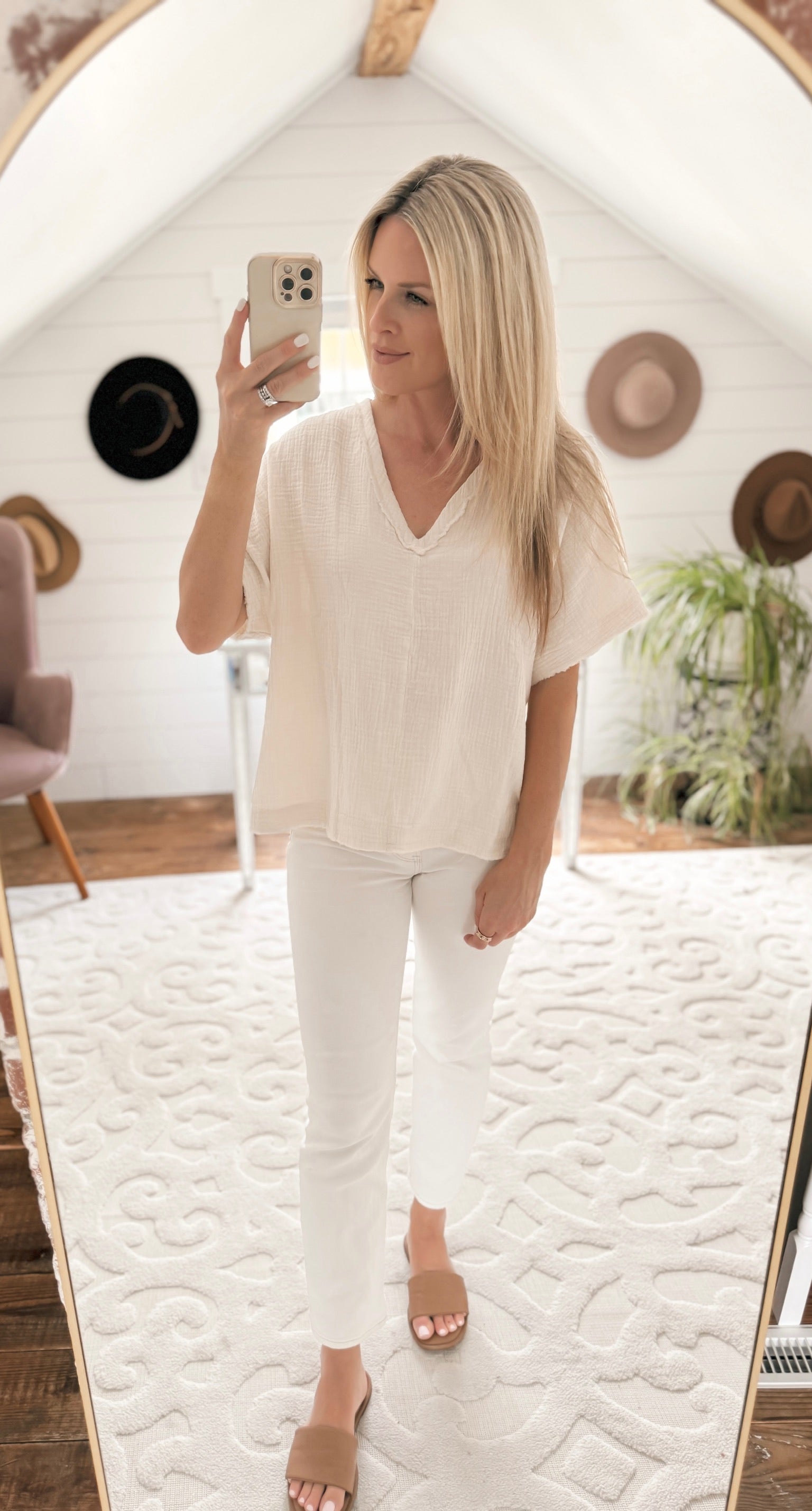 A wishlist top quality gauze top! Relaxed fit - can size down!
