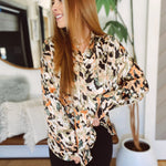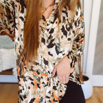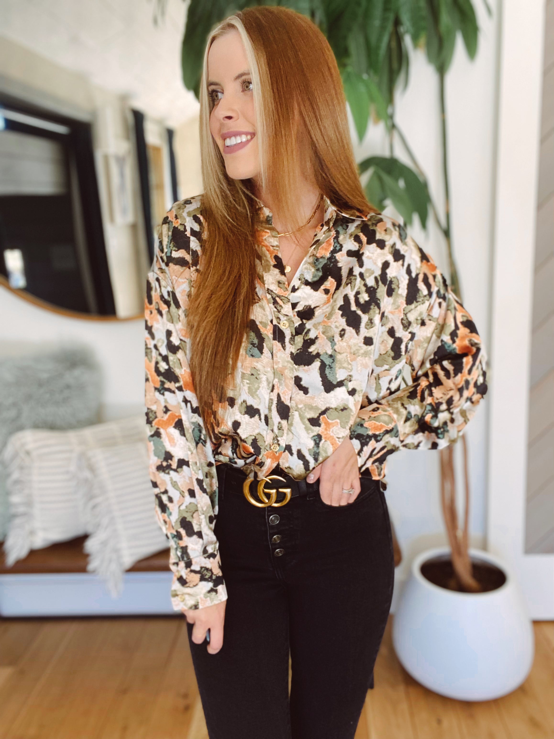 love this classic top! Silky and sparkly- ish (nothing major!) button up .. a bit longer but cute tucked too! Can size down :)