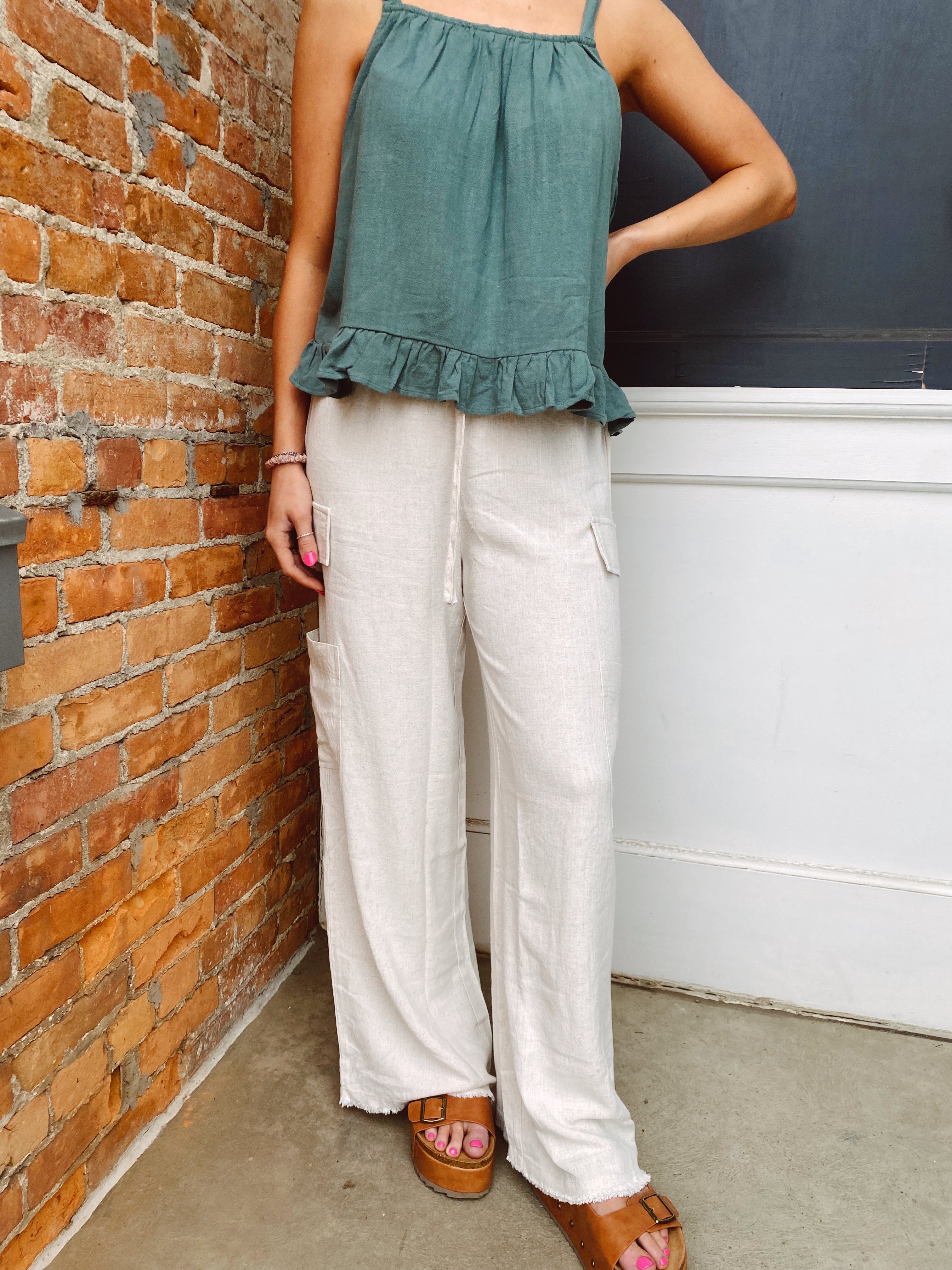 Probably my favorite pants! Elastic waist, pockets.. lightweight linen material.