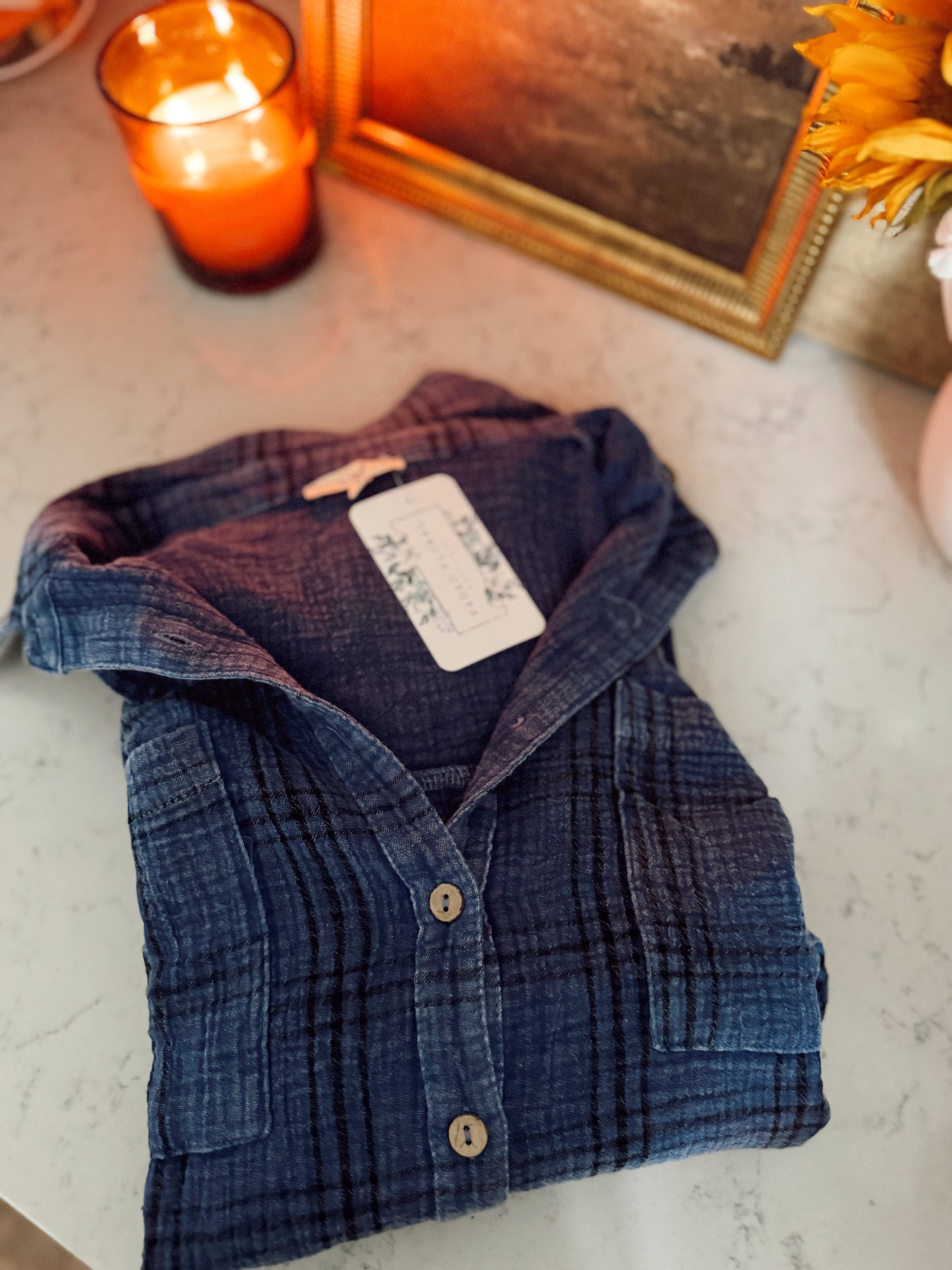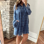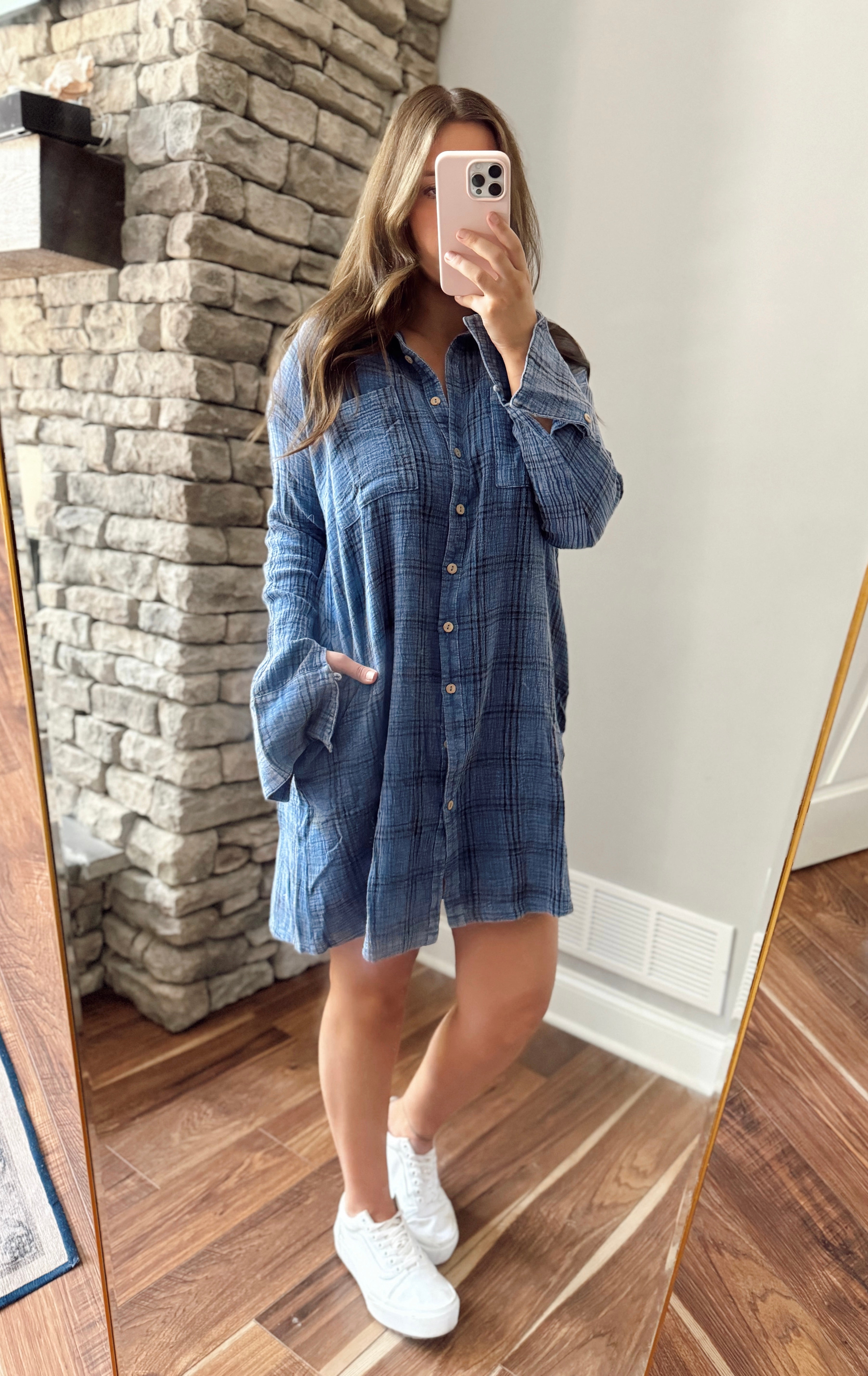 Autumn Days Cosmic Blue Mineral Washed Plaid Long Sleeve Dress