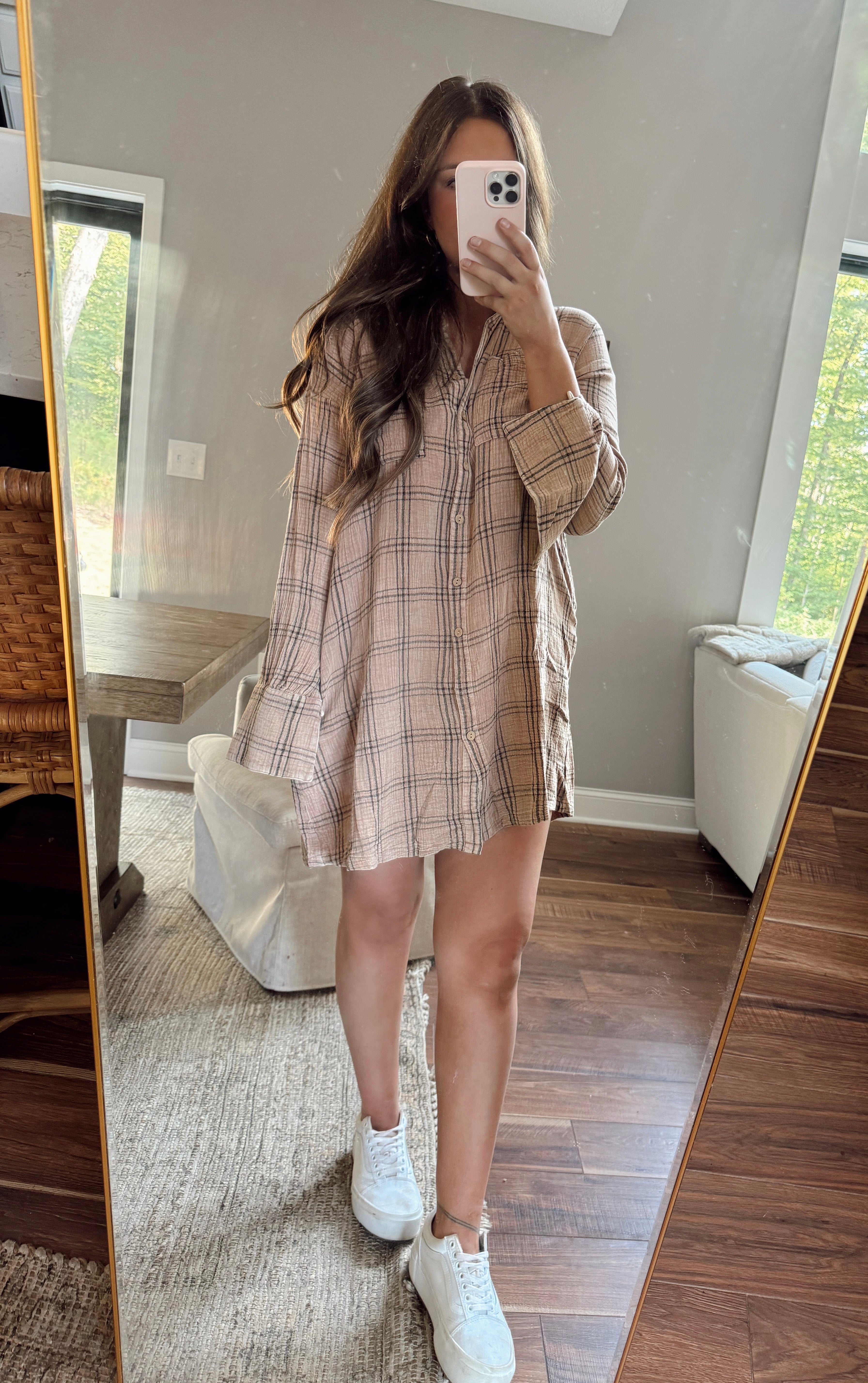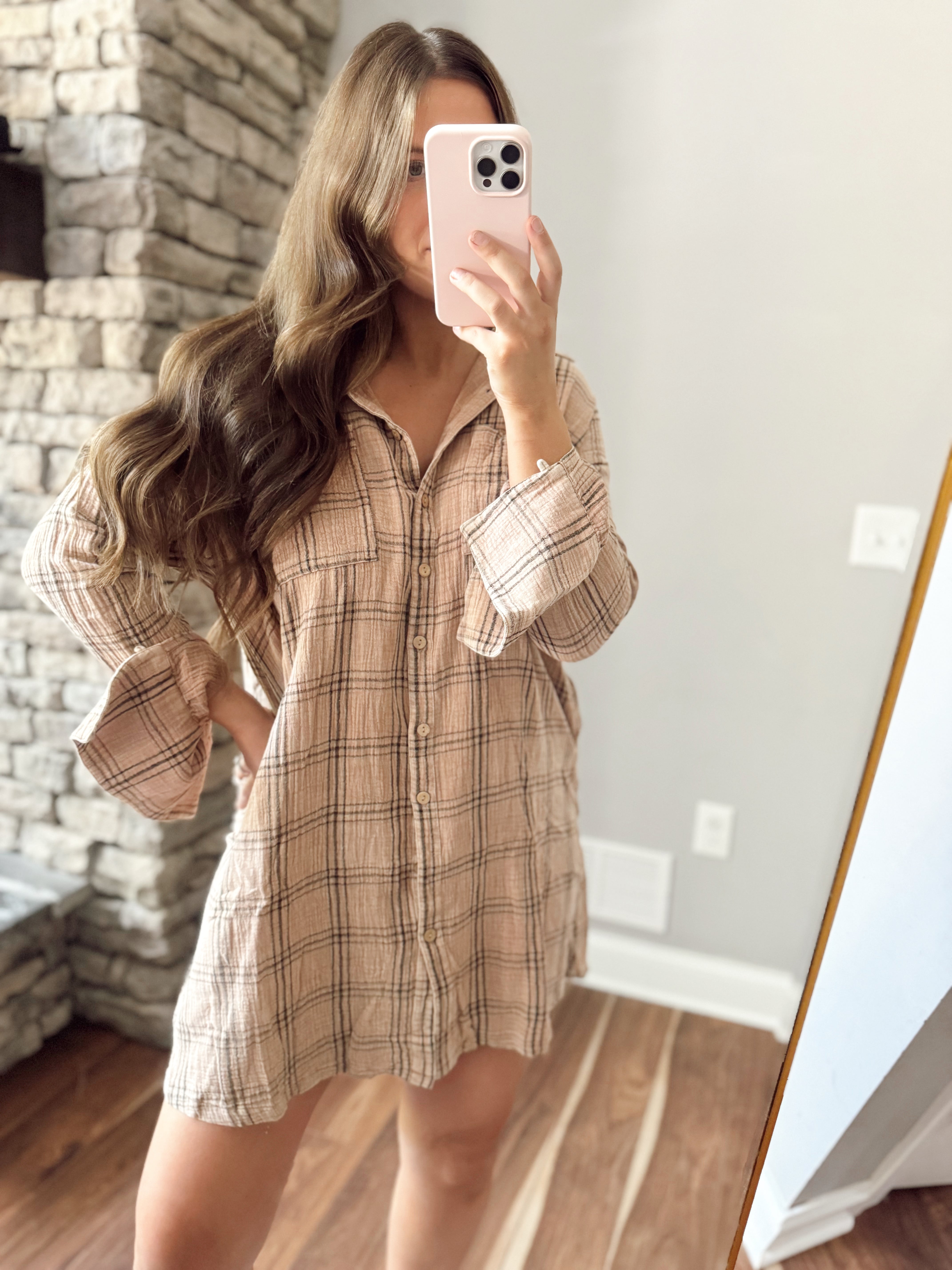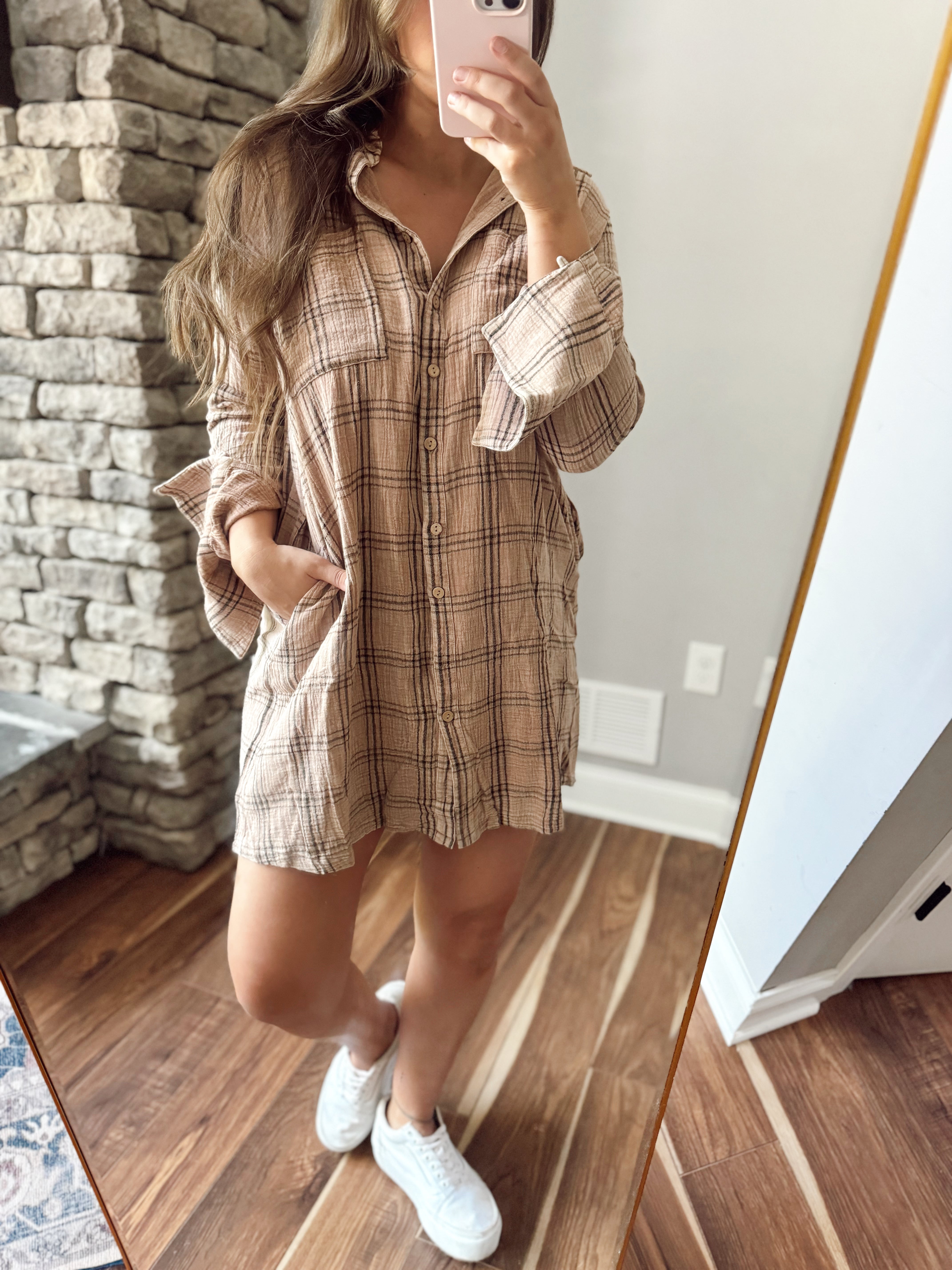Autumn Days Mocha Mineral Washed Plaid Long Sleeve Dress