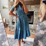 Classic meets casual in this denim midi. Featuring a button-front, short sleeves, a belted waist, and a flowy tiered hem, it’s the effortless throw-on-and-go piece that still looks polished. Lightweight and flattering, it moves with you from daytime errands to dinner out.