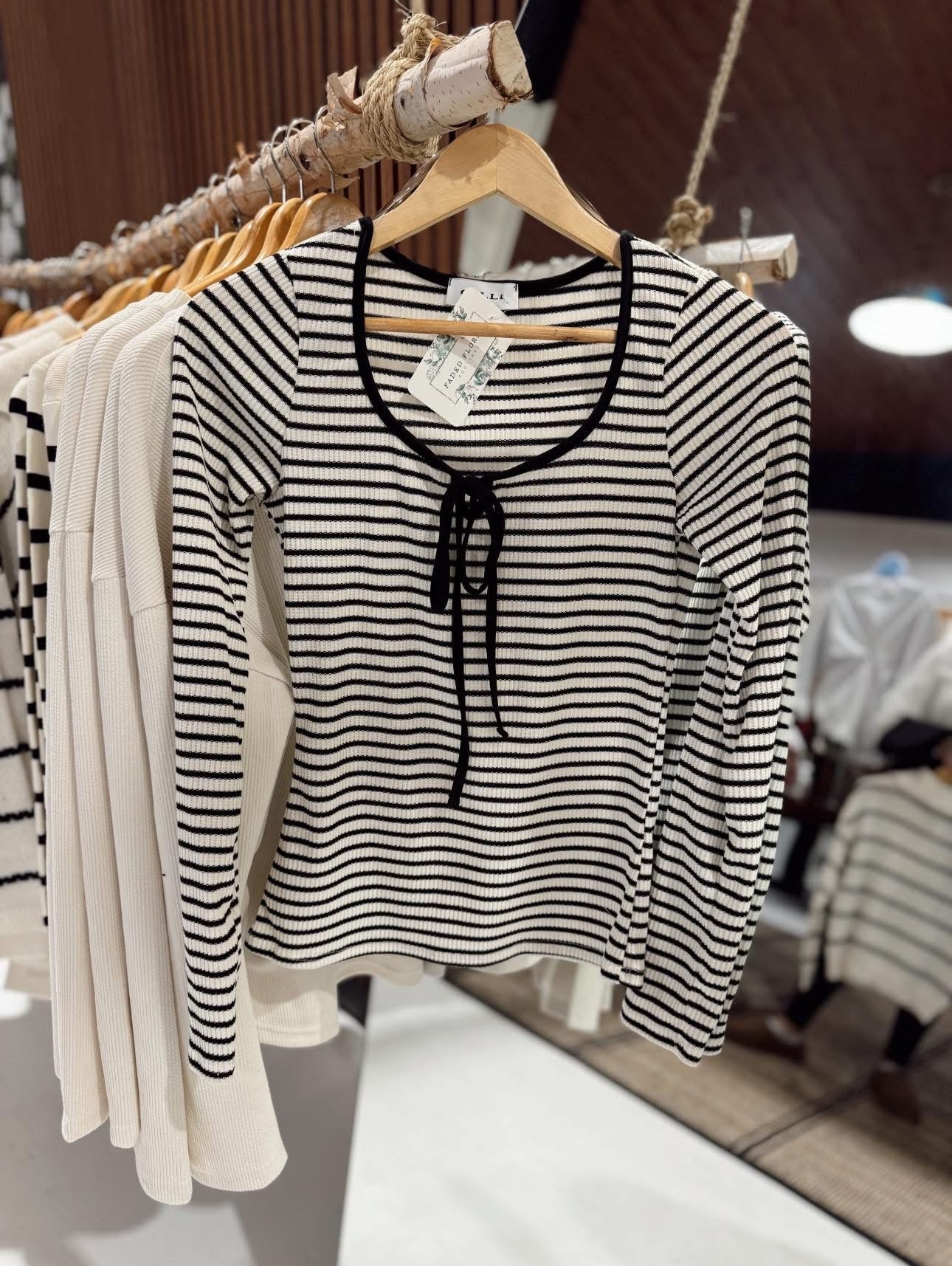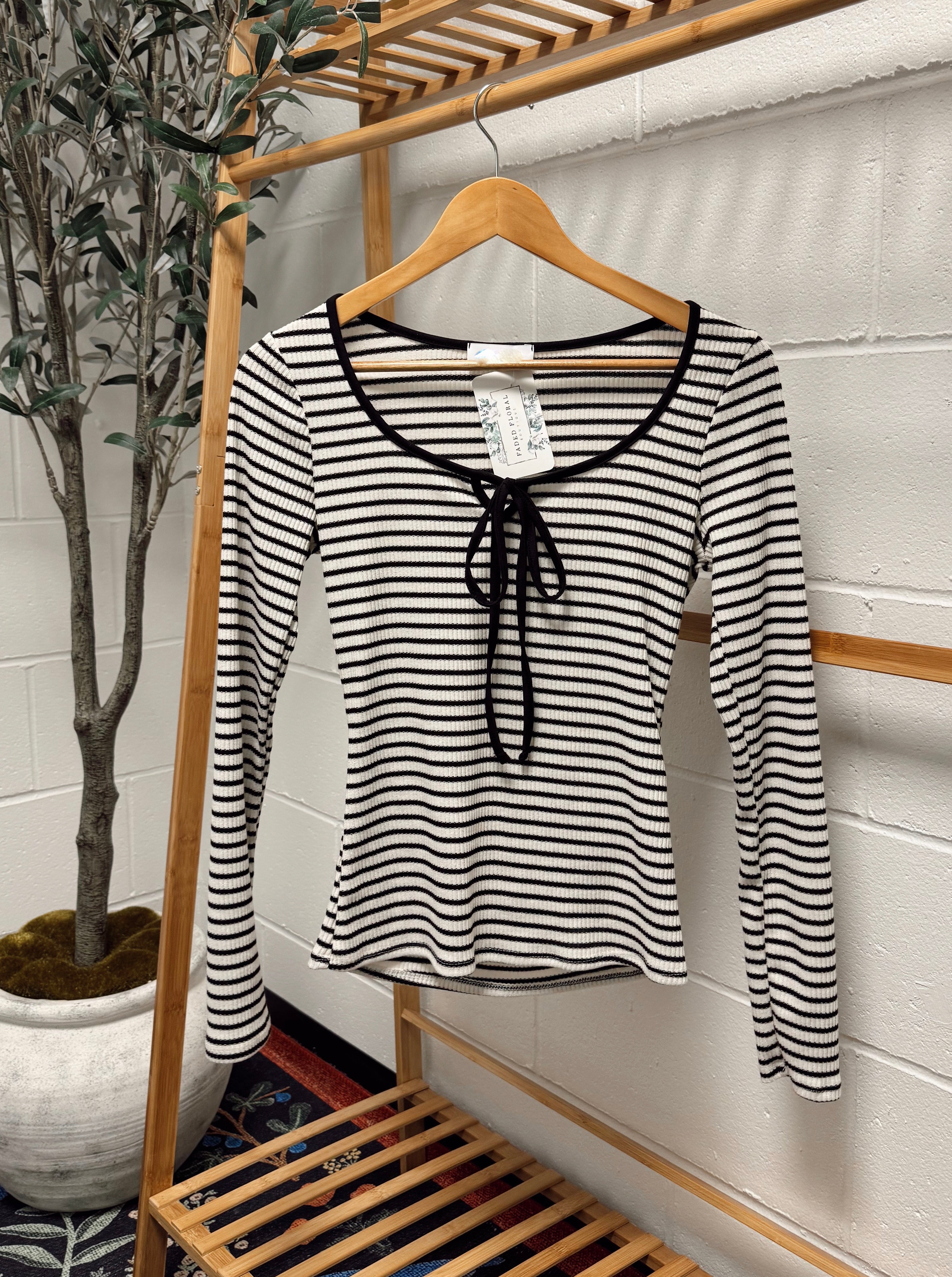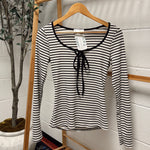 Black/White Striped Round Neck Front Tie Long Sleeve IN STORE