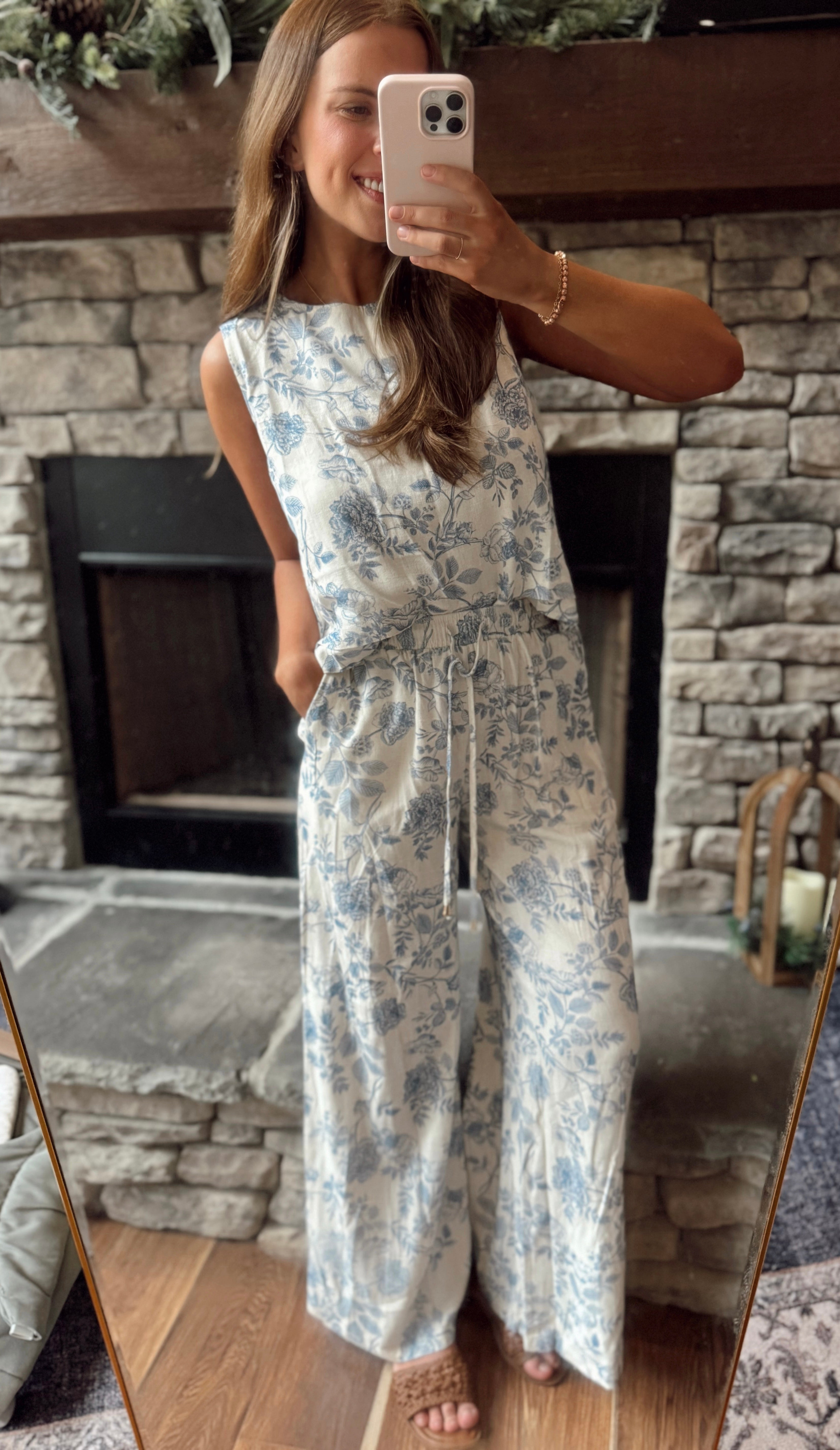 Blue Blossom Floral Linen Tank with Layered Hem