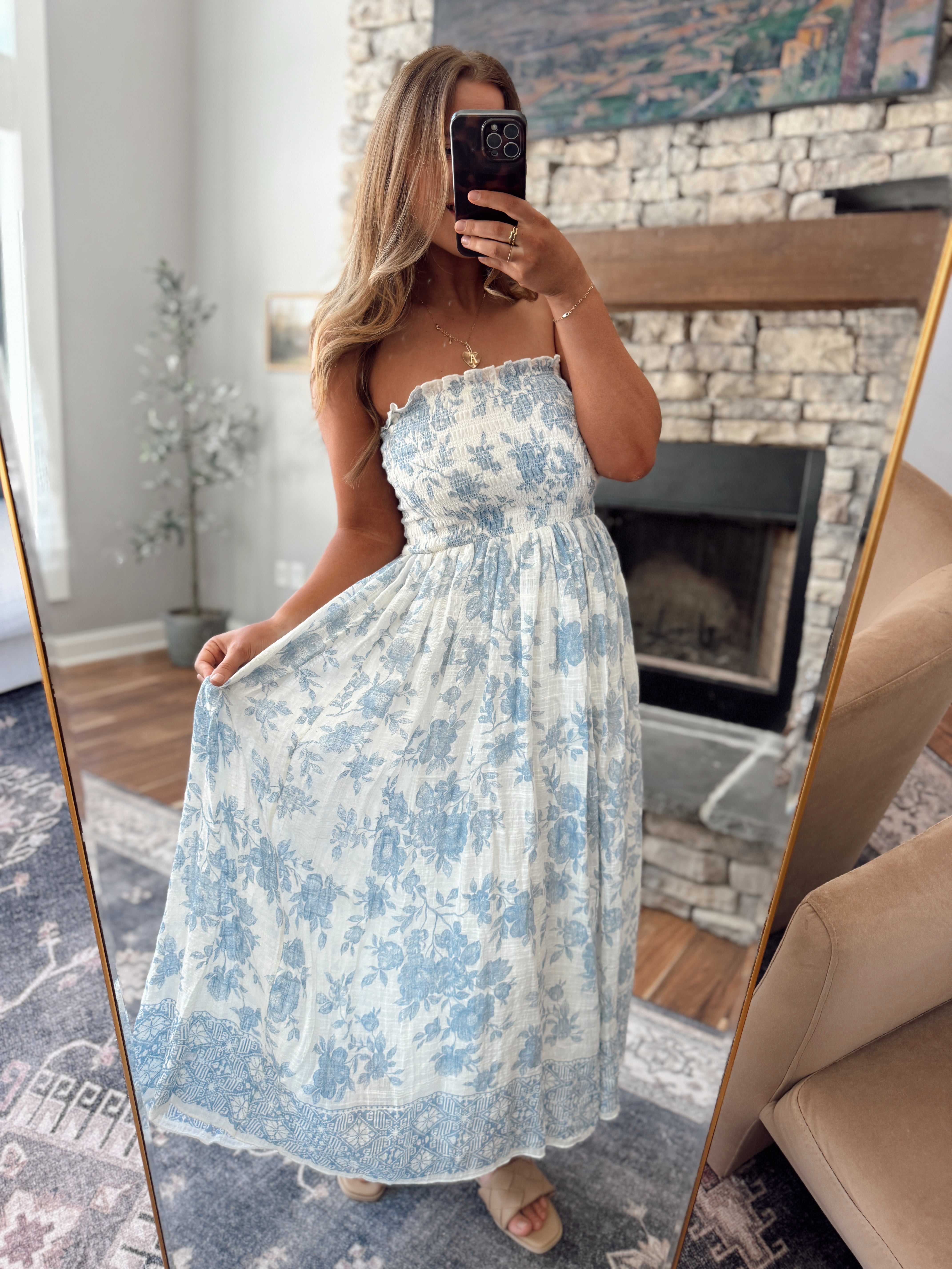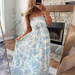 Effortless elegance meets timeless style with this blue floral strapless midi dress. The smocked bodice provides a flattering fit while the strapless neckline offers a romantic, versatile look perfect for any occasion. Flowing midi length and delicate floral print create a graceful silhouette that transitions seamlessly from day to evening wear.