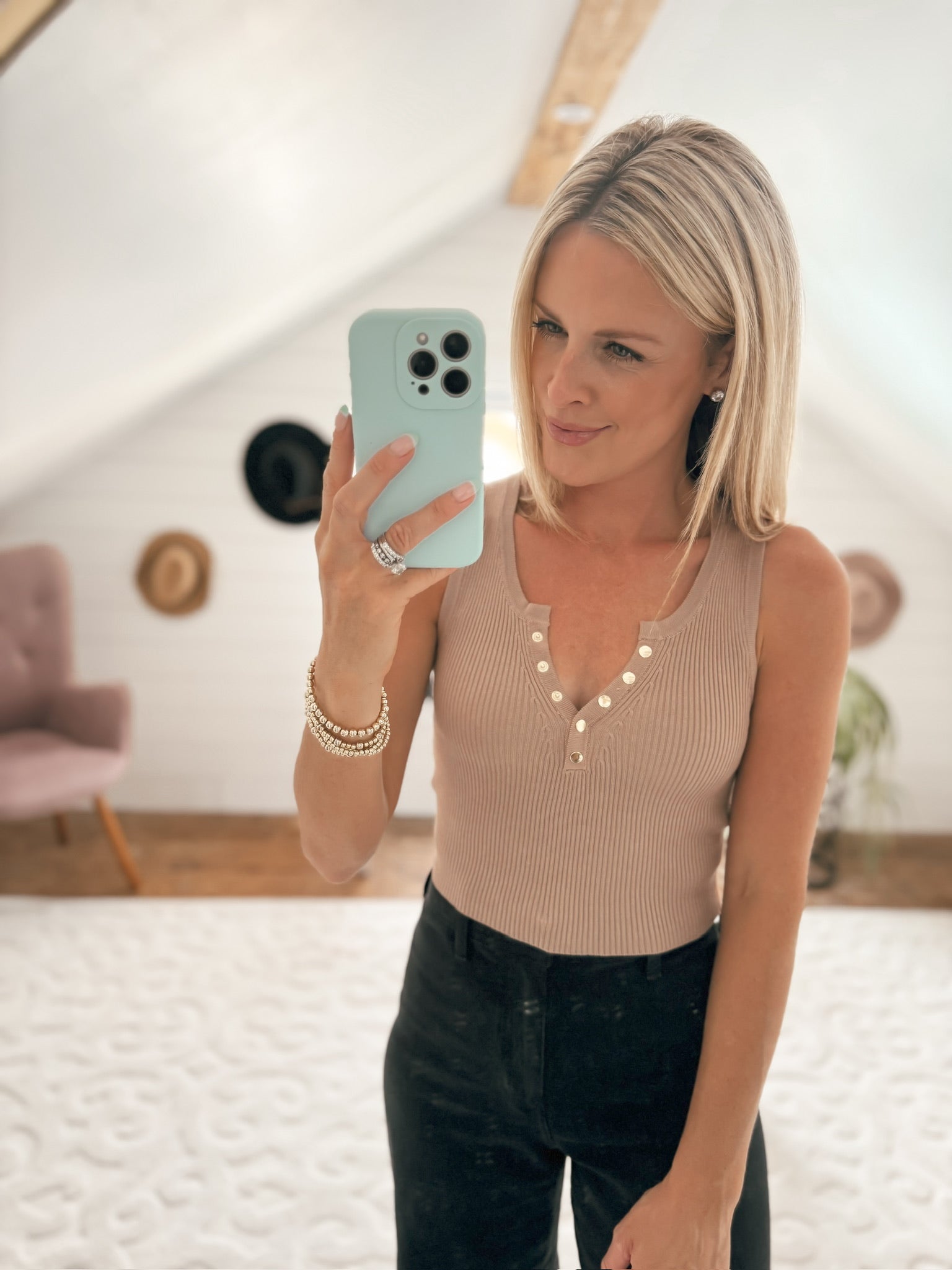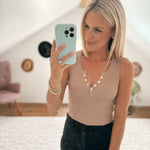 Loving the gold snap buttons giving you the ability to adjust your V-neck to a desired depth.