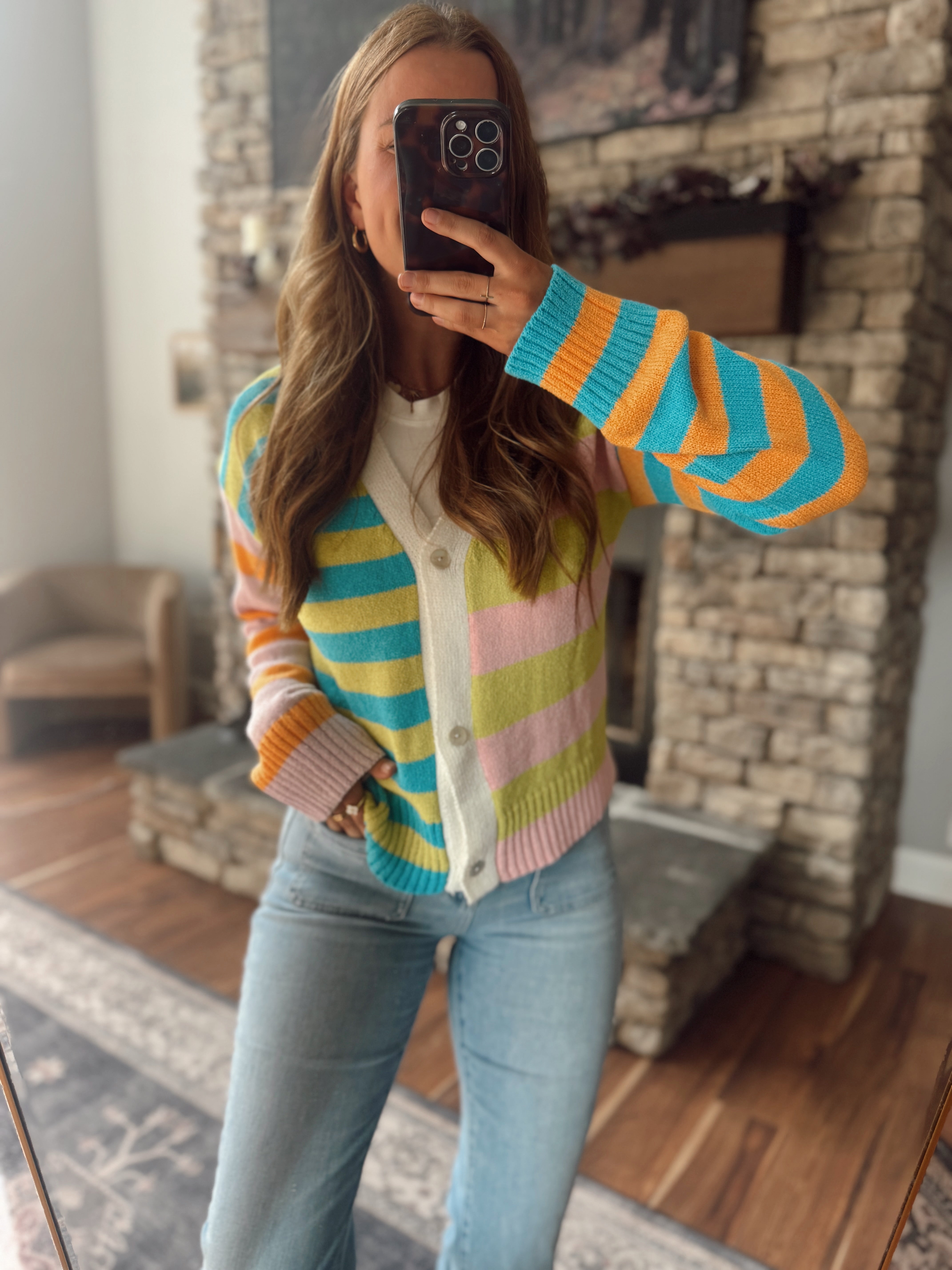 Bring on the color! This striped cardigan is the ultimate mood-booster with its bright mix of bold and pastel hues. Featuring a classic button front, relaxed fit, and playful pattern, it’s the layering piece that instantly makes any outfit pop.