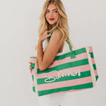 Bubblegum Pink/Emerald Striped Summer Beach Tote Bag