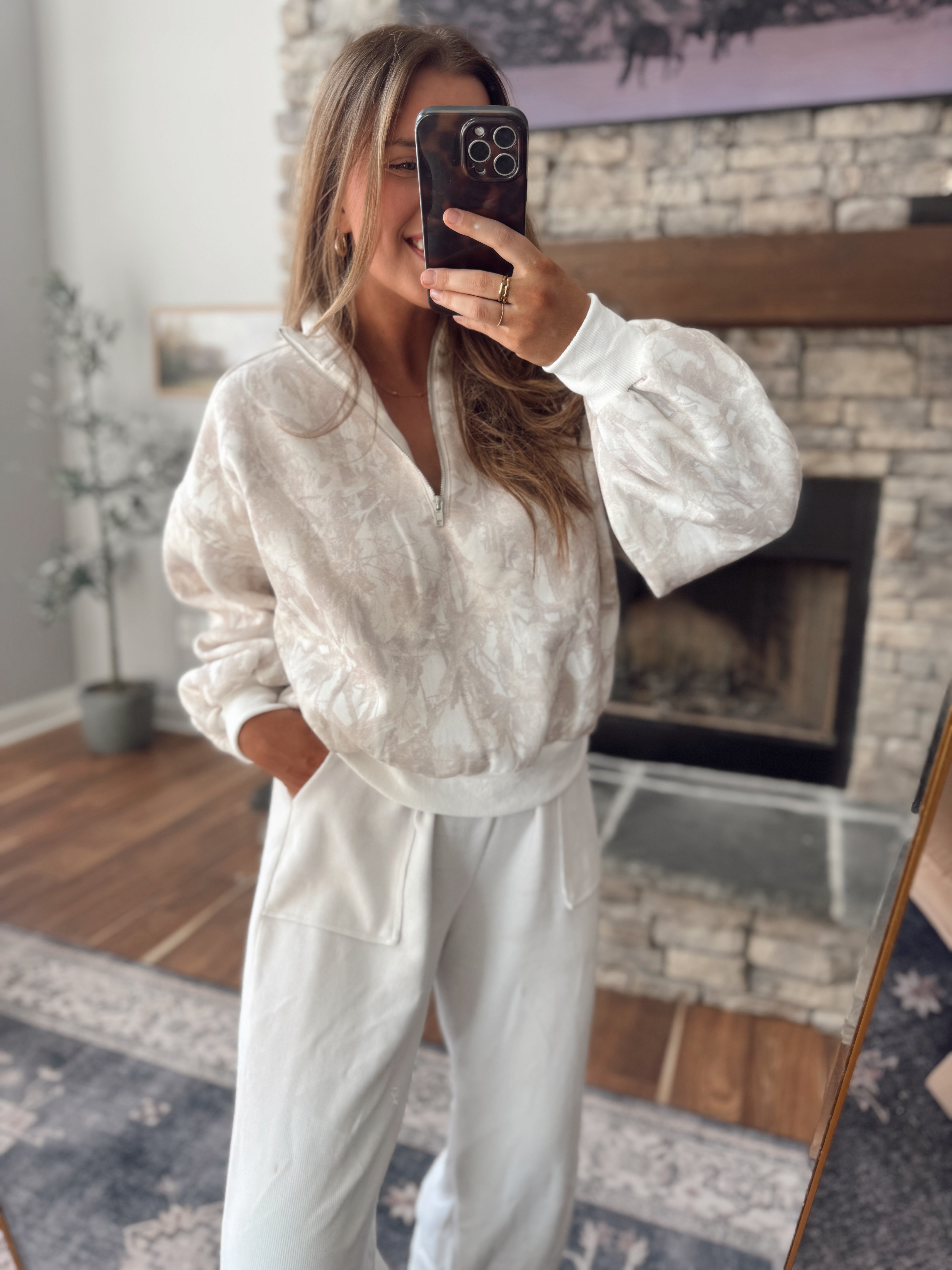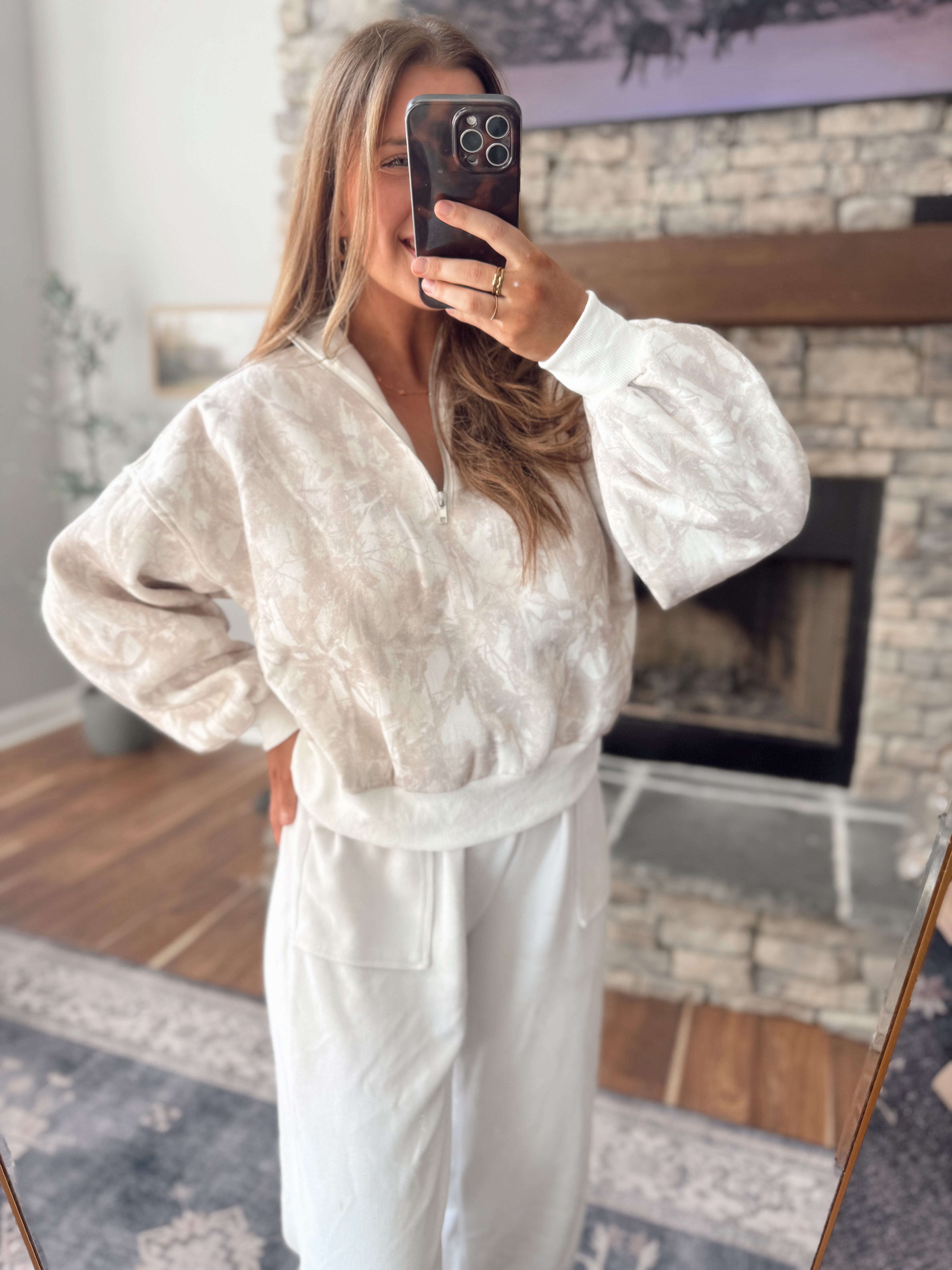 Effortless comfort, upgraded. This textured quarter zip pullover features a soft neutral pattern that adds interest without being loud. Designed with a relaxed fit, drop shoulders, and cozy sleeves, it’s the perfect blend of laid-back and put-together.