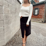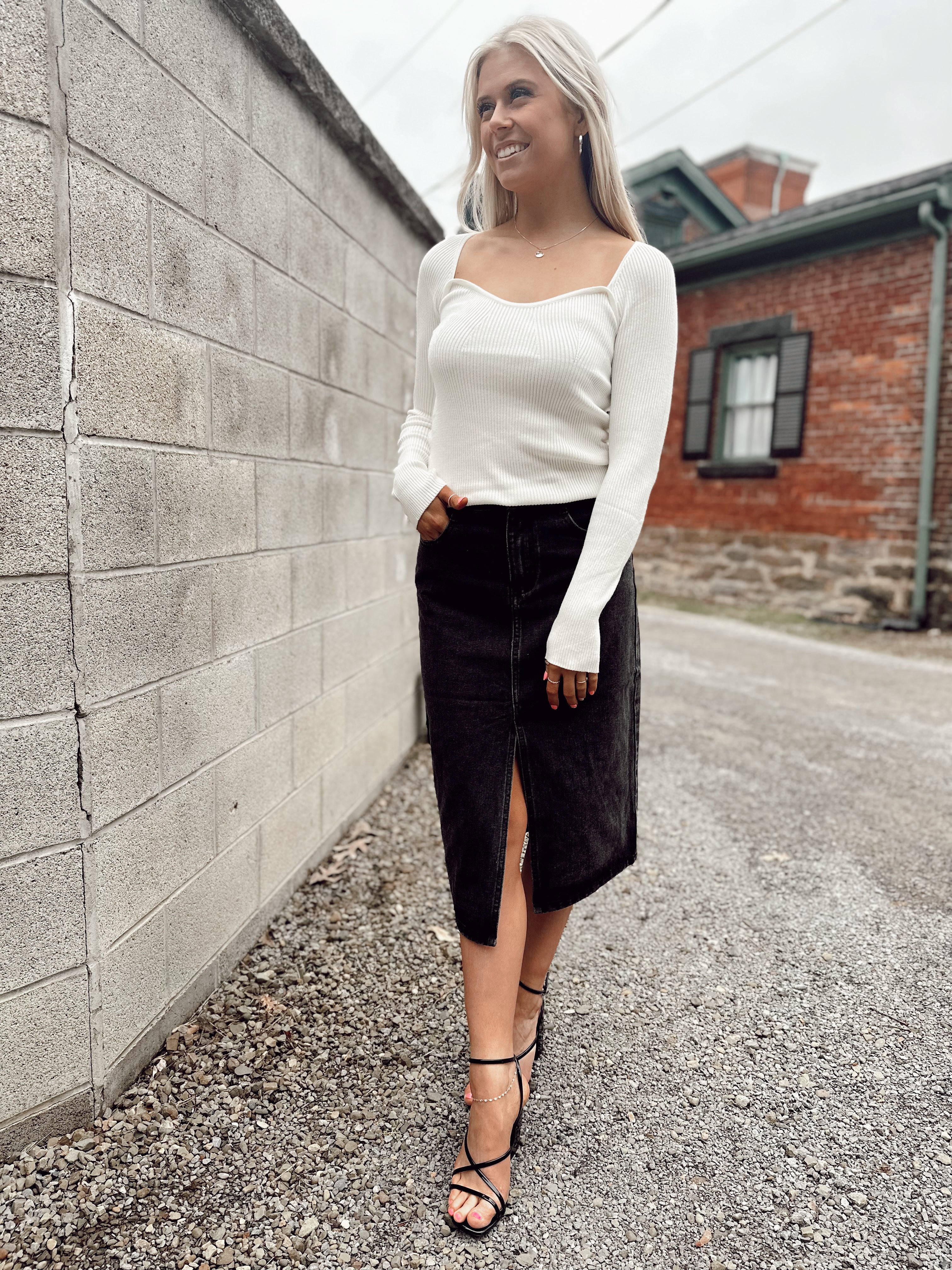 FINAL SALE! The cutest denim black skirt! MUST HAVE! Not a ton of stretch - our model is a size 26 in the medium! If you have a bum, size up 1!