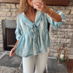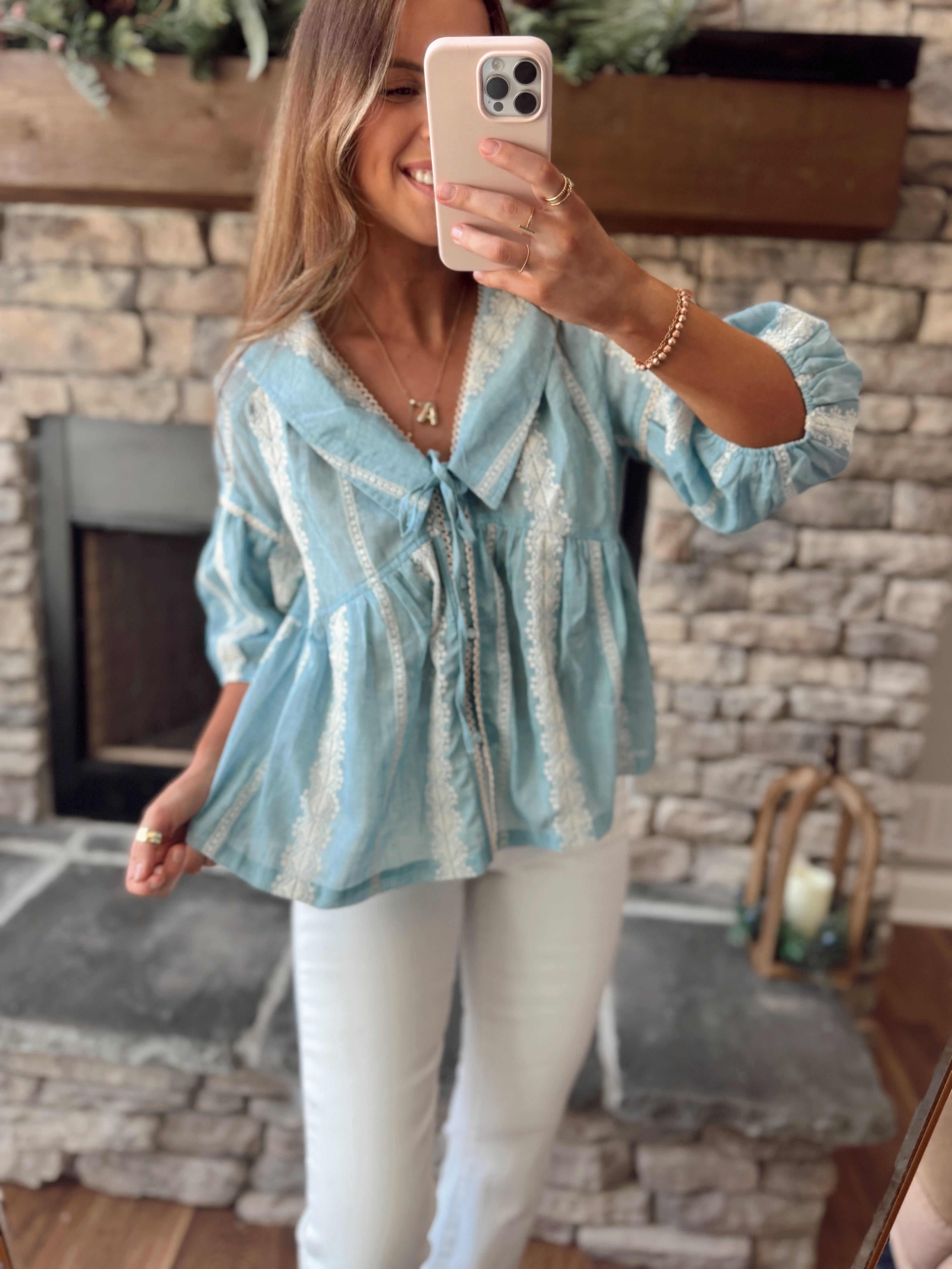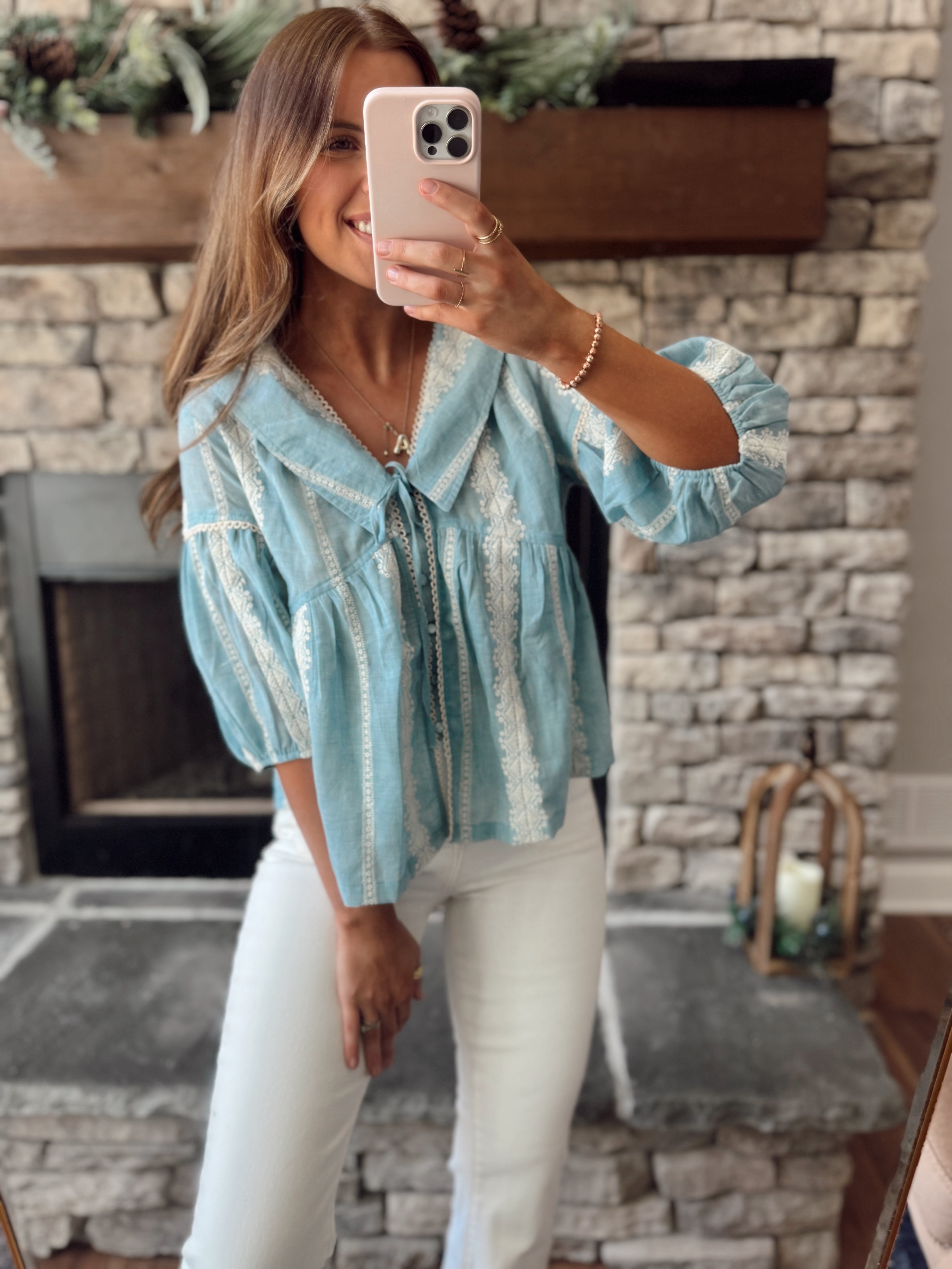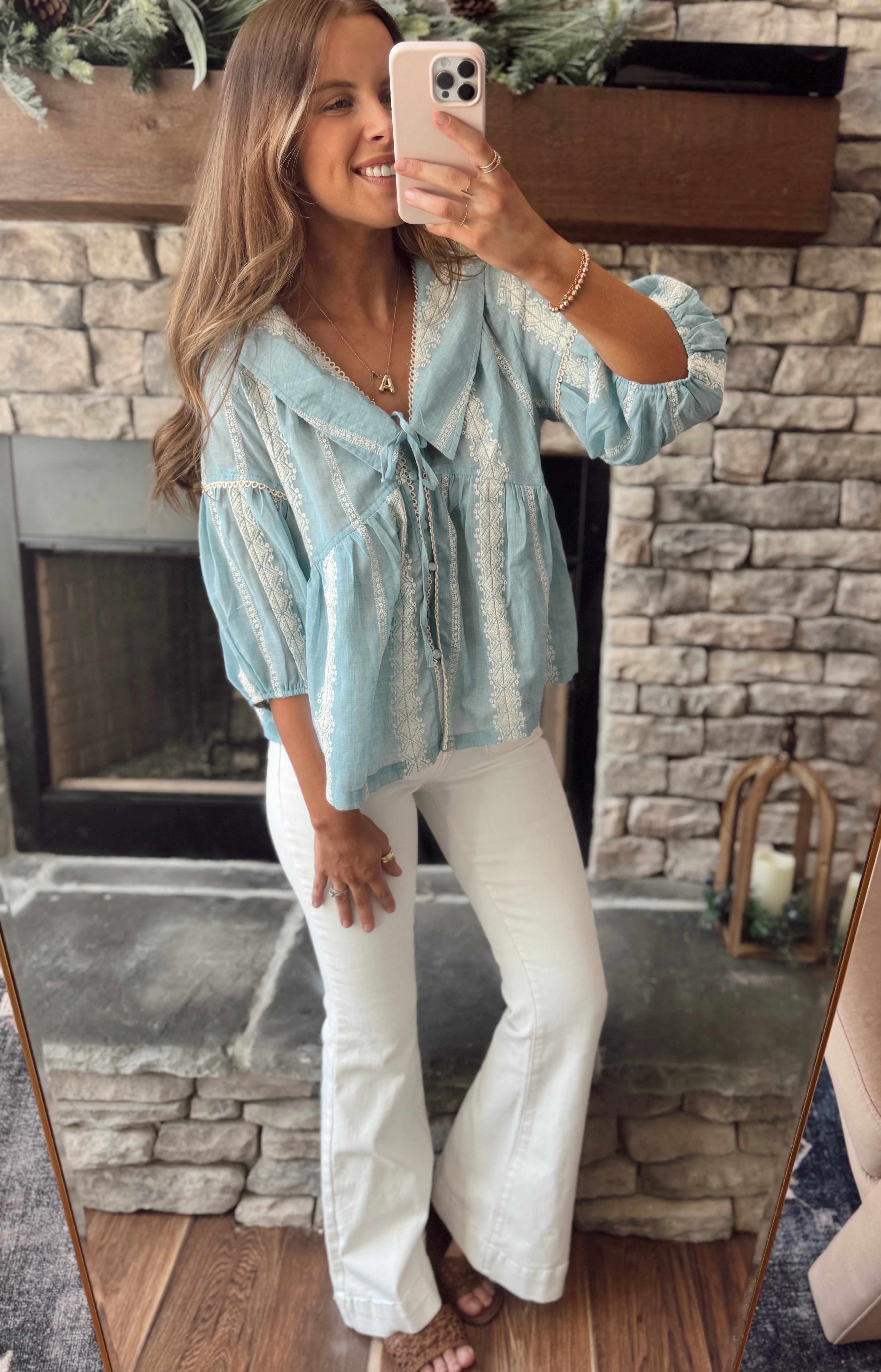 Cloud Wash Embroidered Collar Button Down Short Sleeve