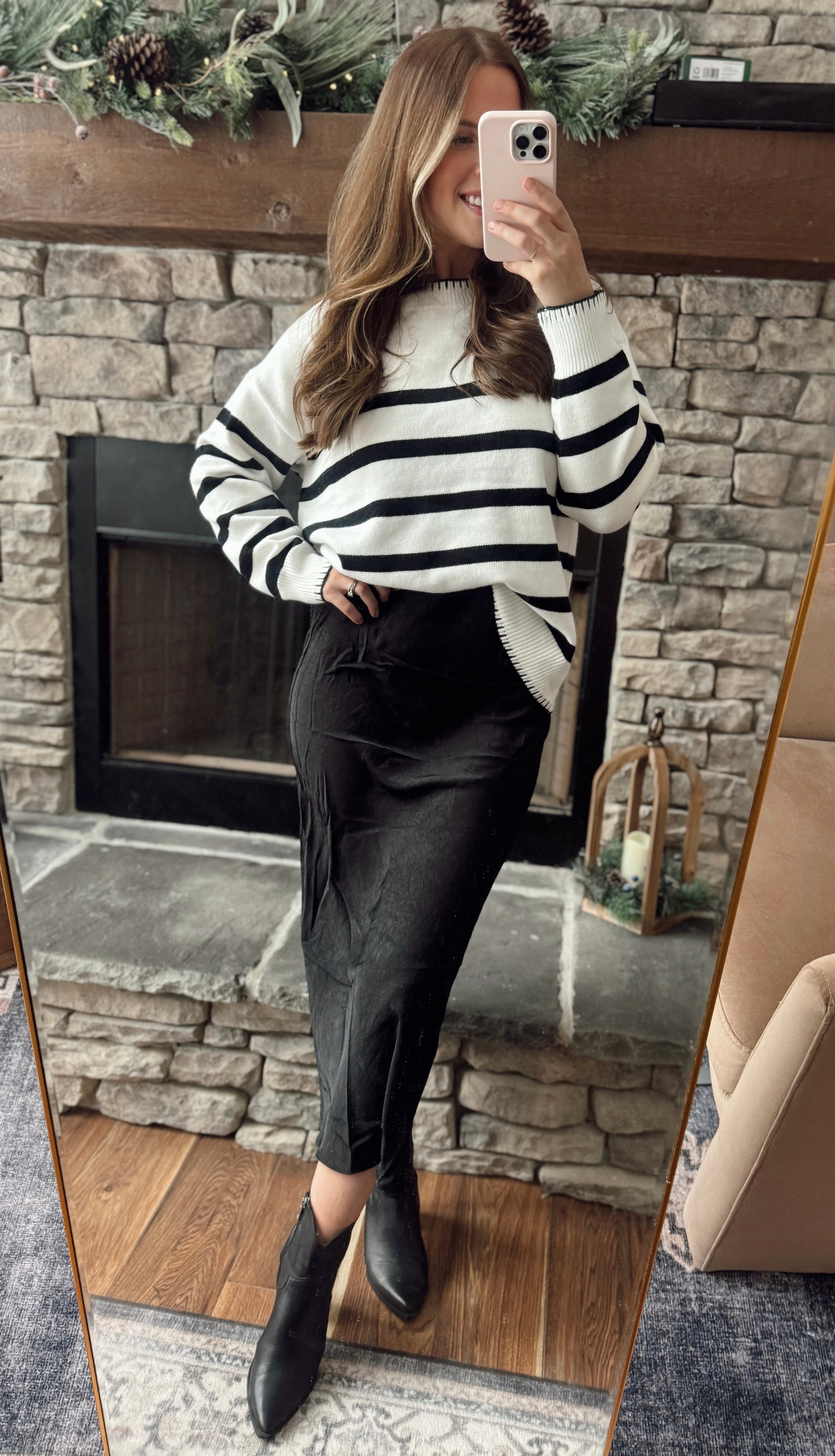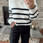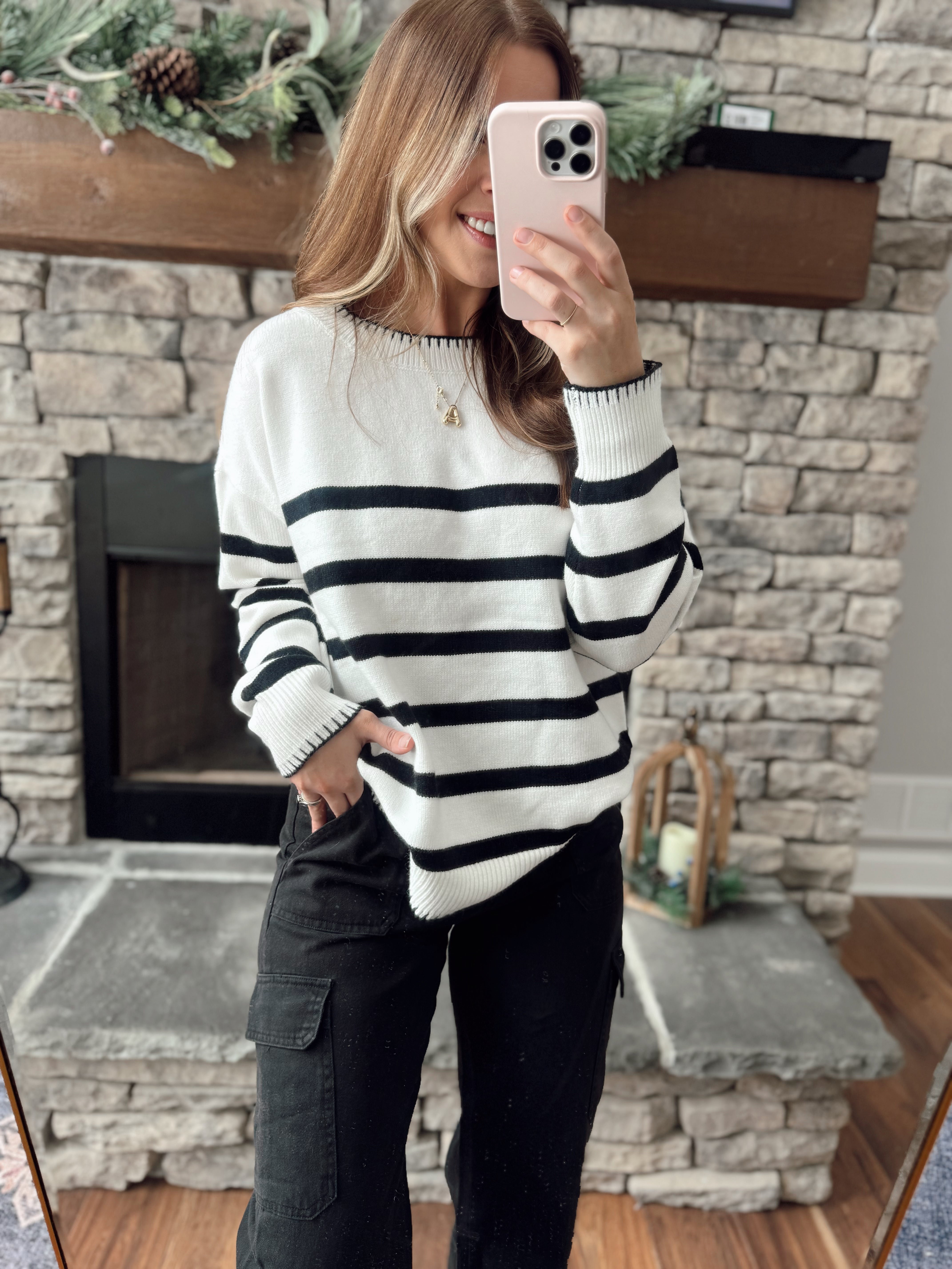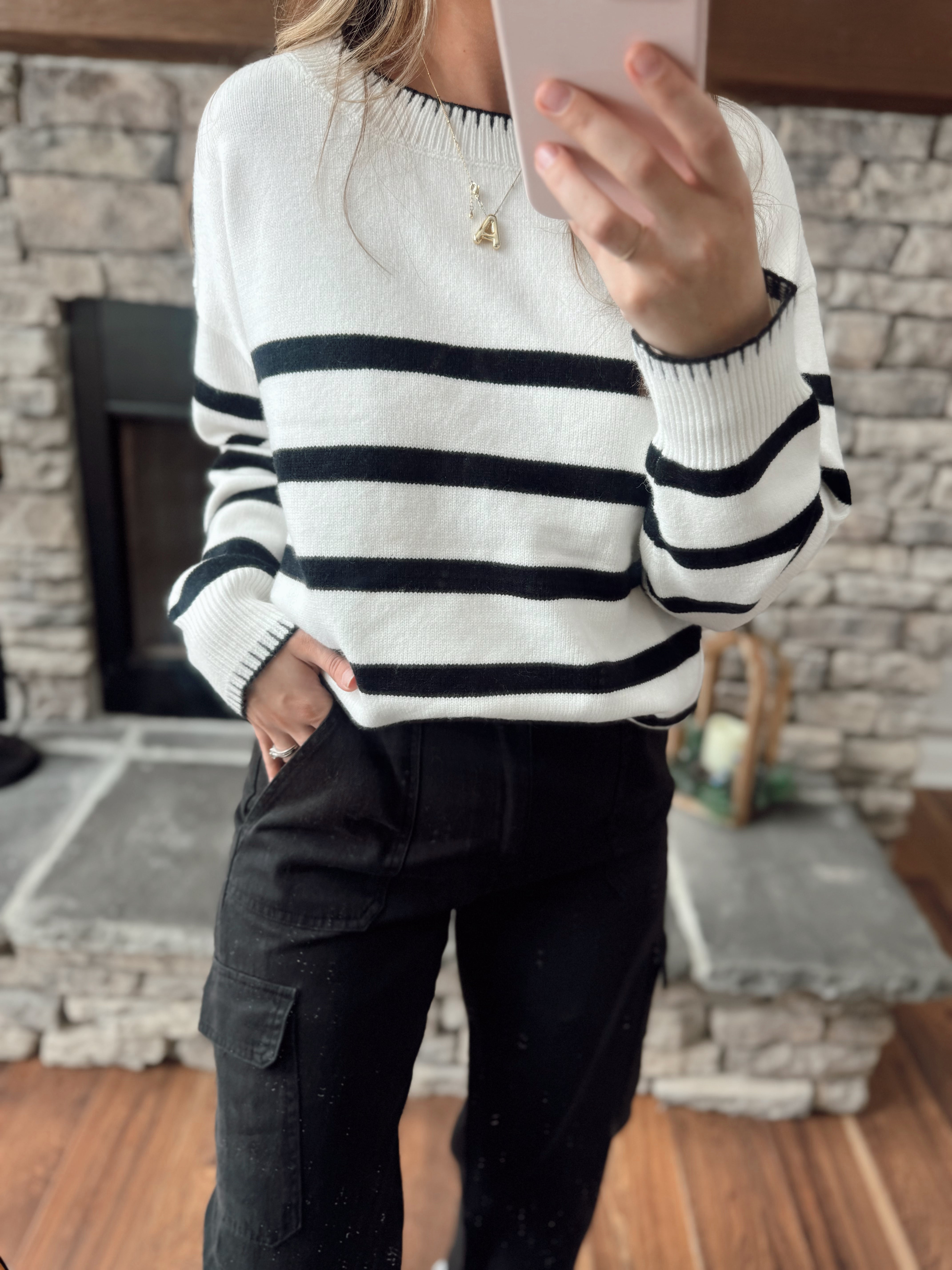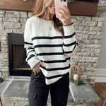 Comfortable Cuteness White/Black Striped Crew Sweater