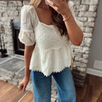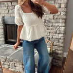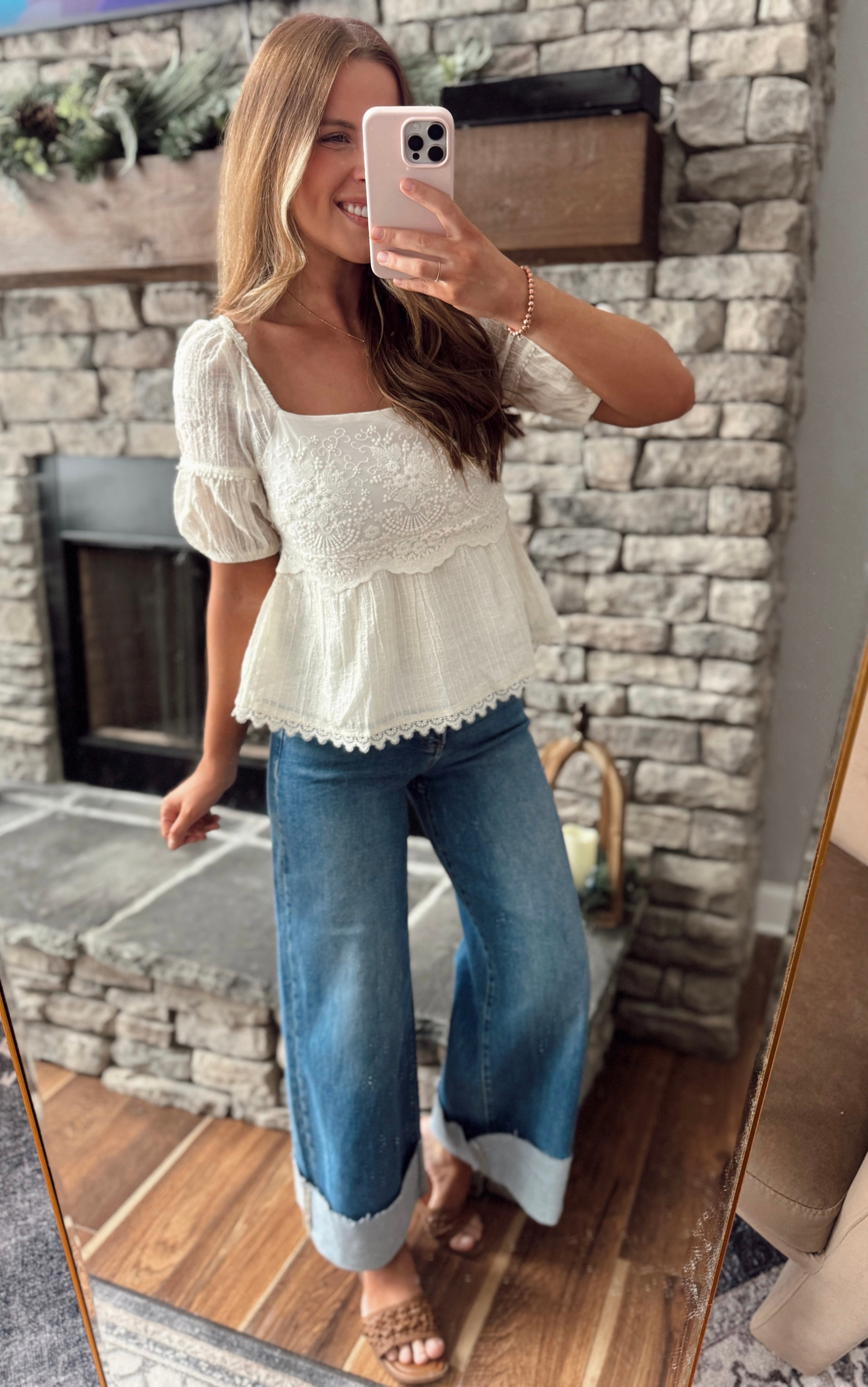 Cream Queenie Embroidered Detail Square Neck Babydoll Top