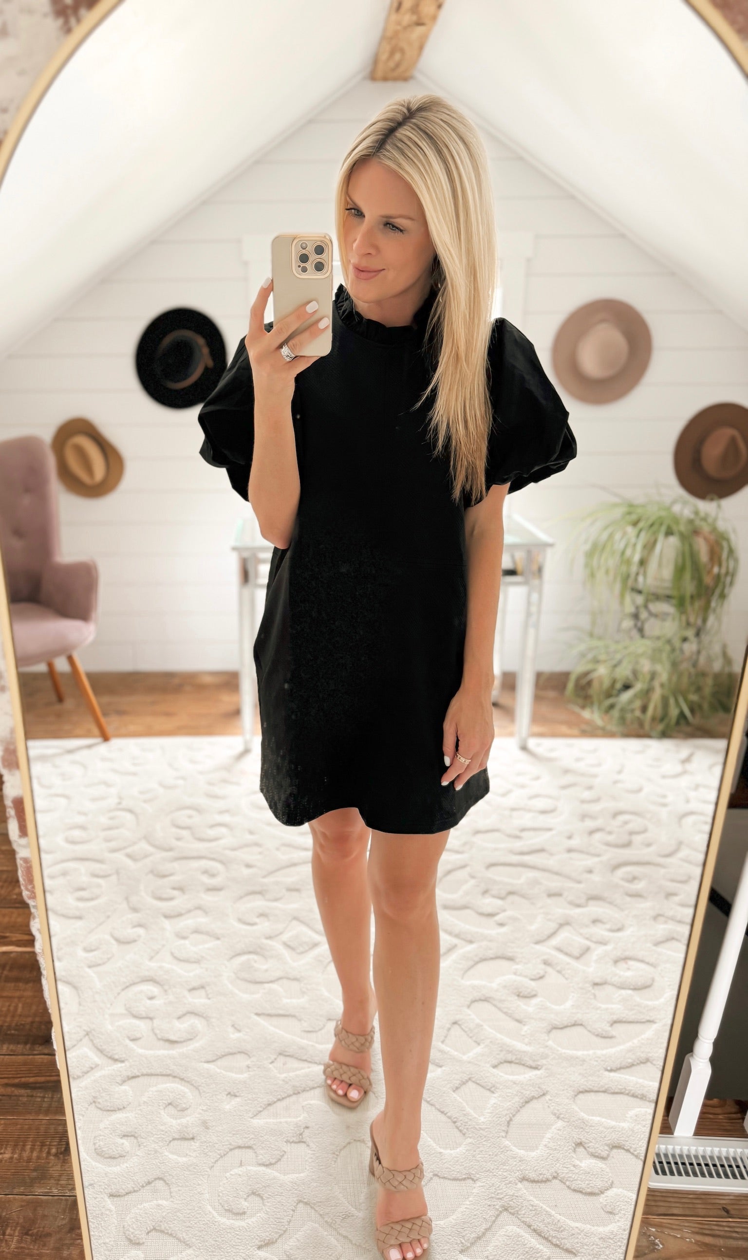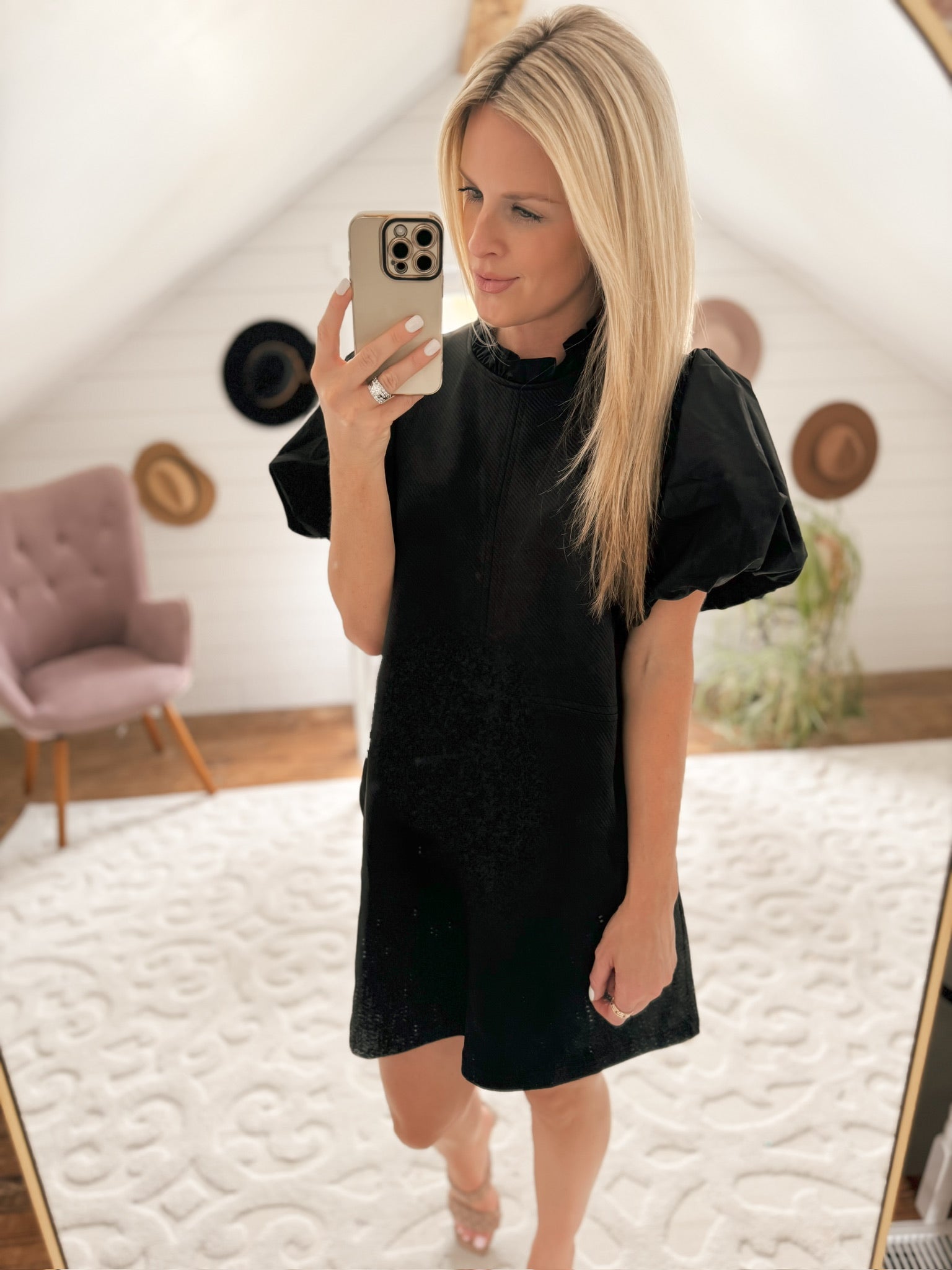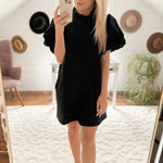 Ribbed material body wwith adorable bubble sleeves that dresses up this mini in such a good way! A relaxed fit.