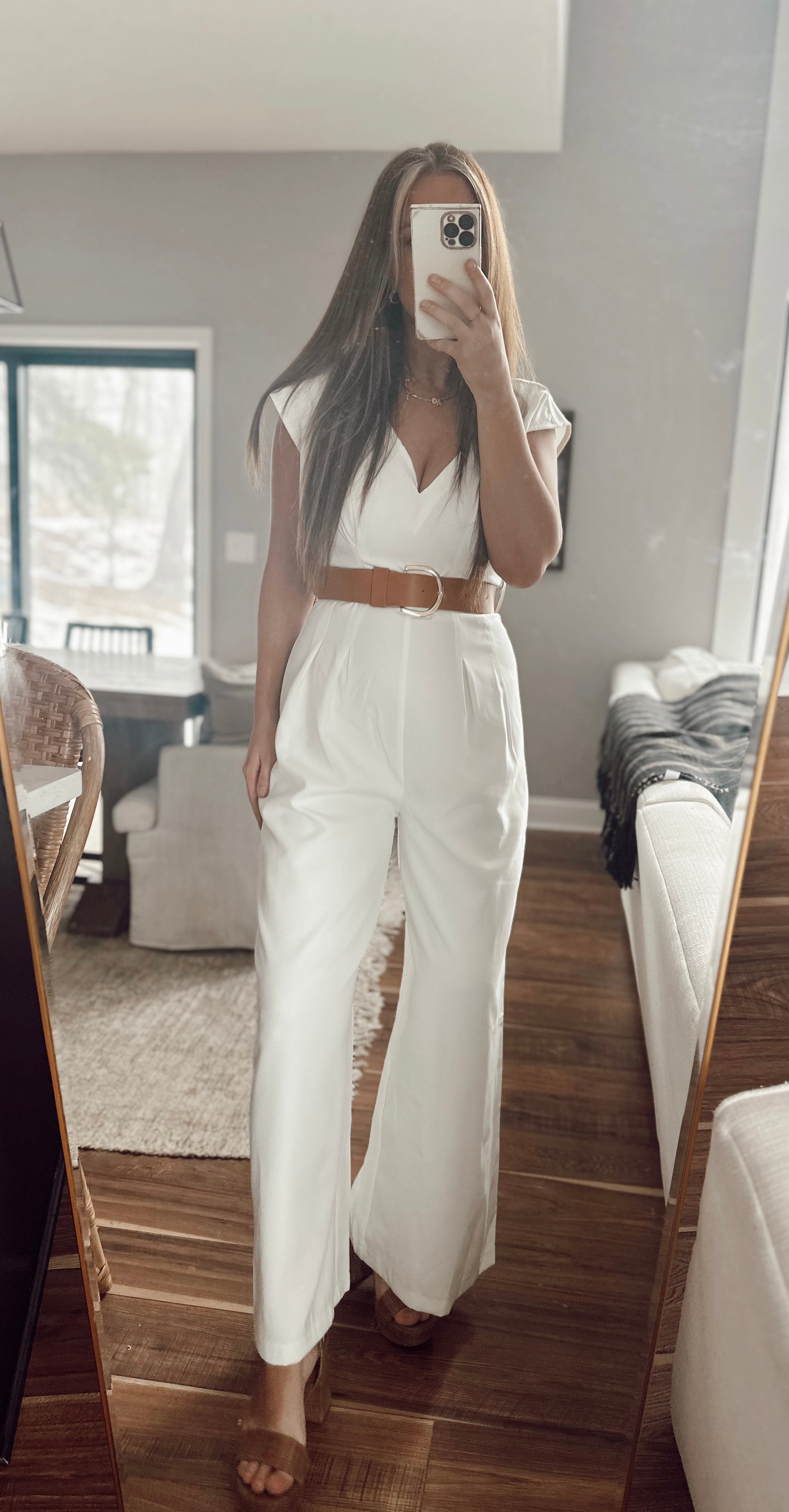 Such a flattering jumpsuit! True fit - no stretch. Zips up the back to get in. Belt included! I’m 5’7 for height reference.