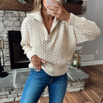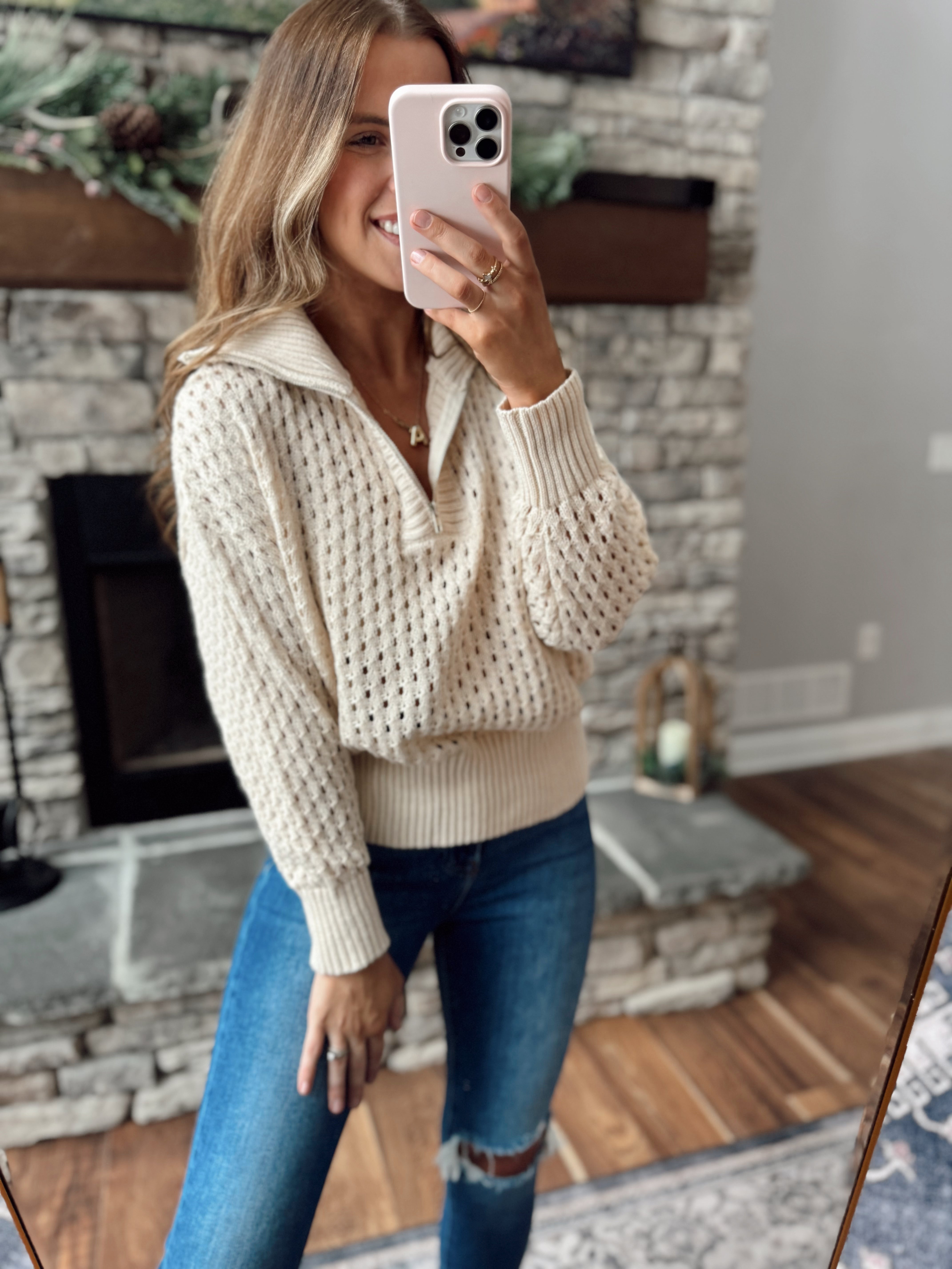It Ain't So Ecru Crochet Knit Collared Zip Up Pullover