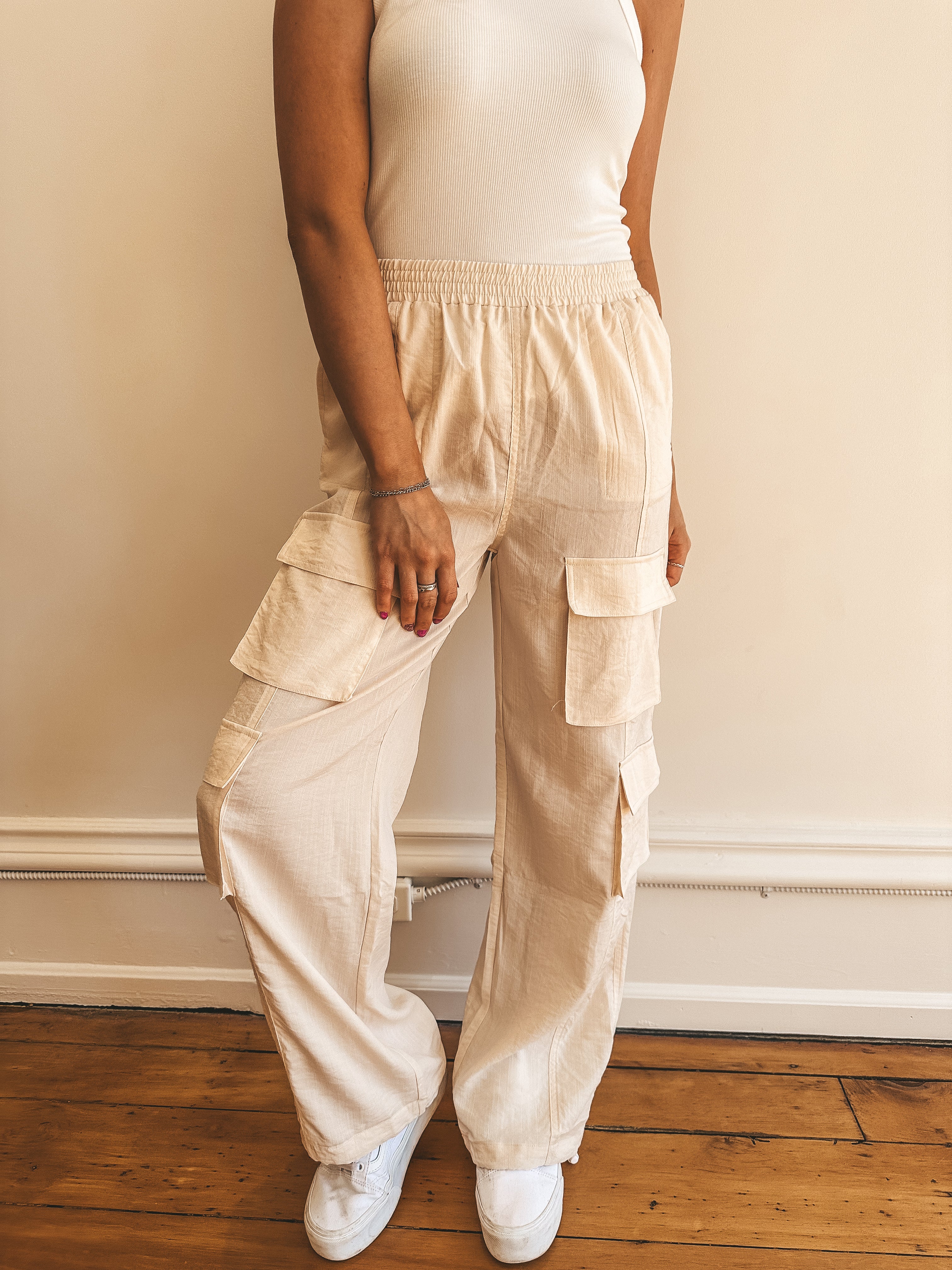 these pants are everything! Super lightweight - you can cinch the bottom for a jogger look. Relaxed fit - elastic waist. Jenna is 5’4, size 26 and in the small.