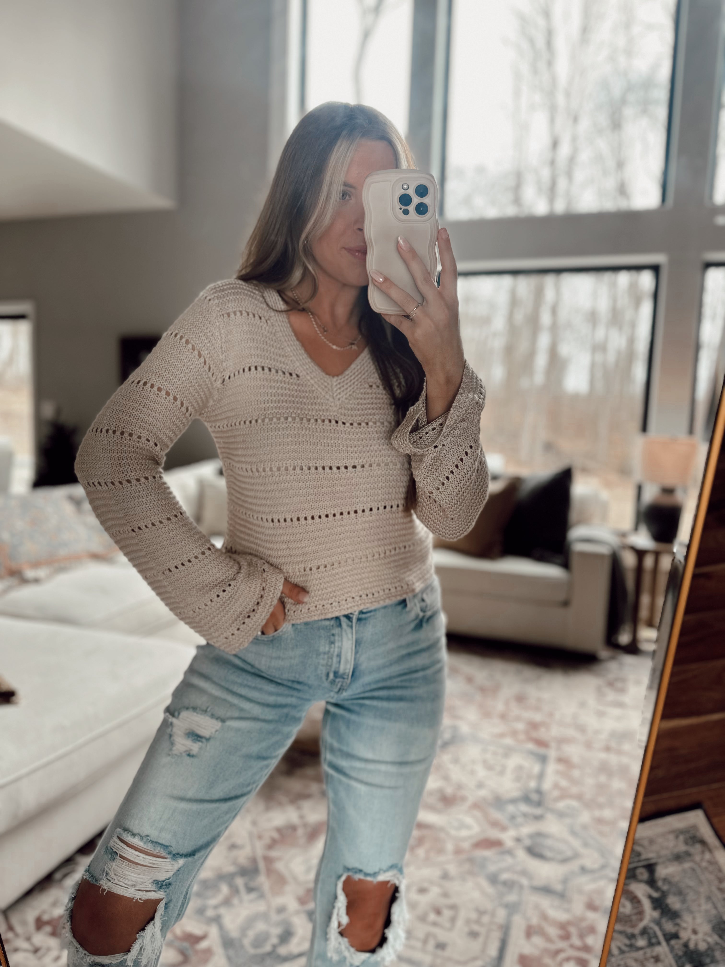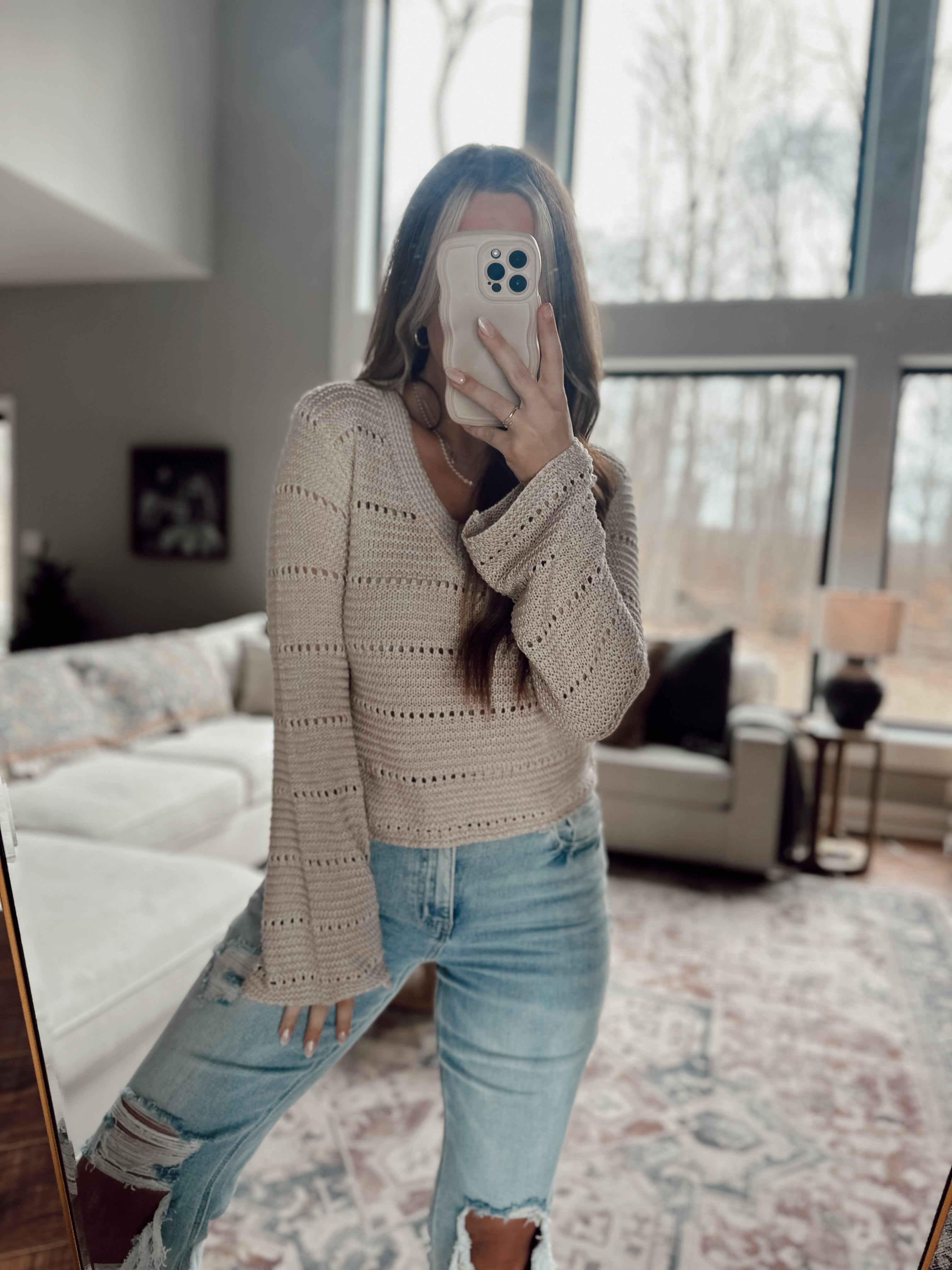 Gorgeous sweater to throw over your maxis or maybe just to wear with denim / shorts! Relaxed fit.. not long but I’d say average for