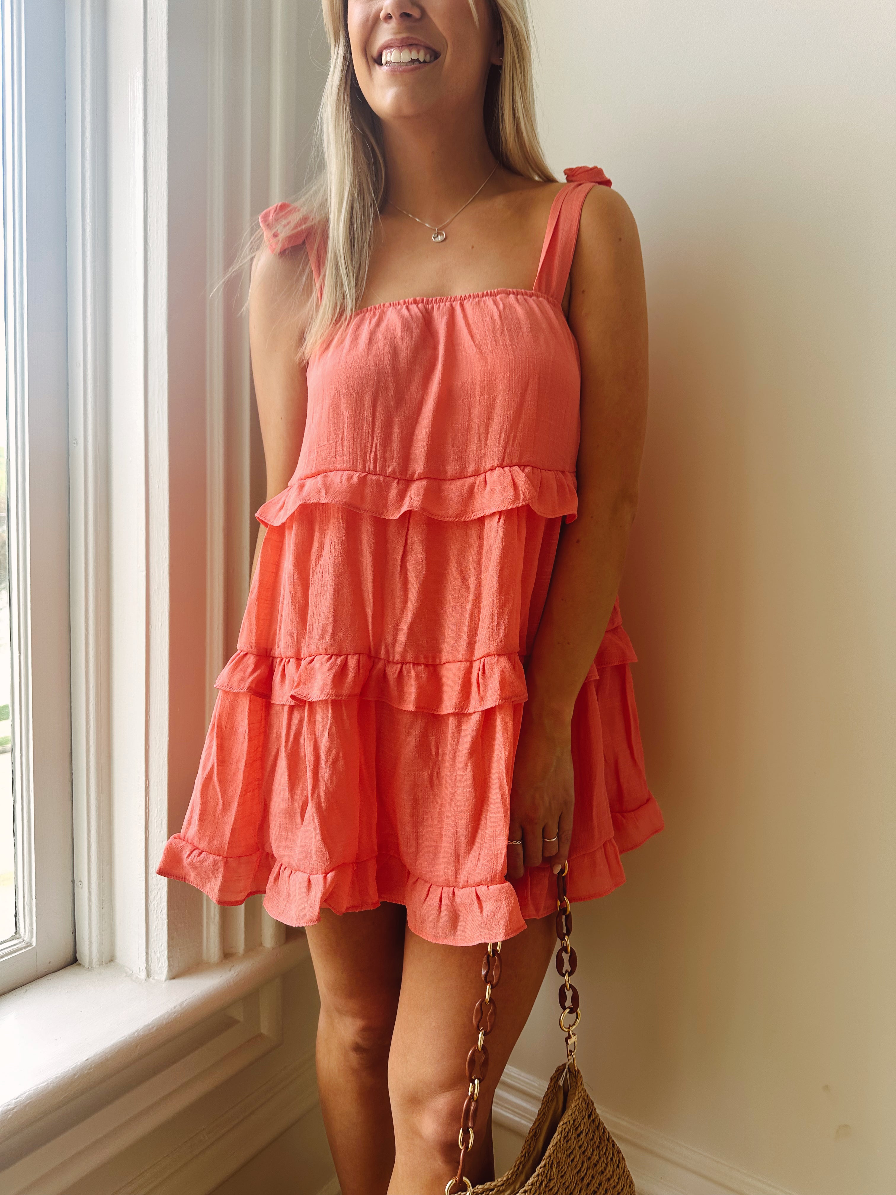 Evelyn Coral Ruffle Shoulder-Tie Mini