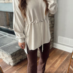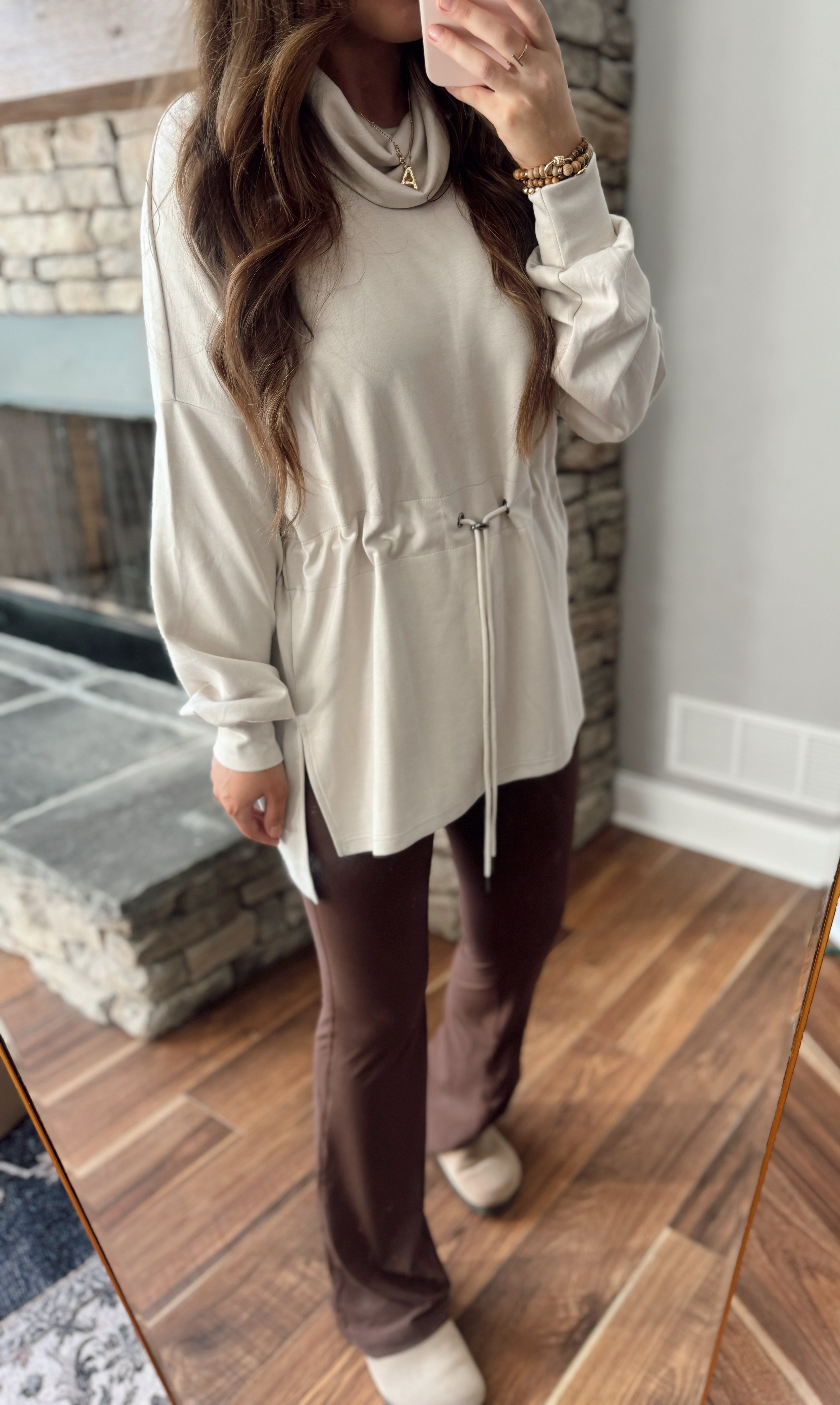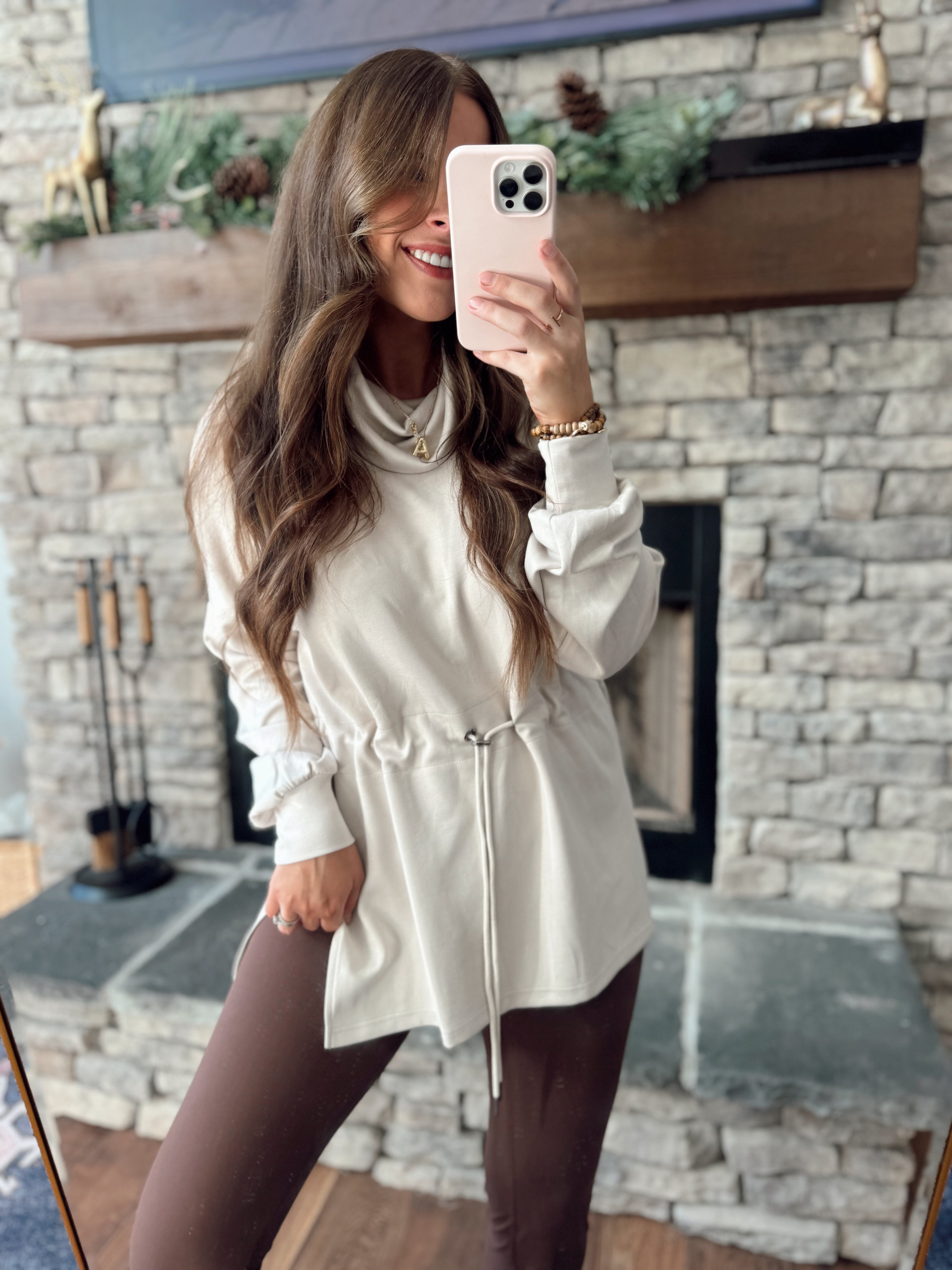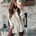 Evelyn Ecru Scuba Turtle Neck Pullover with Drawstring Waist