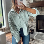 Going West Sage Flower Eyelet Ruffle Pocket Button Down