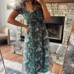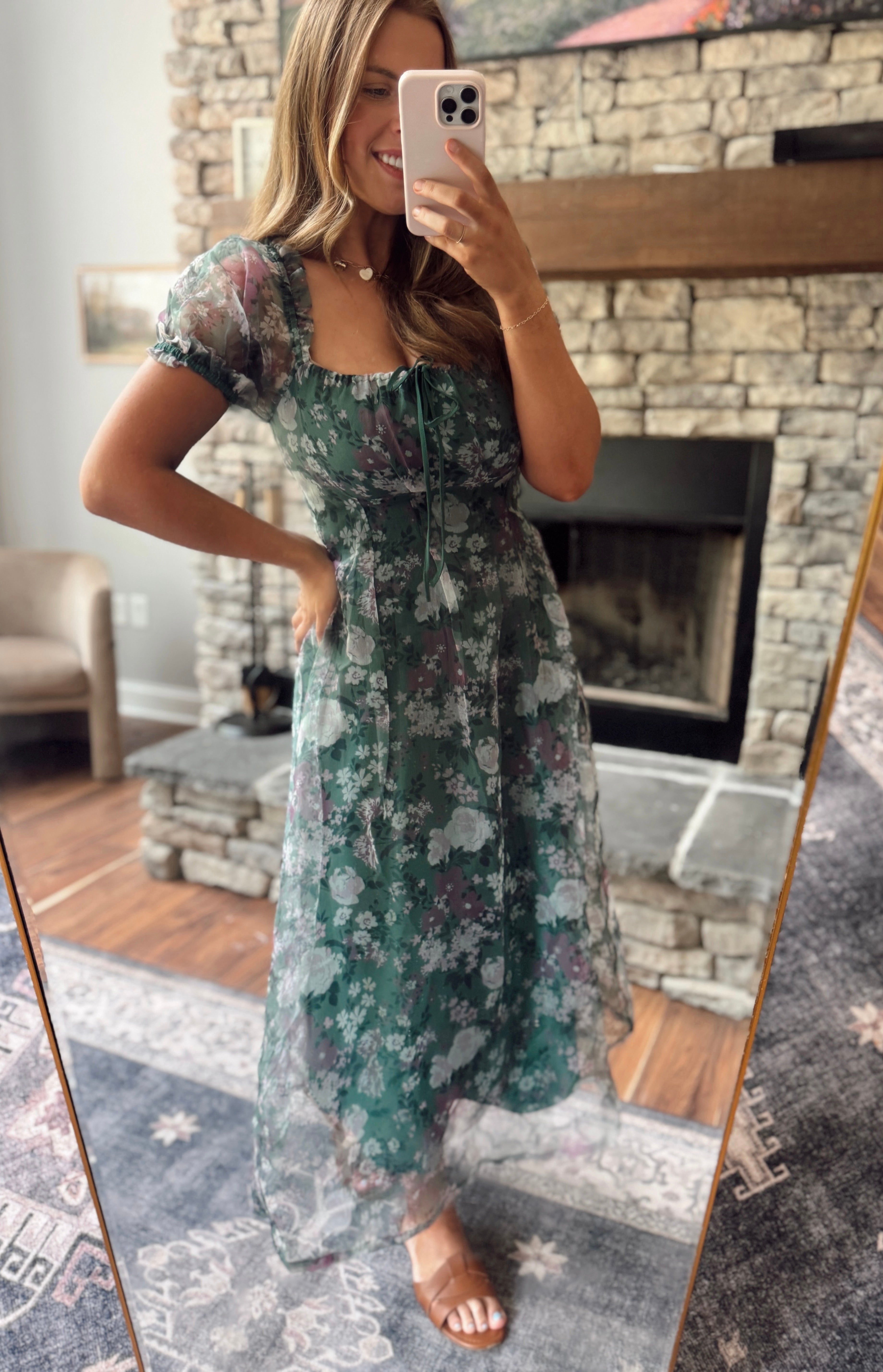 Whimsical, romantic, and effortlessly feminine—this mesh midi dress is made for twirling through flower fields and sipping something sweet on a patio. Featuring a flattering empire waist, puff sleeves, and a sheer overlay in a lush green floral print, this piece feels like a fairytale come to life.