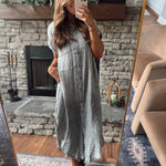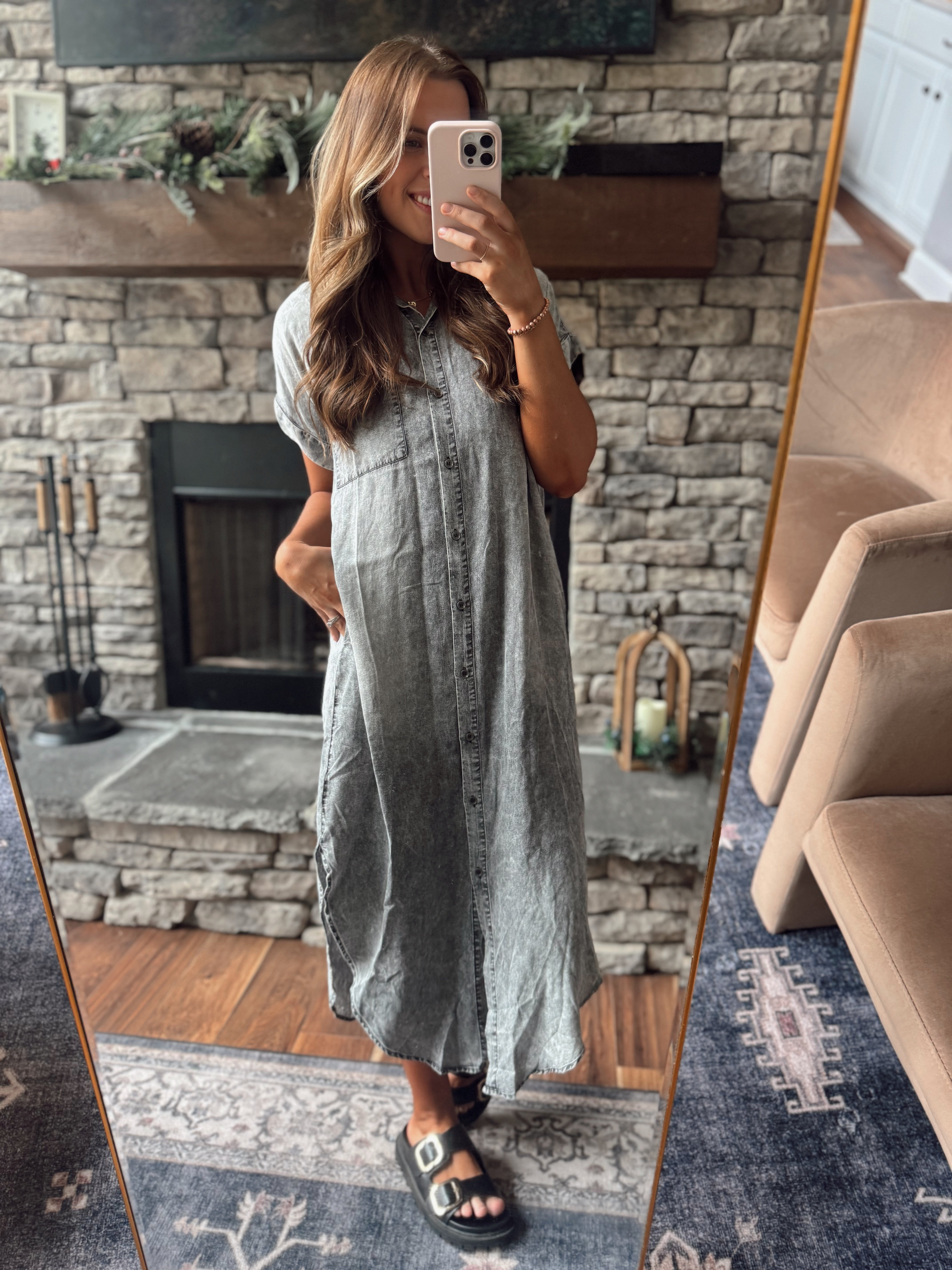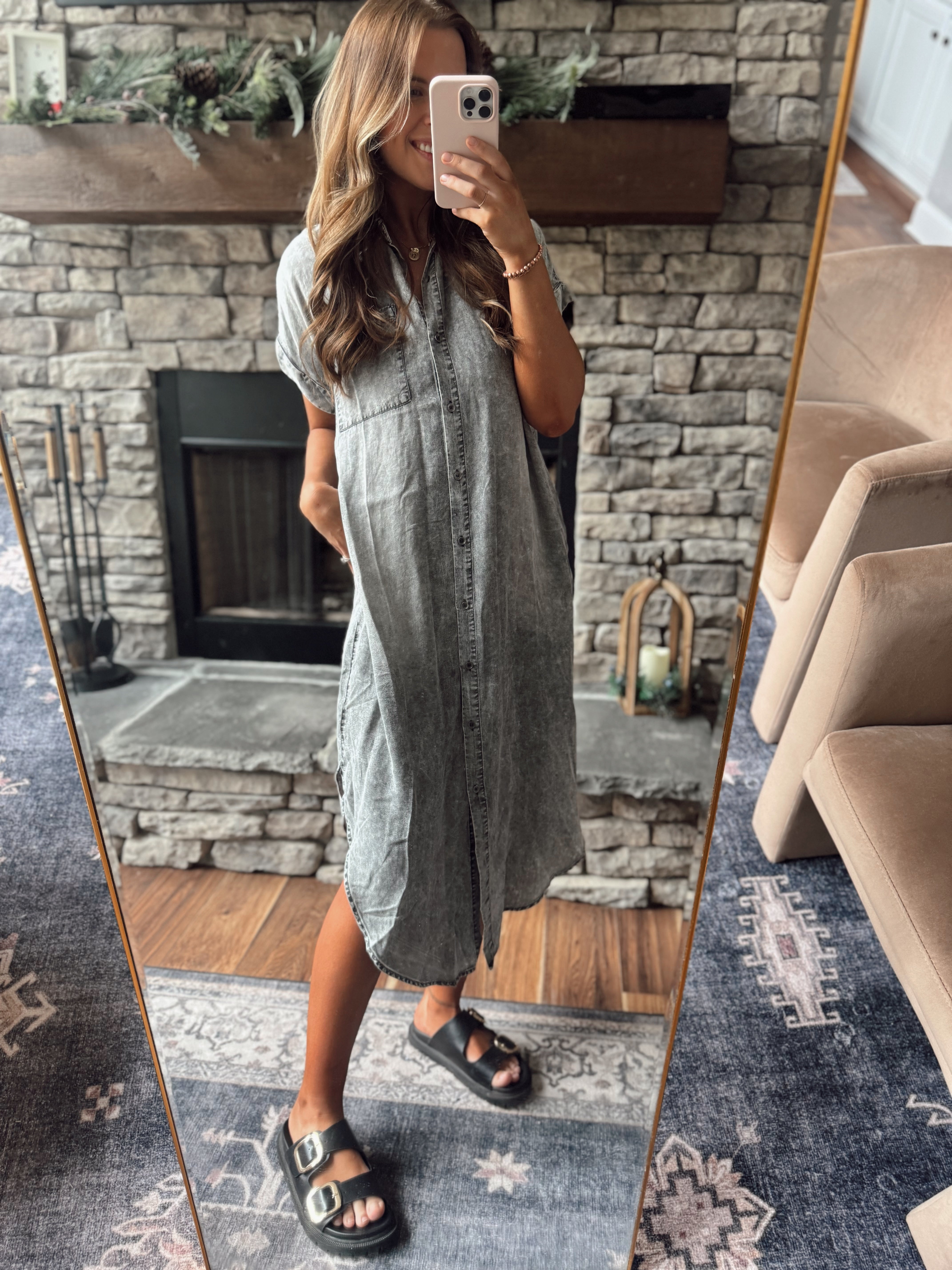 Greta Black Denim Mineral-Washed Short Sleeve Midi Dress