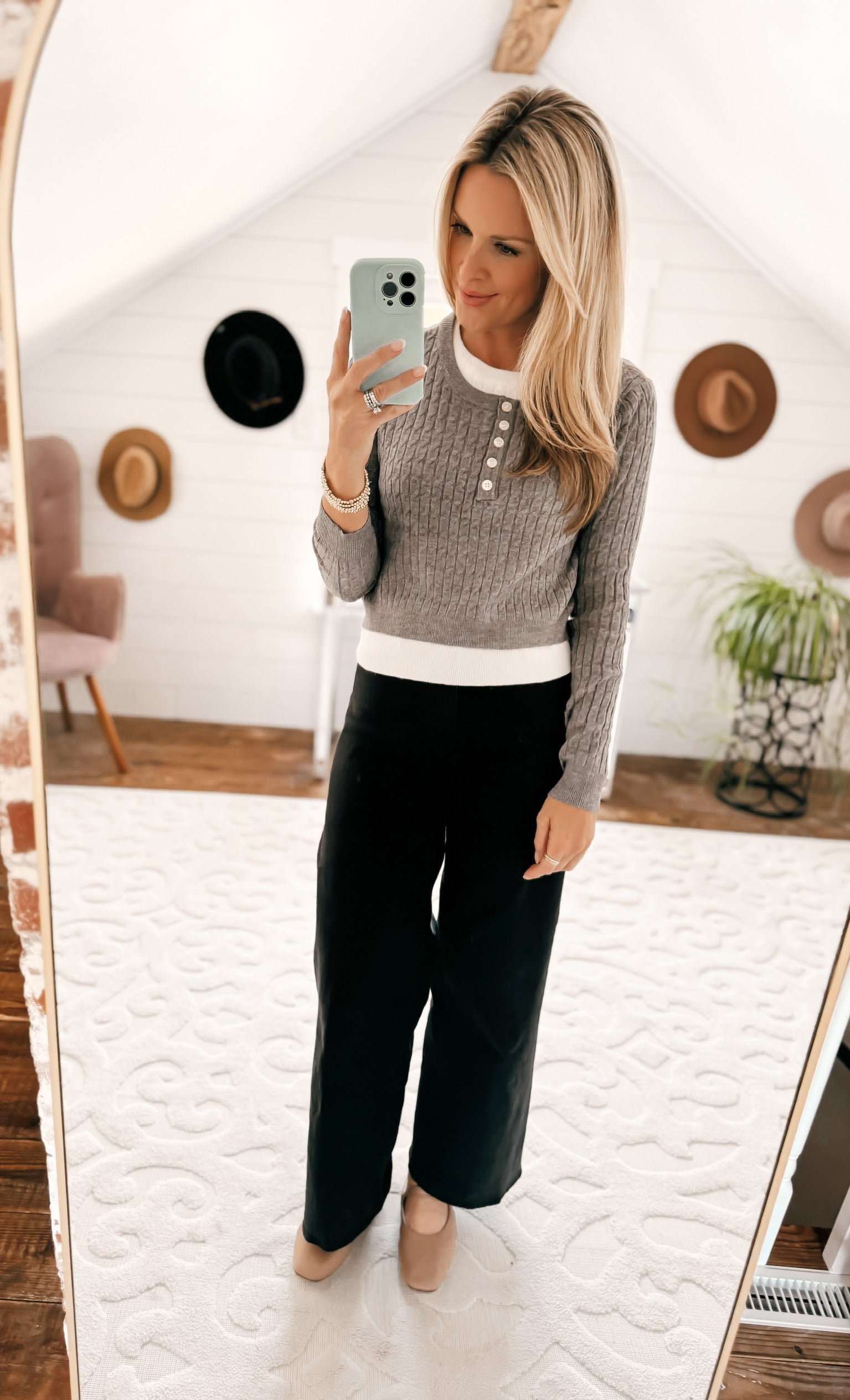 Grey Smarty Pants Cable Knit Henley layered Sweater