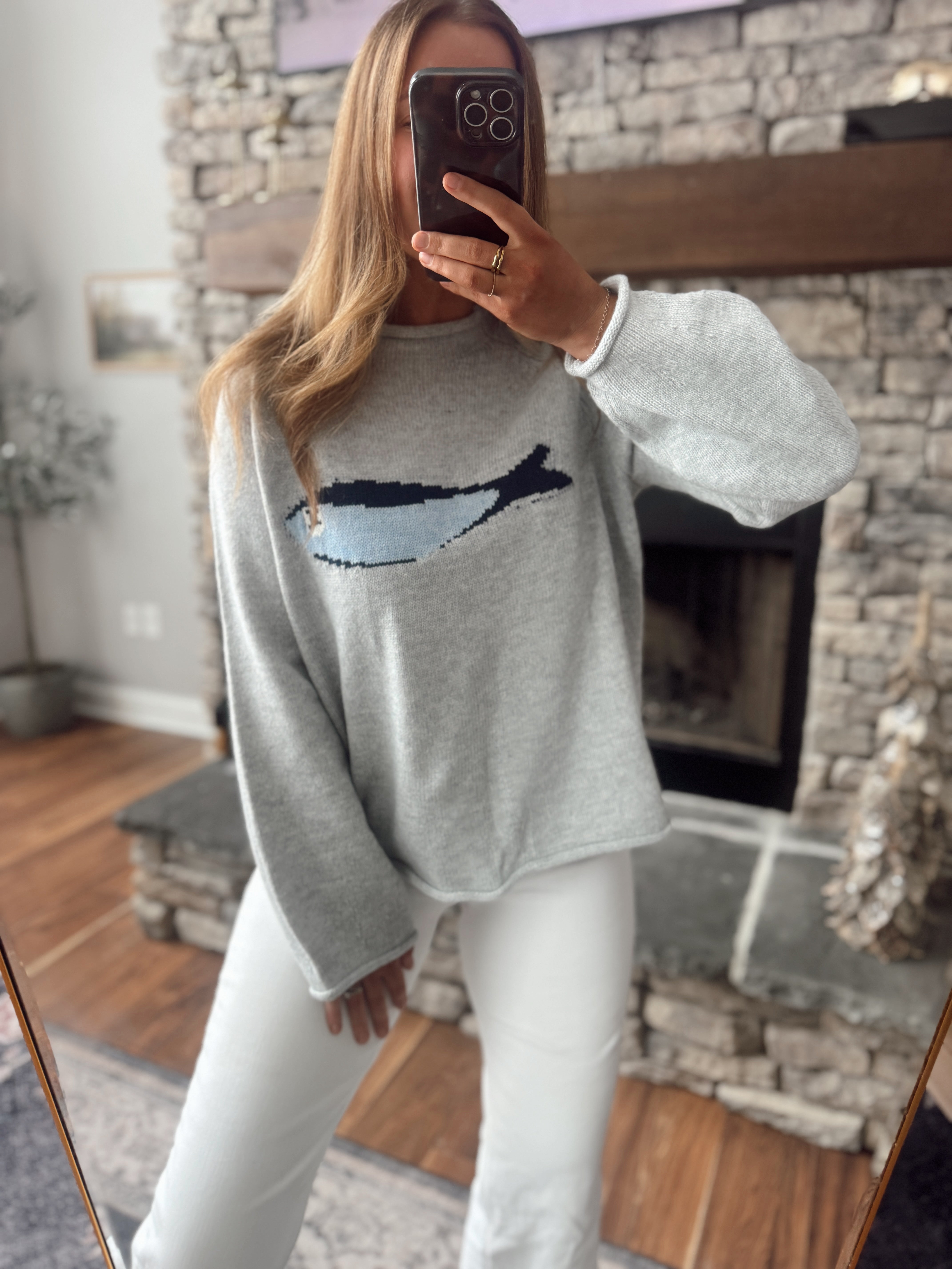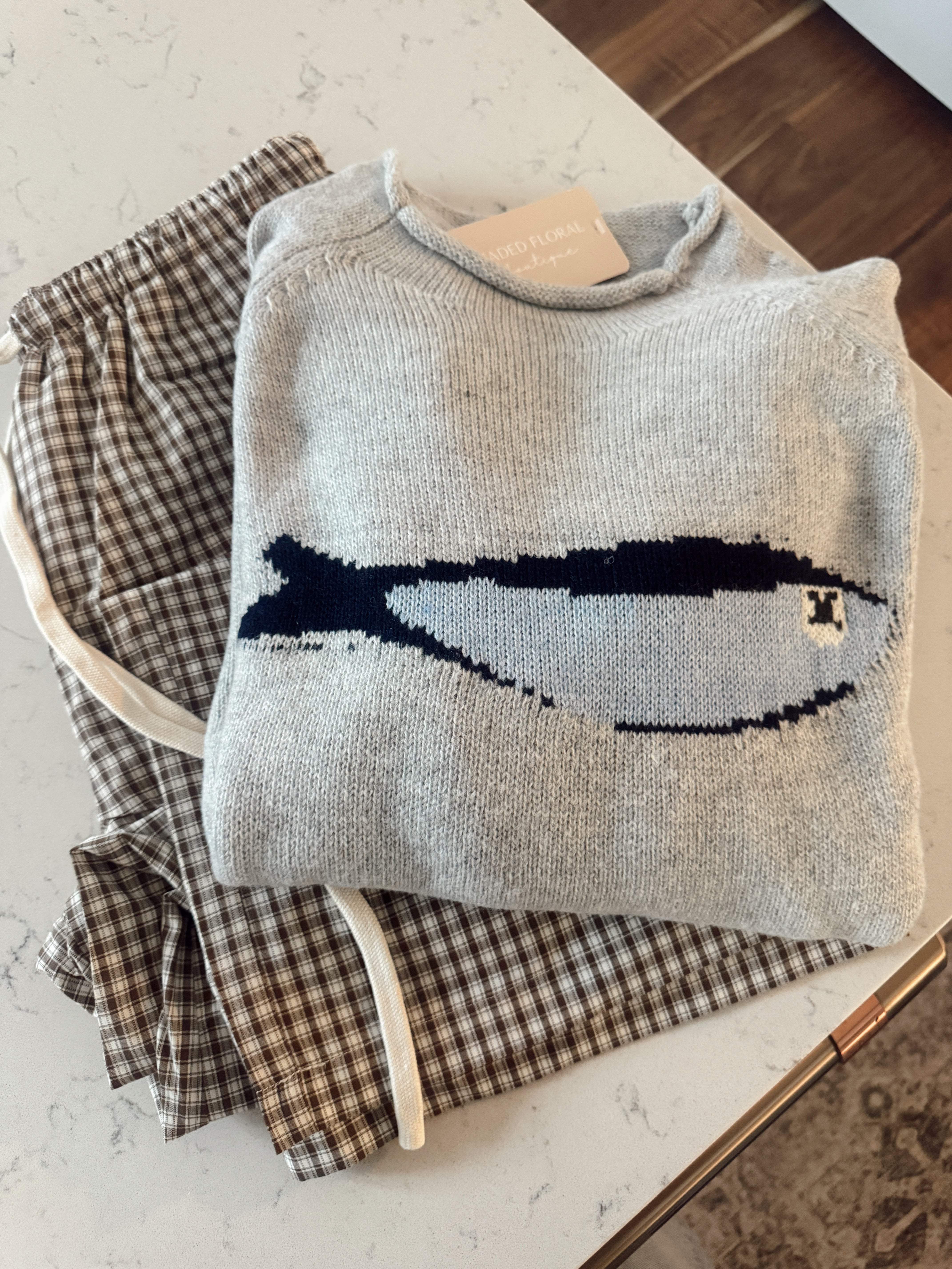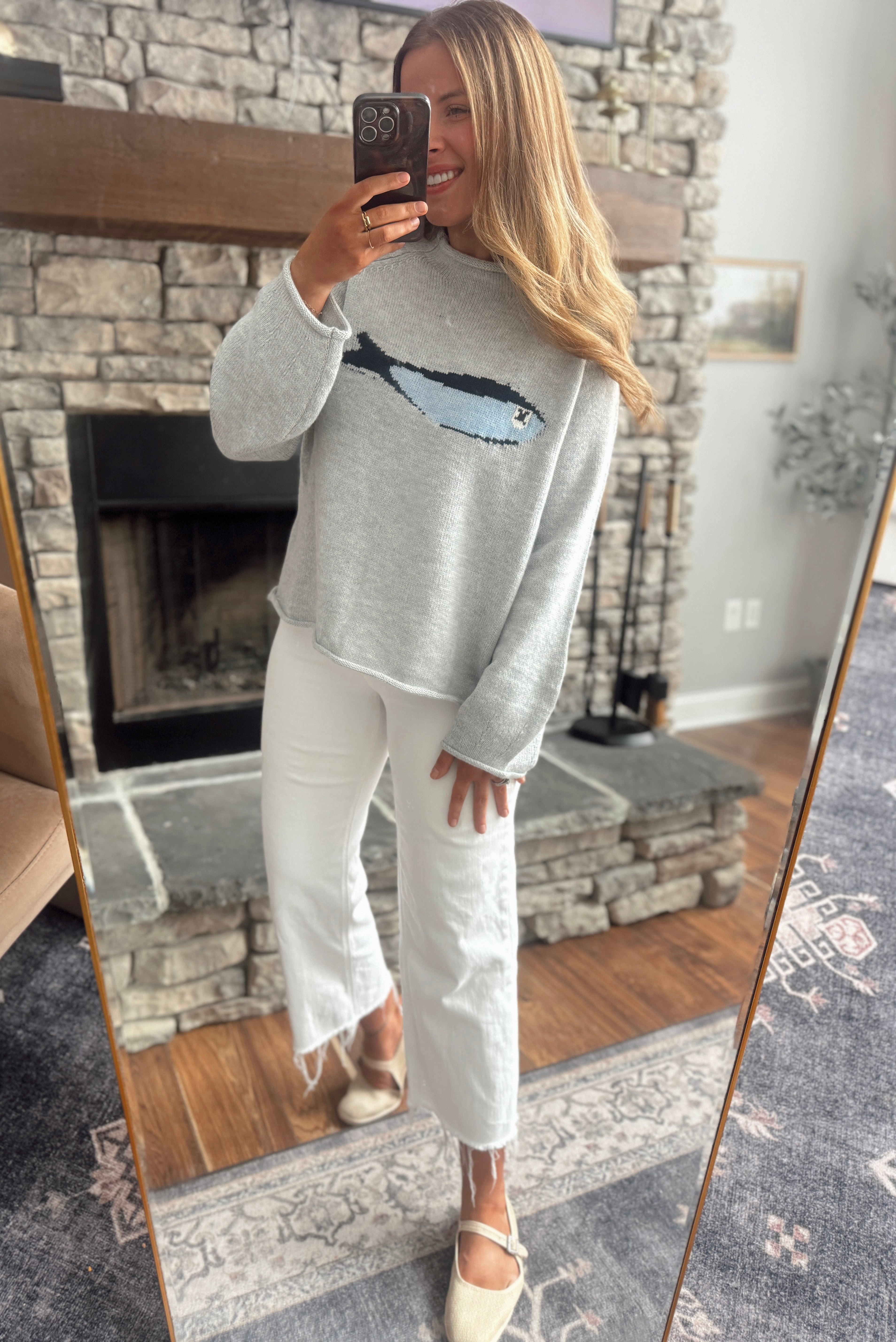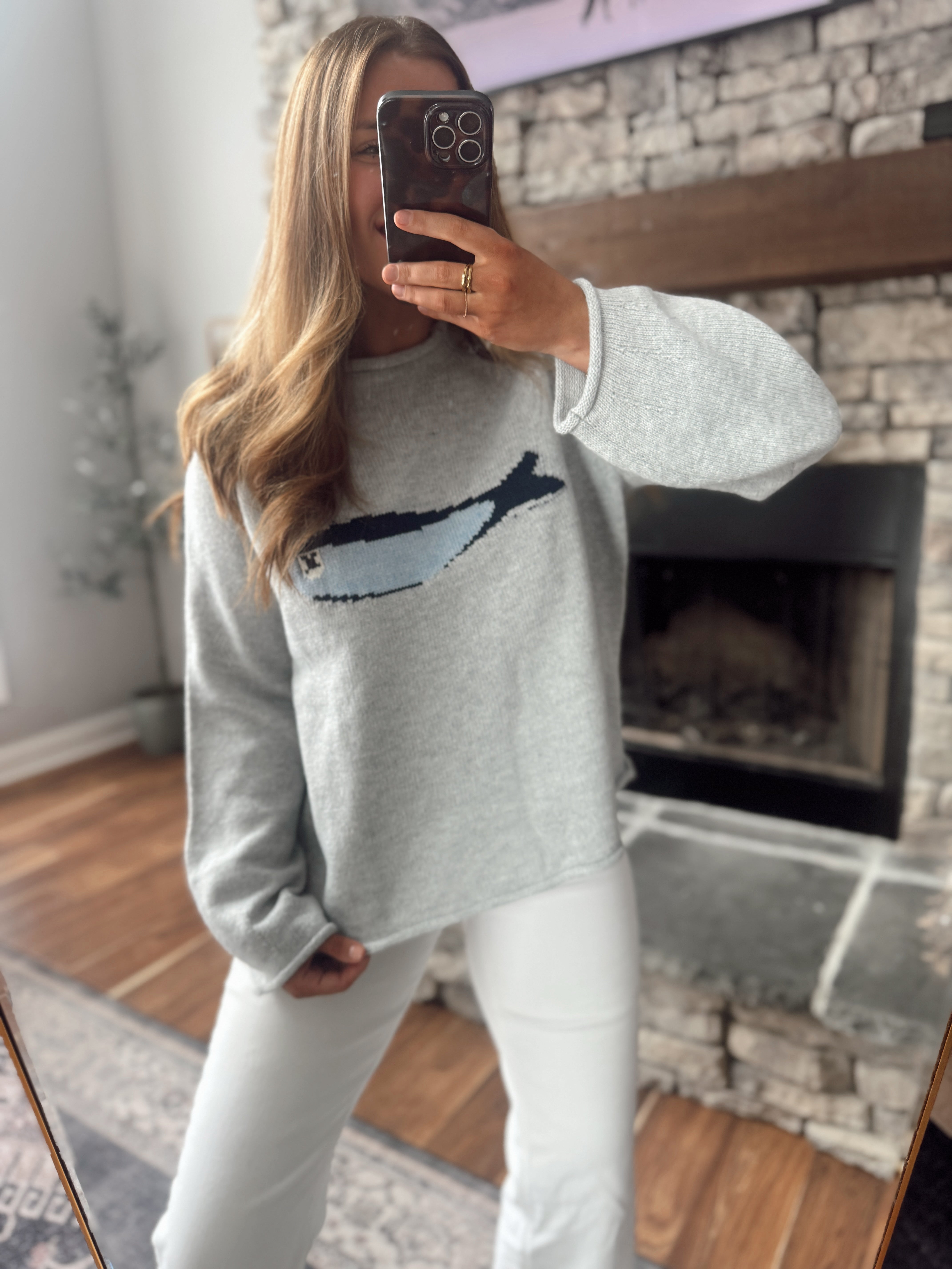 Easy, elevated, and effortlessly cool. This relaxed-fit knit sweater features a soft heather gray base with a playful sardine graphic across the chest for a subtle coastal vibe. Designed with a lightweight knit feel, relaxed sleeves, and an easy everyday length that pairs seamlessly with denim.