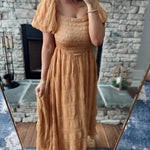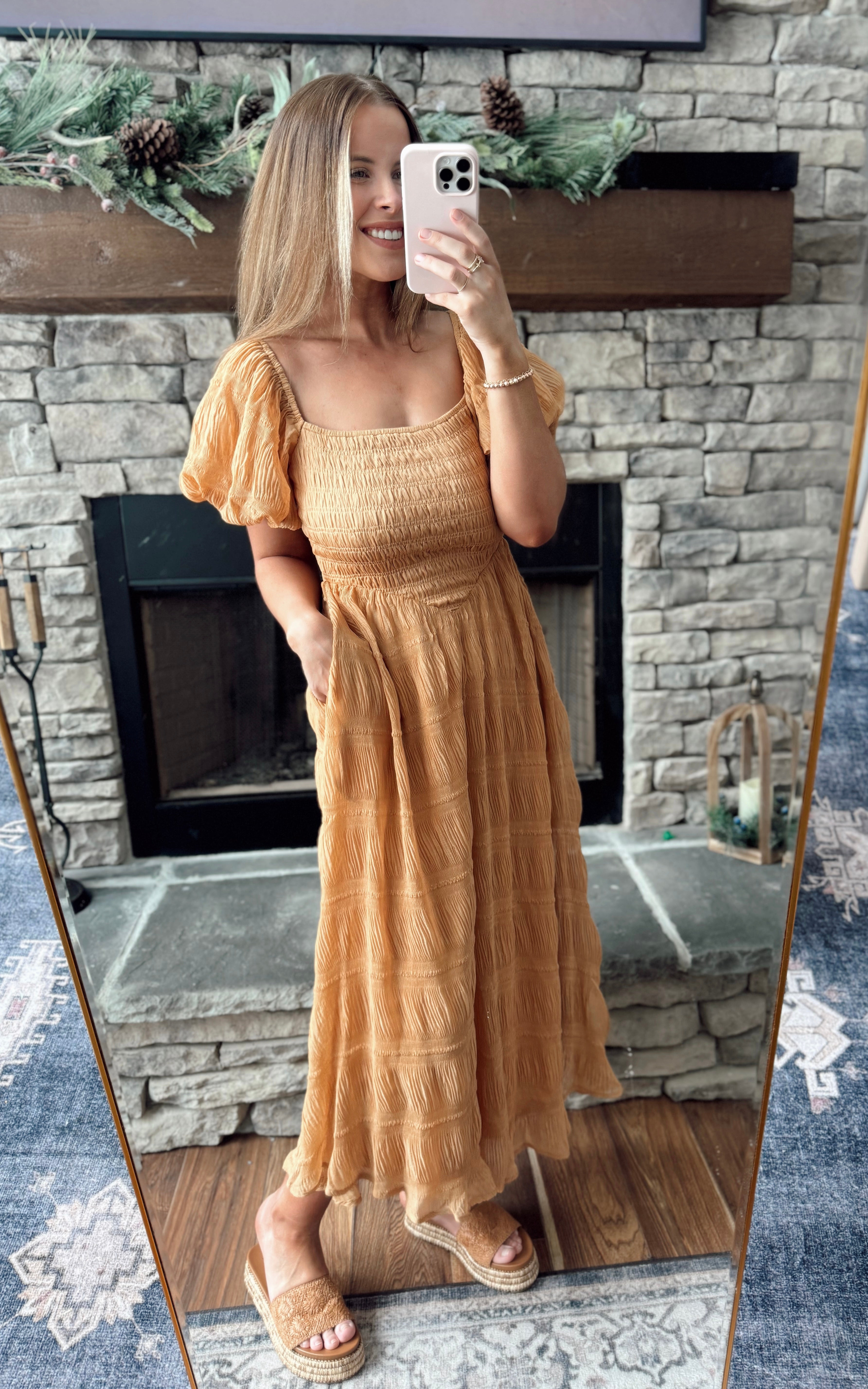 Heavenly Energy Ginger Square Neck Smocked Pleated Maxi