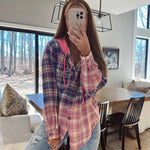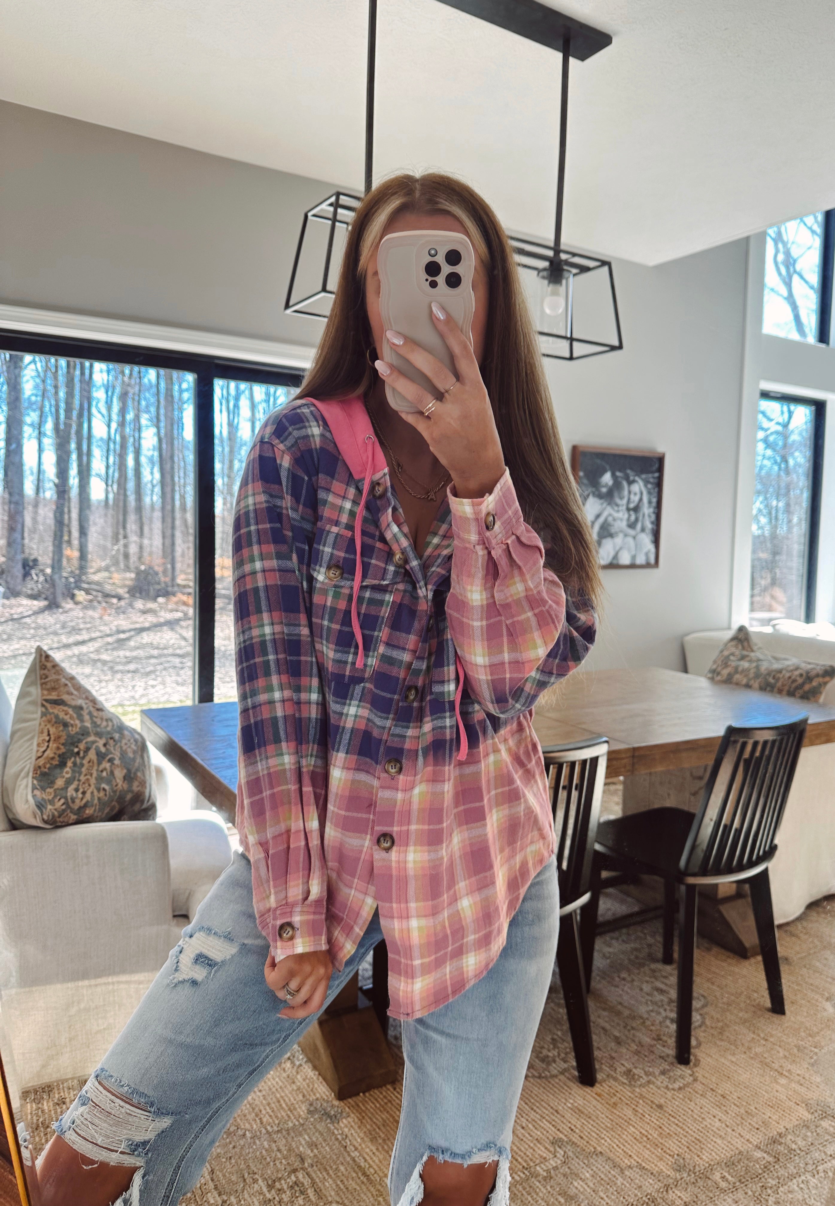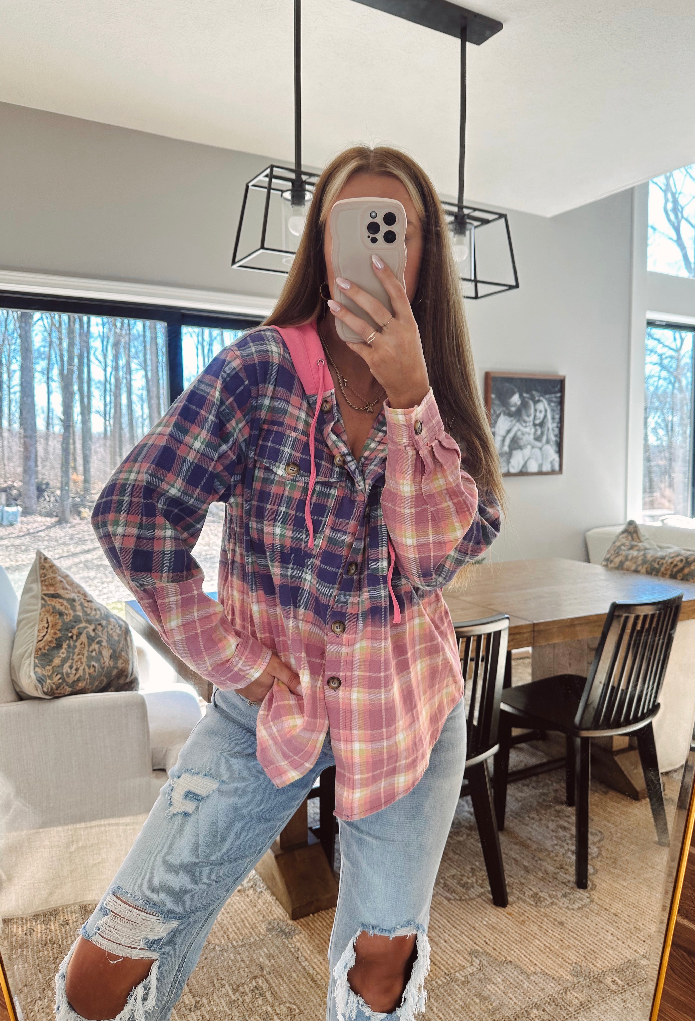 Heightened Vibes Deep Purple Plaid Hooded Button-Up