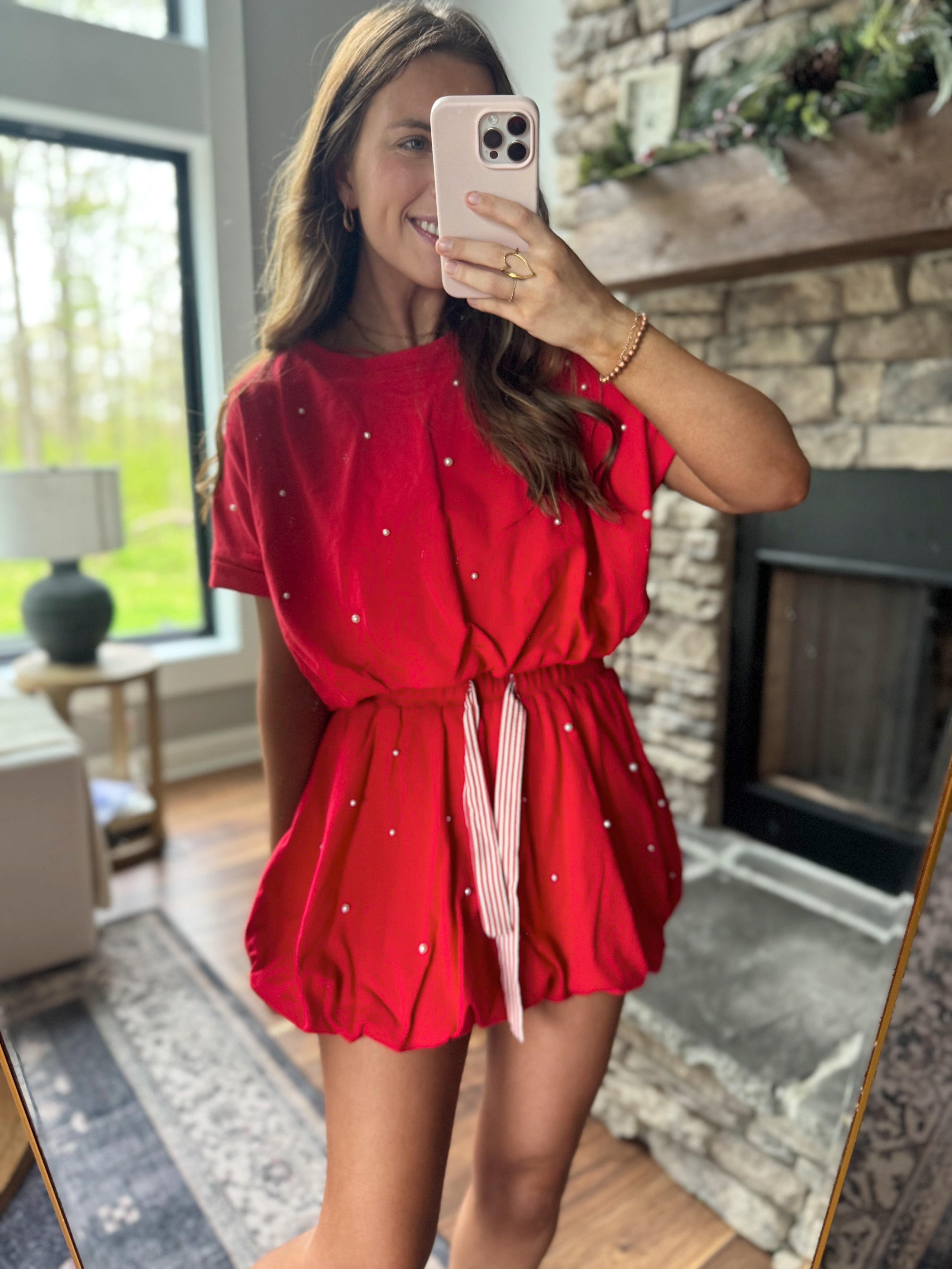 Hot Stuff Red Cotton Terry Pearl Studded Cropped Bubble Hem Top