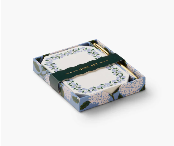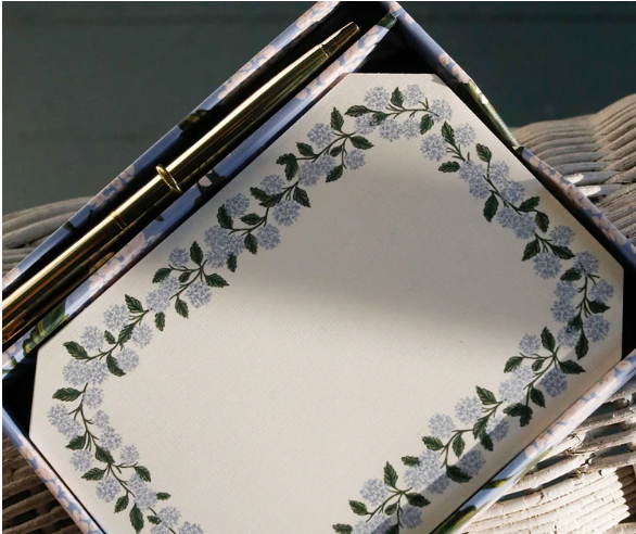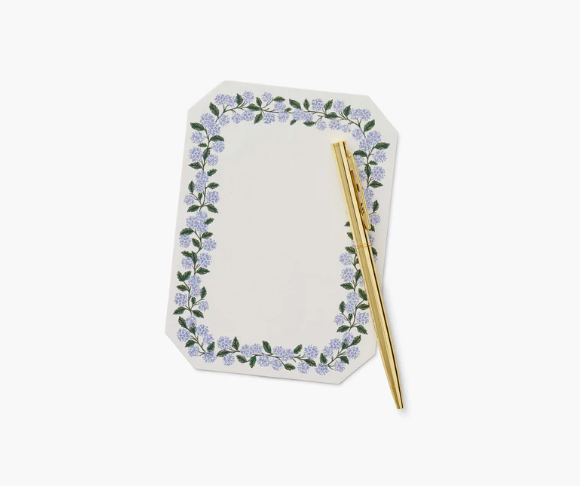 Jot down your reminders or leave a note for someone special. Organized in a pretty desktop box, this note writing set includes 130 flat notes with Hydrangea illustrations and a matching gold pen.