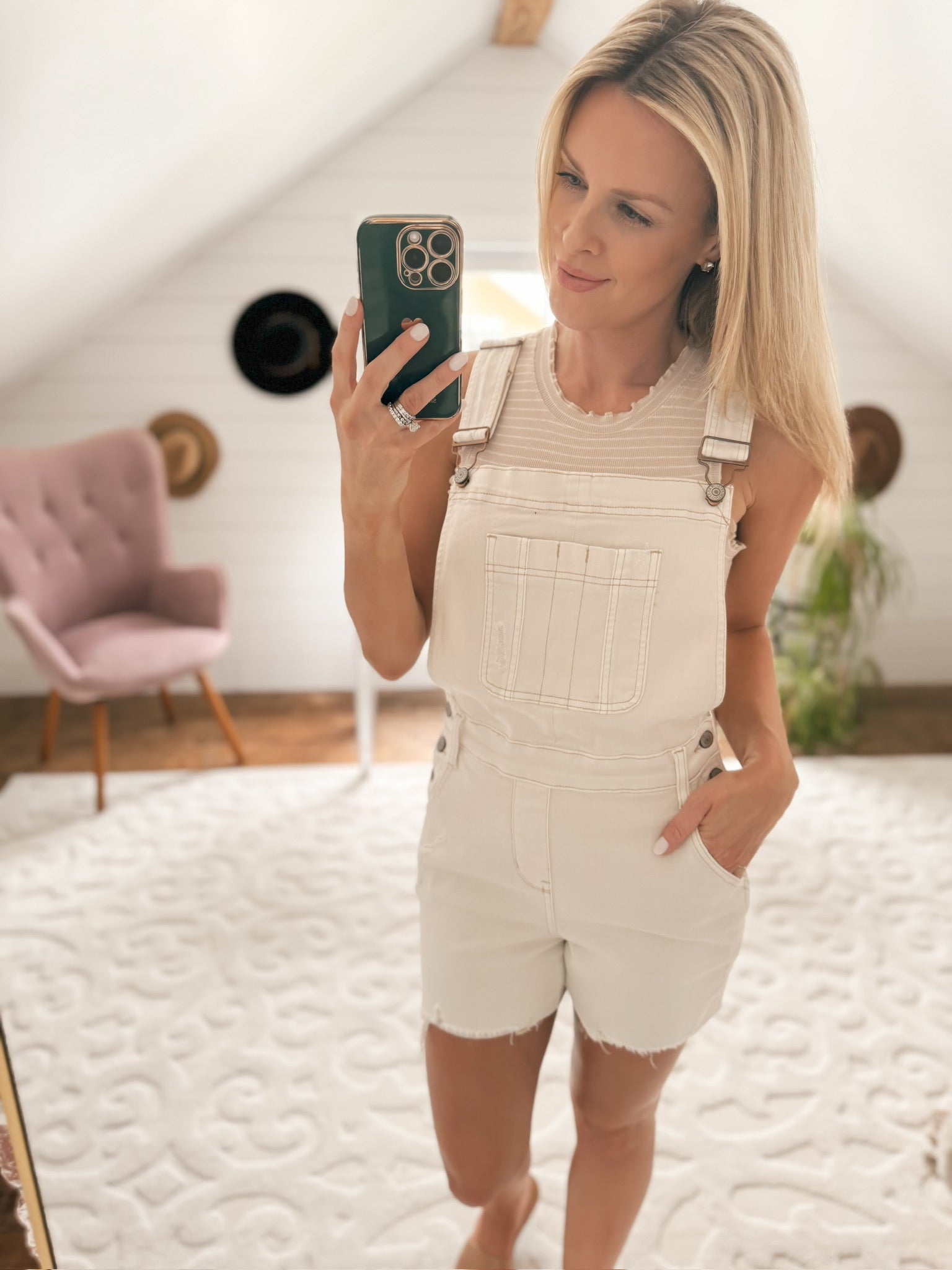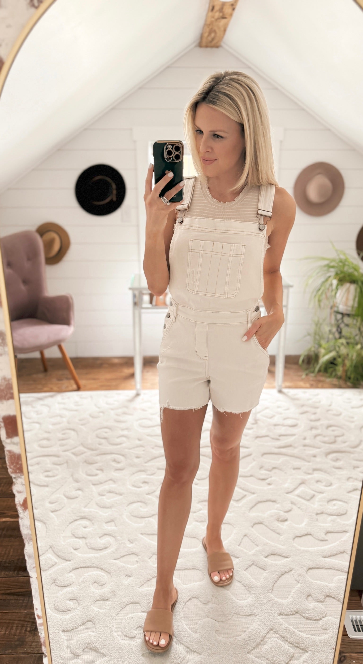 These overall shorts in a trendy ecru color feature a bib front, side buttons, and a raw hem. They also come with adjustable straps for the perfect fit. Stand out with unique fashion - and pockets - in one!