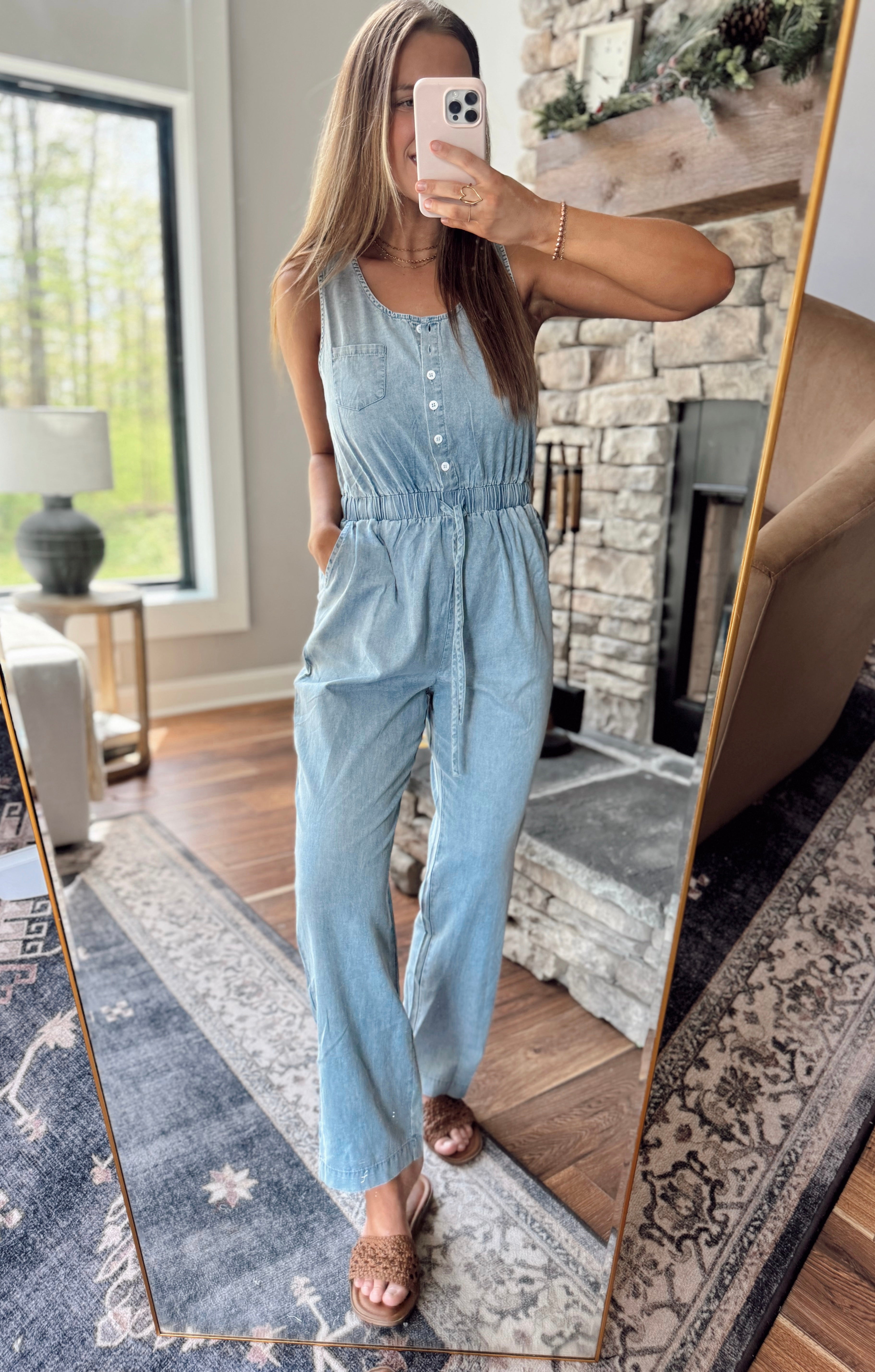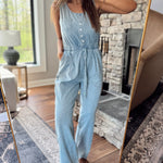 Light Denim Sleeveless Drawstring Waist Henley Jumpsuit