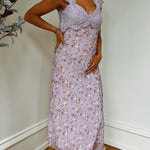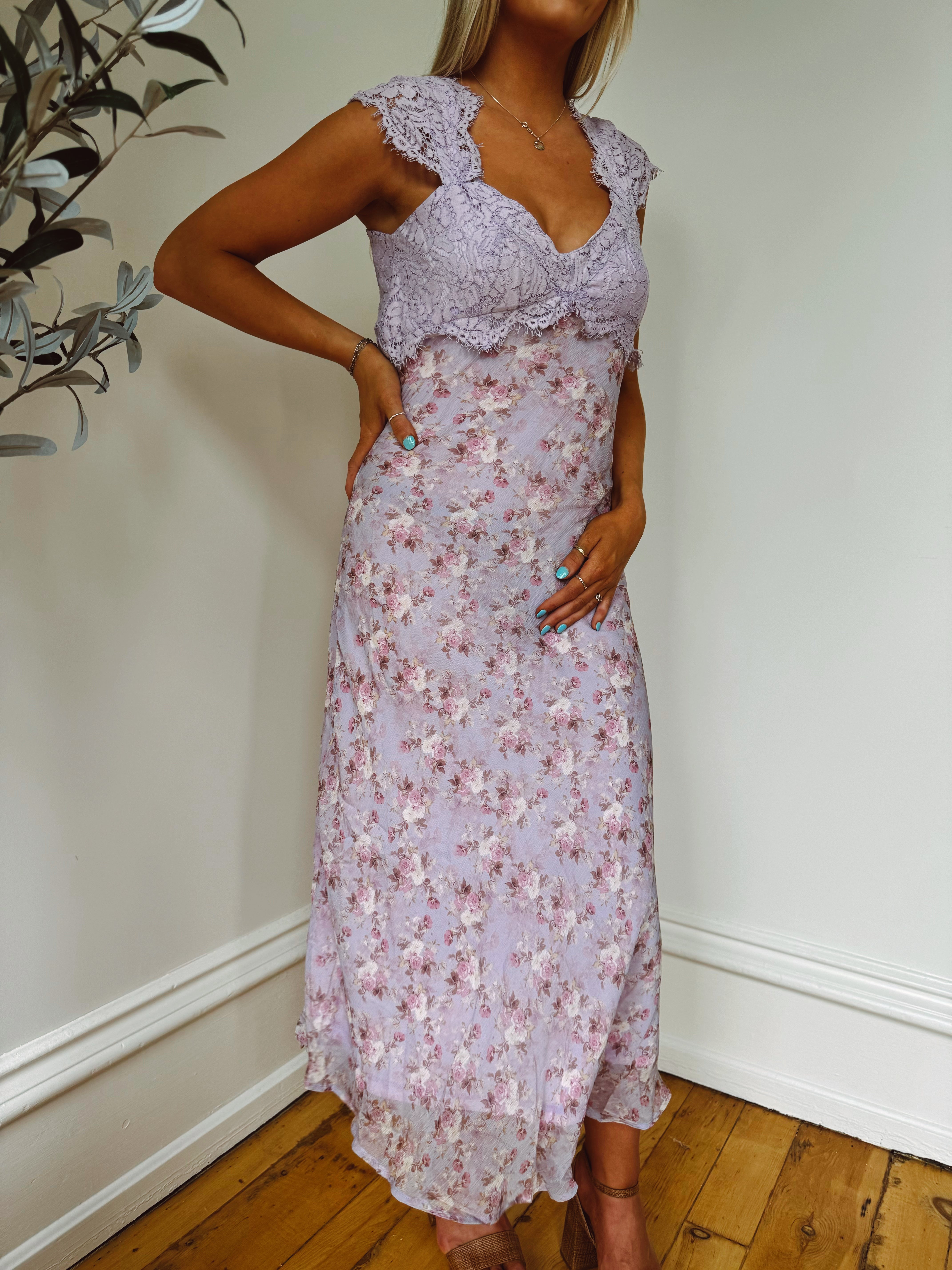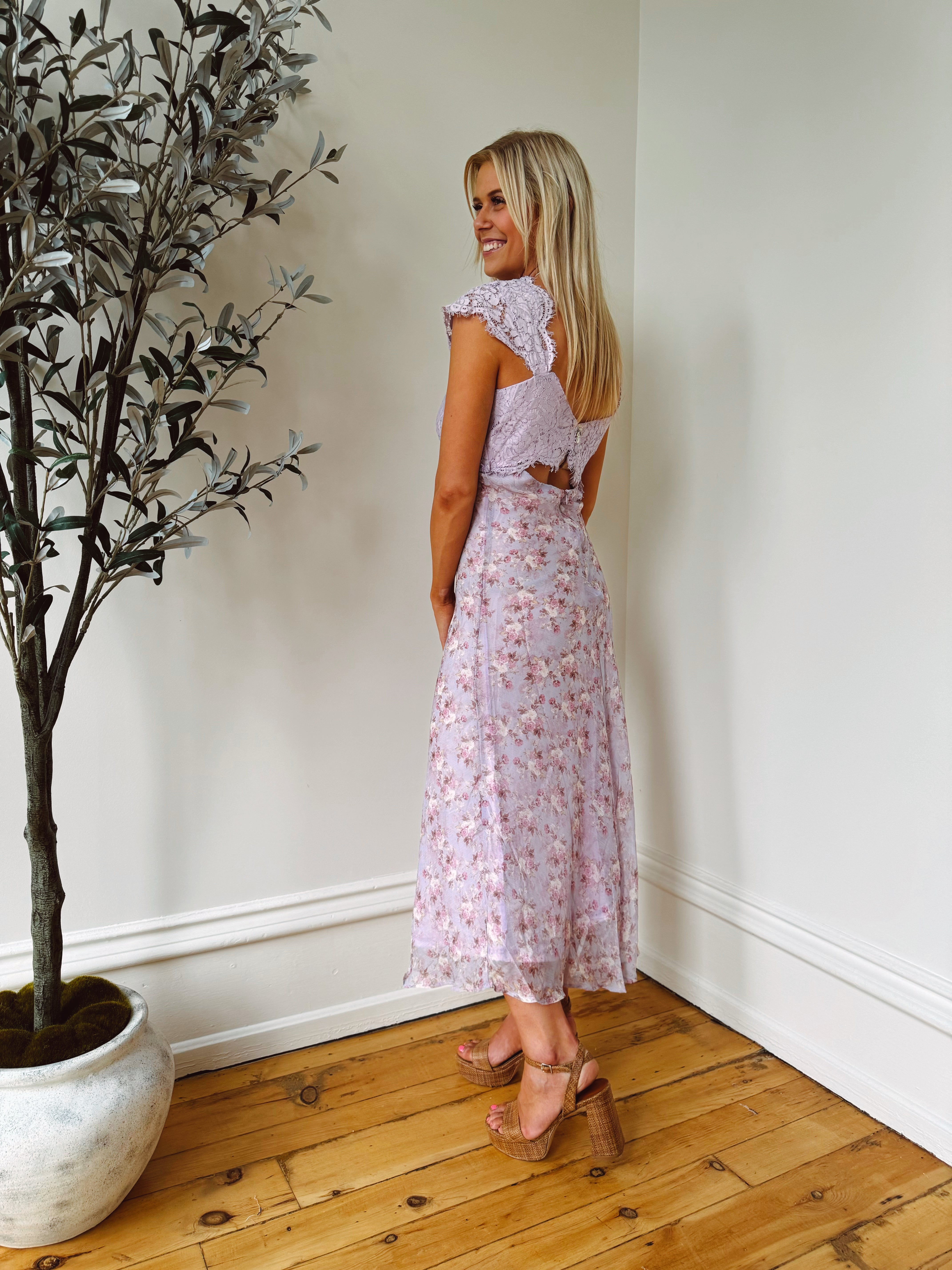 Stunning lace detail, color and floral design! True fit - very flattering! Jenna is 5’4 and in the small.