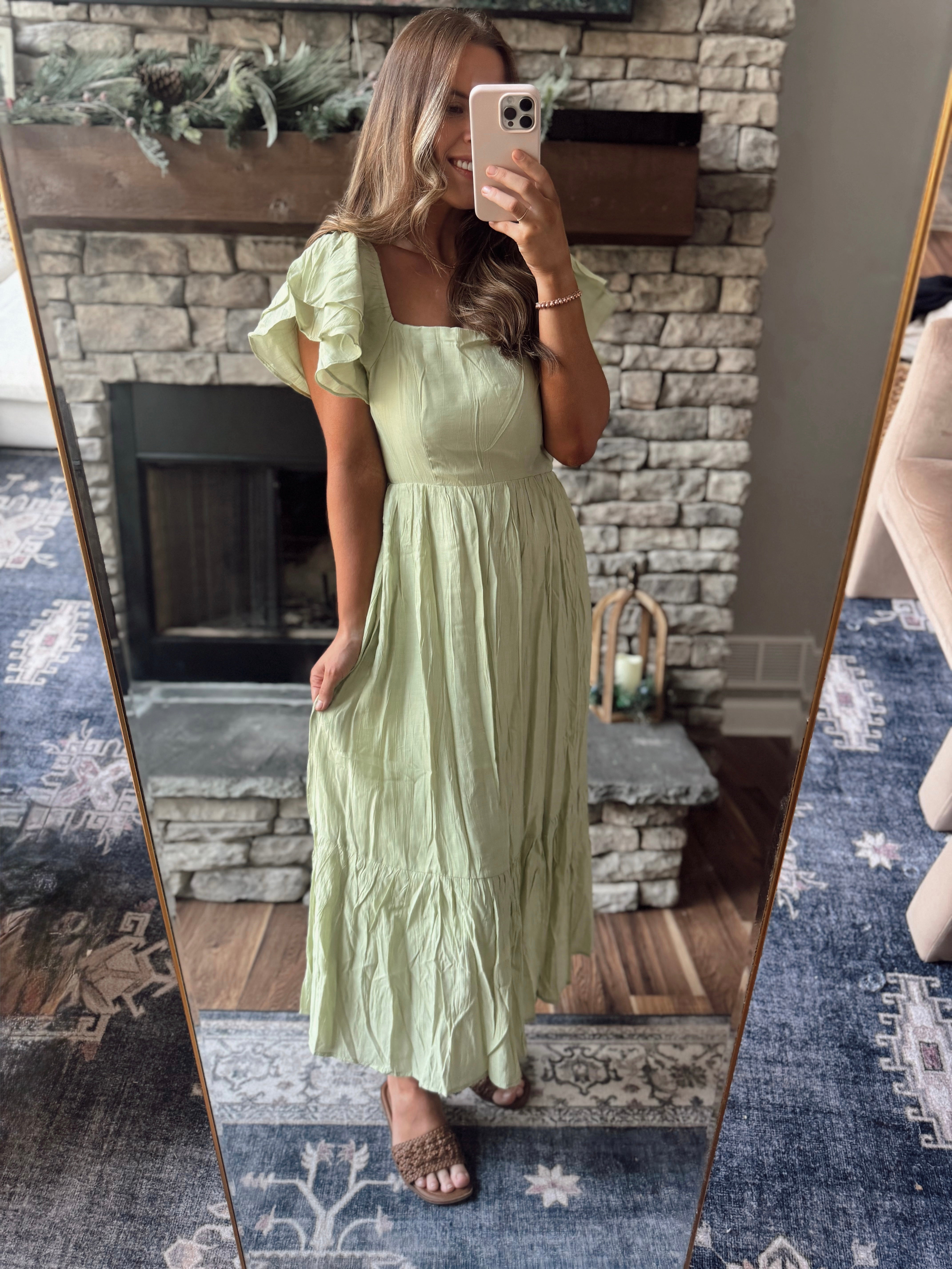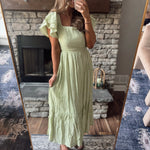 Marais Square Neck Ruffled Front Short Sleeve Midi